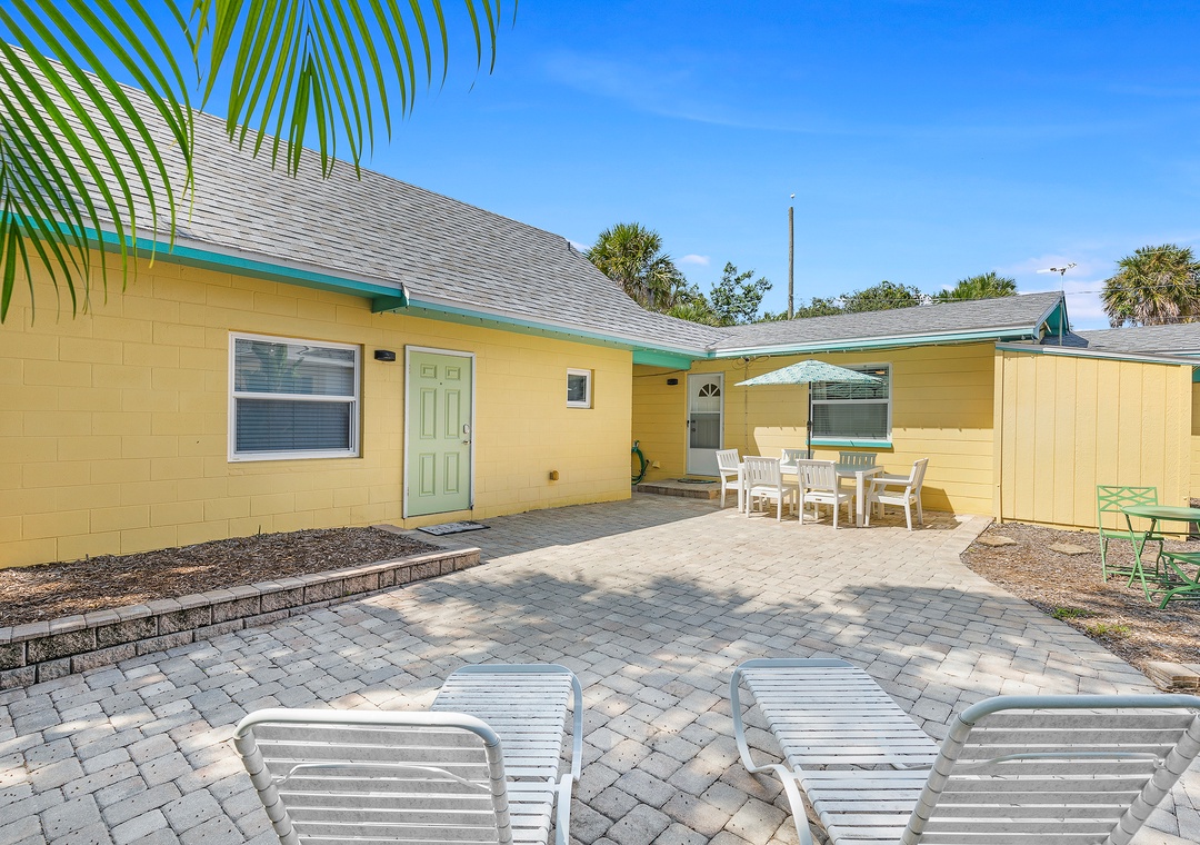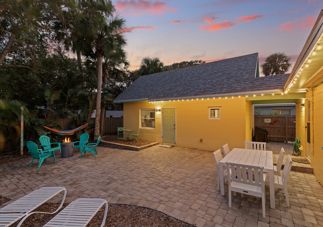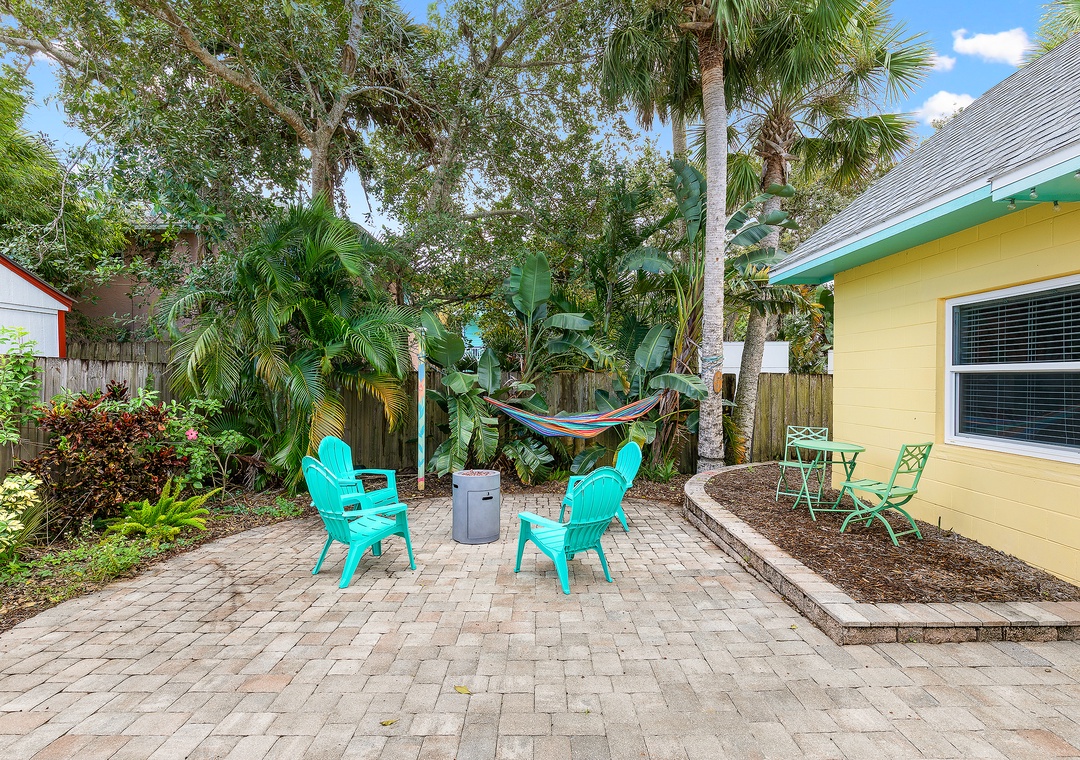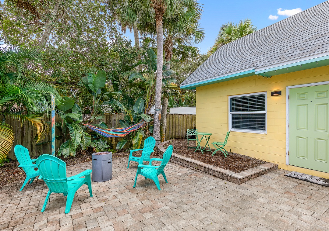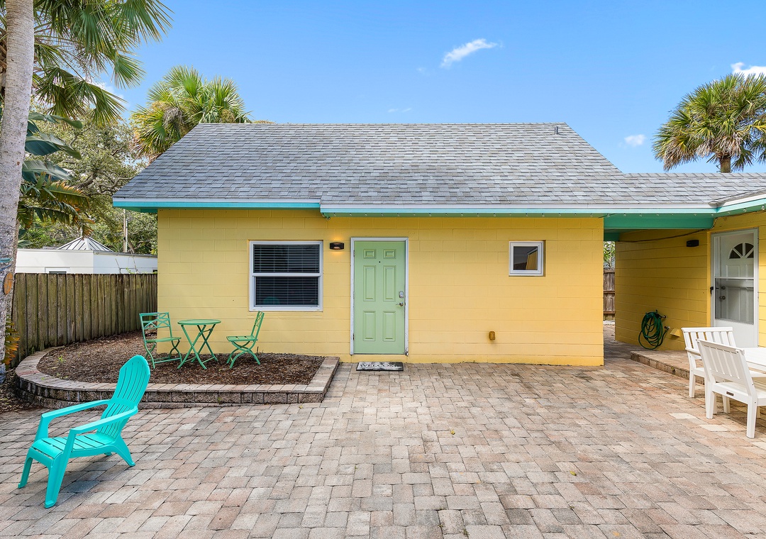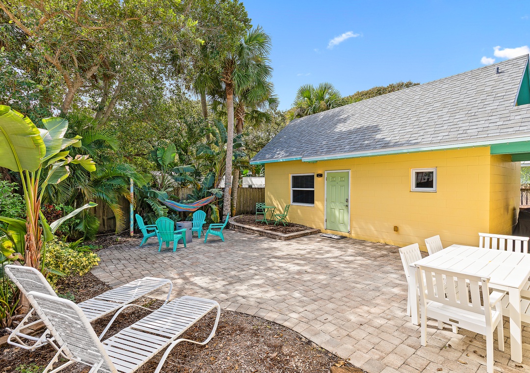 As part of Casa del Limone, tucked behind the main house, the guest studio rented separately is Paradiso dei Limoni, a charming private retreat in the heart of New Smyrna Beach, perfect for monthly rentals. Whether you're a retiree, snowbird, teacher on summer break, or simply someone lucky enough to take an extended vacation, this dreamy little retreat invites you to slow down and stay awhile. Located in a safe, laid-back neighborhood, just a short walk to the beach and the nostalgic charm of Flagler Avenue, you’ll find yourself wandering with a snow cone in hand, soaking up the sweet feeling of Old Florida. Inside, the studio is cozy and comfortable — ideal for cooking slow meals, reading a good book, or curling up for a peaceful afternoon nap. This cozy unit features one bedroom, a loft with an additional bed, a kitchenette, and a comfortable sitting area — ideal for morning coffee, quiet reading, or evening unwinding. Thoughtfully designed, the guest house shares access to the beautifully landscaped courtyard-style backyard, complete with string lights, a firepit, hammock, loungers, grill, dining area, outdoor shower completed with bicycles for you to enjoy being fit or being a kid again — the perfect setup for barefoot evenings under the stars. The guest house also shares access to the full-size washer/dryer, and has parking for 1 vehicle in the driveway. Pet-friendly policy (1 small dog under 20 lbs with fee), every detail is designed to make you feel right at home.
