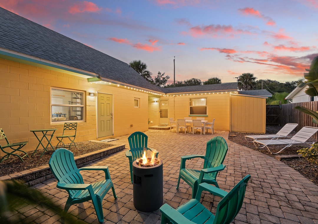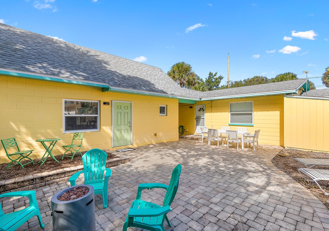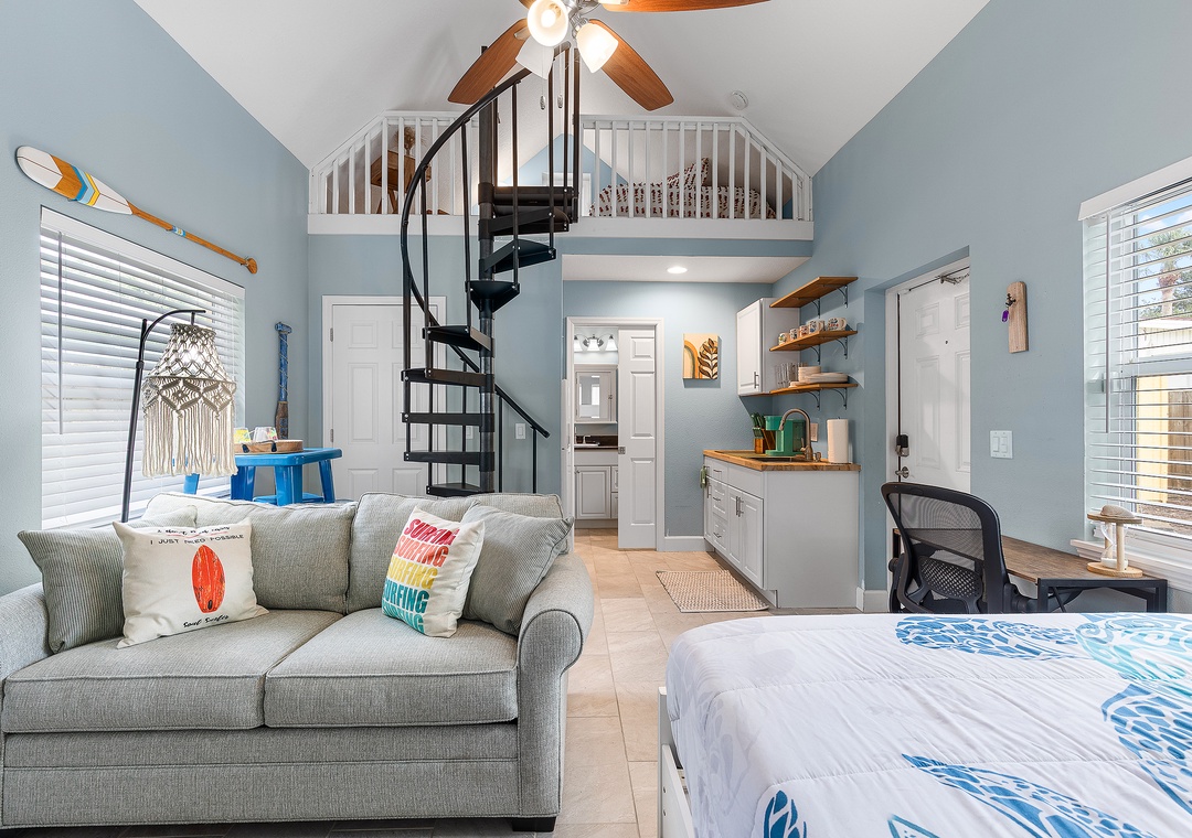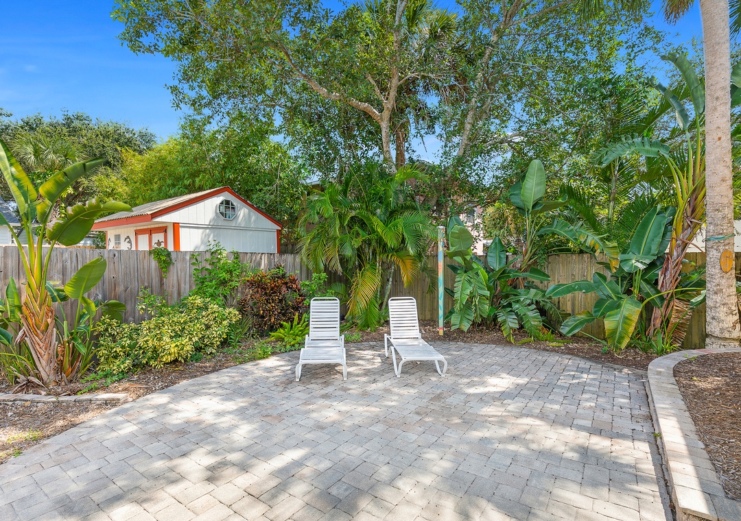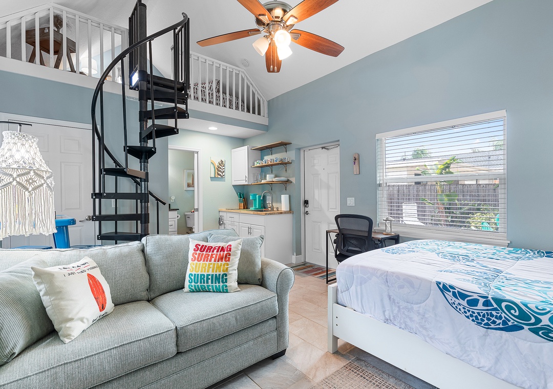 As part of Casa del Limone, tucked behind the main house, the guest studio rented separately is Paradiso dei Limoni, a charming private retreat in the heart of New Smyrna Beach, perfect for monthly rentals. Whether you're a retiree, snowbird, teacher on summer break, or simply someone lucky enough to take an extended vacation, this dreamy little retreat invites you to slow down and stay awhile. Located in a safe, laid-back neighborhood, just a short walk to the beach and the nostalgic charm of Flagler Avenue, you’ll find yourself wandering with a snow cone in hand, soaking up the sweet feeling of Old Florida. Inside, the studio is cozy and comfortable — ideal for cooking slow meals, reading a good book, or curling up for a peaceful afternoon nap. This cozy unit features one bedroom, a loft with an additional bed, a kitchenette, and a comfortable sitting area — ideal for morning coffee, quiet reading, or evening unwinding. Thoughtfully designed, the guest house shares access to the beautifully landscaped courtyard-style backyard, complete with string lights, a firepit, hammock, loungers, grill, dining area, outdoor shower completed with bicycles for you to enjoy being fit or being a kid again — the perfect setup for barefoot evenings under the stars. The guest house also shares access to the full-size washer/dryer, and has parking for 1 vehicle in the driveway. Pet-friendly policy (1 small dog under 20 lbs with fee), every detail is designed to make you feel right at home.