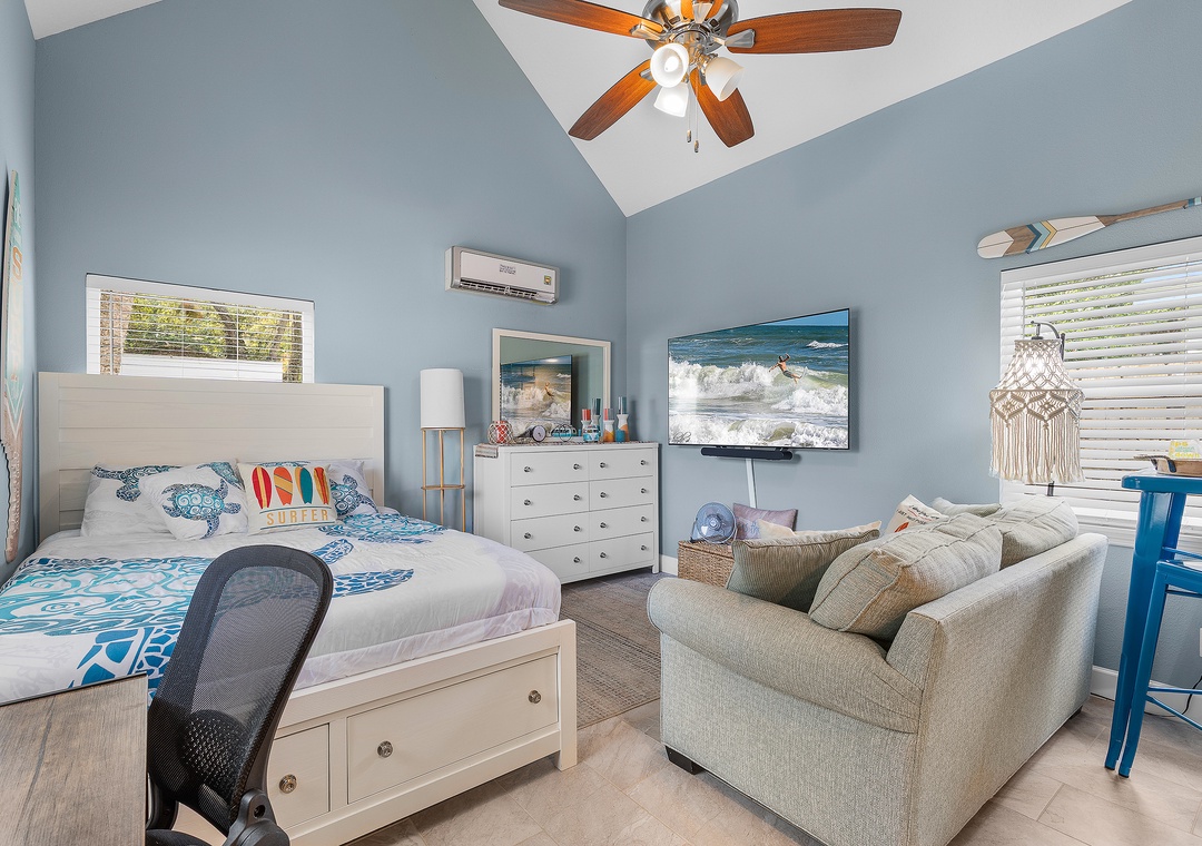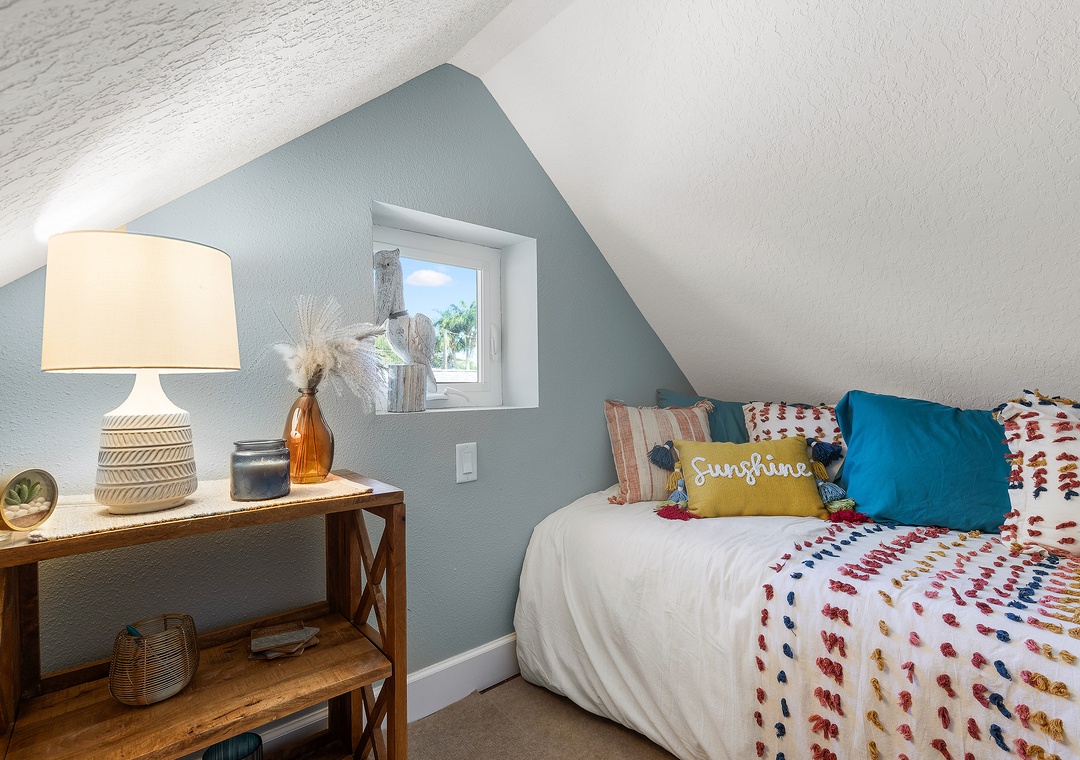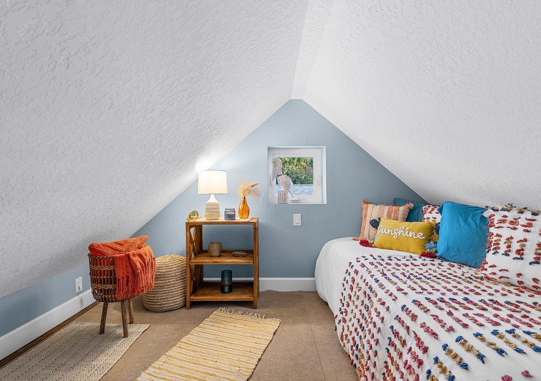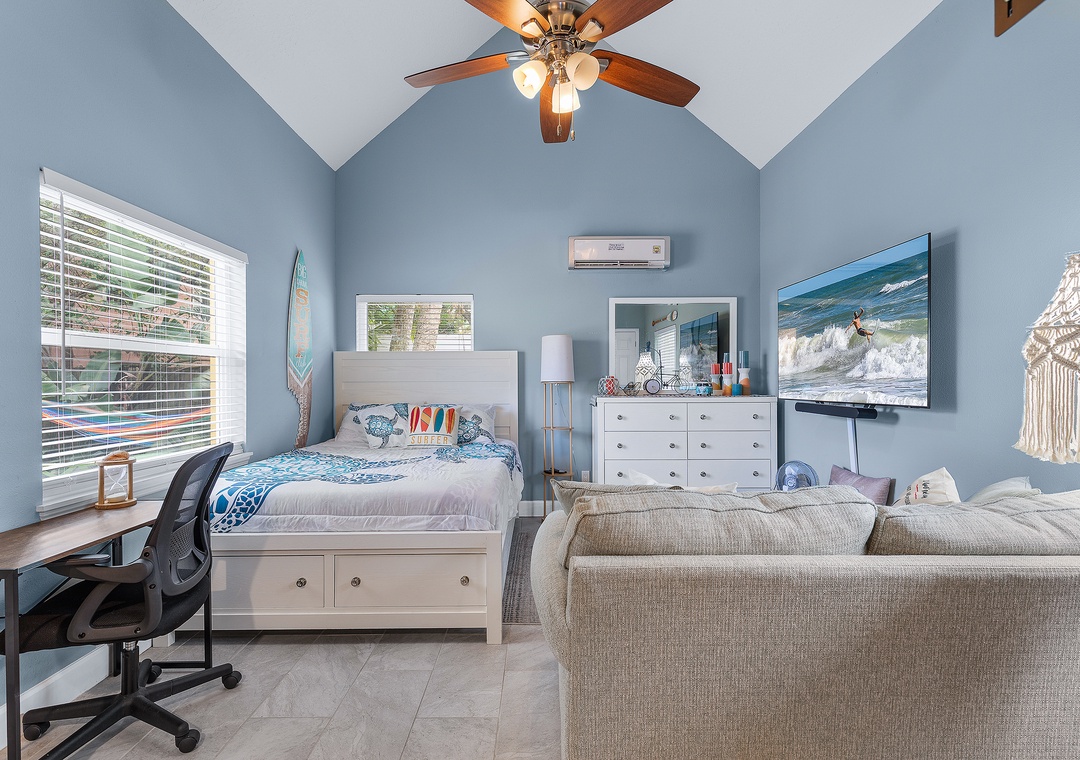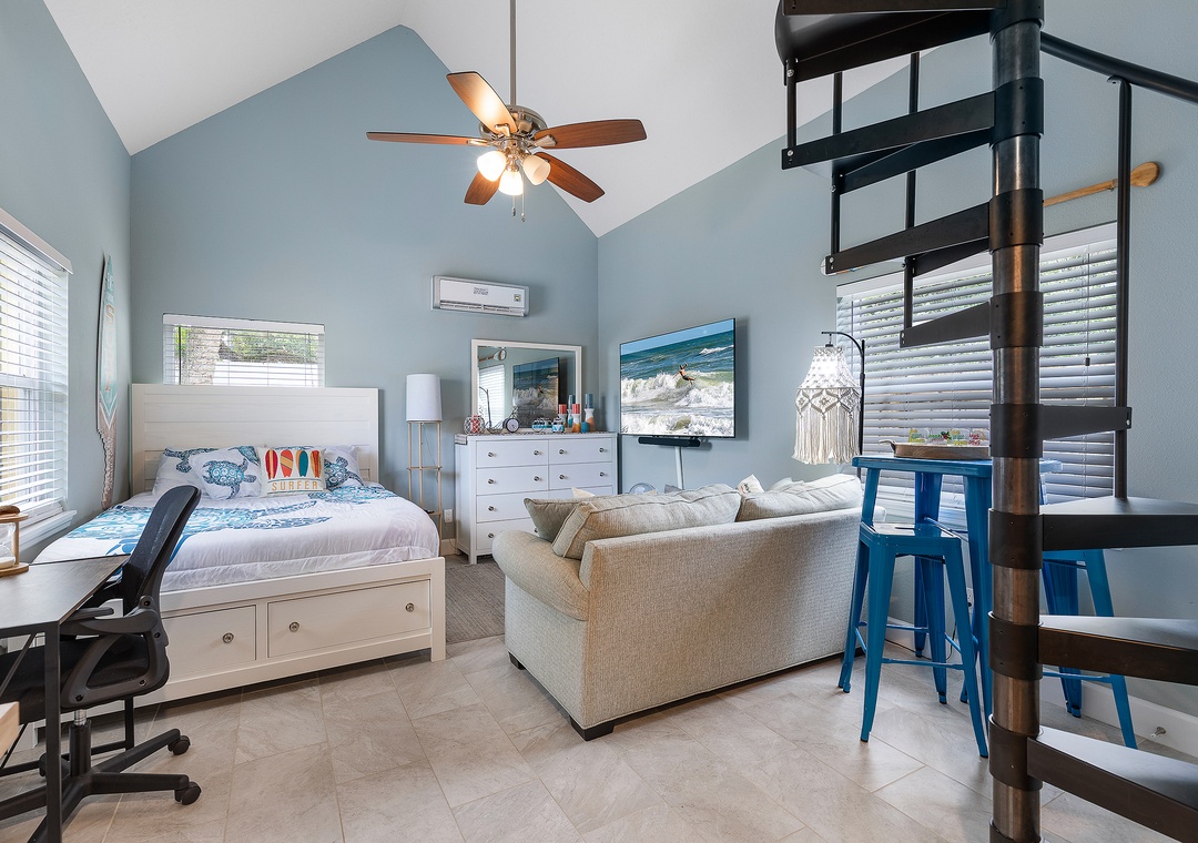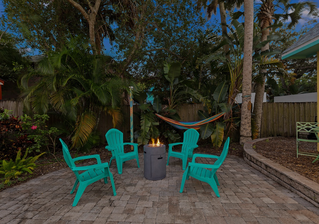 As part of Casa del Limone, tucked behind the main house, the guest studio rented separately is Paradiso dei Limoni, a charming private retreat in the heart of New Smyrna Beach, perfect for monthly rentals. Whether you're a retiree, snowbird, teacher on summer break, or simply someone lucky enough to take an extended vacation, this dreamy little retreat invites you to slow down and stay awhile. Located in a safe, laid-back neighborhood, just a short walk to the beach and the nostalgic charm of Flagler Avenue, you’ll find yourself wandering with a snow cone in hand, soaking up the sweet feeling of Old Florida. Inside, the studio is cozy and comfortable — ideal for cooking slow meals, reading a good book, or curling up for a peaceful afternoon nap. This cozy unit features one bedroom, a loft with an additional bed, a kitchenette, and a comfortable sitting area — ideal for morning coffee, quiet reading, or evening unwinding. Thoughtfully designed, the guest house shares access to the beautifully landscaped courtyard-style backyard, complete with string lights, a firepit, hammock, loungers, grill, dining area, outdoor shower completed with bicycles for you to enjoy being fit or being a kid again — the perfect setup for barefoot evenings under the stars. The guest house also shares access to the full-size washer/dryer, and has parking for 1 vehicle in the driveway. Pet-friendly policy (1 small dog under 20 lbs with fee), every detail is designed to make you feel right at home.