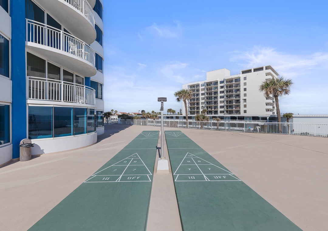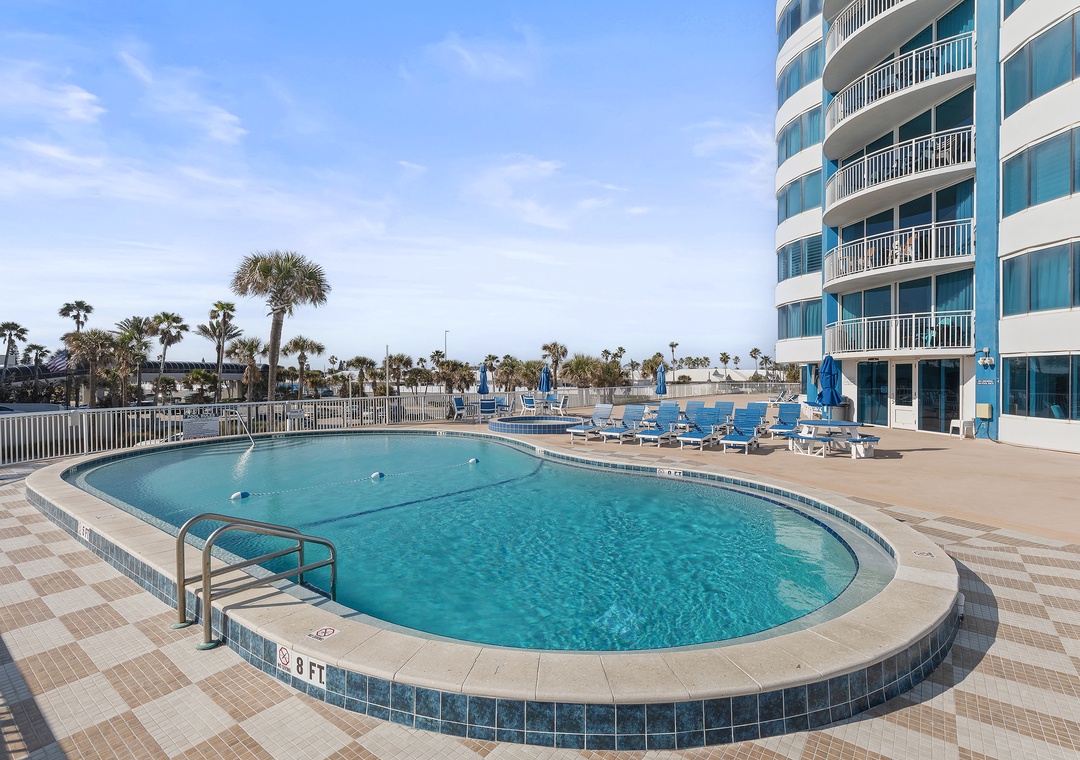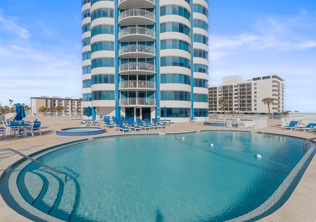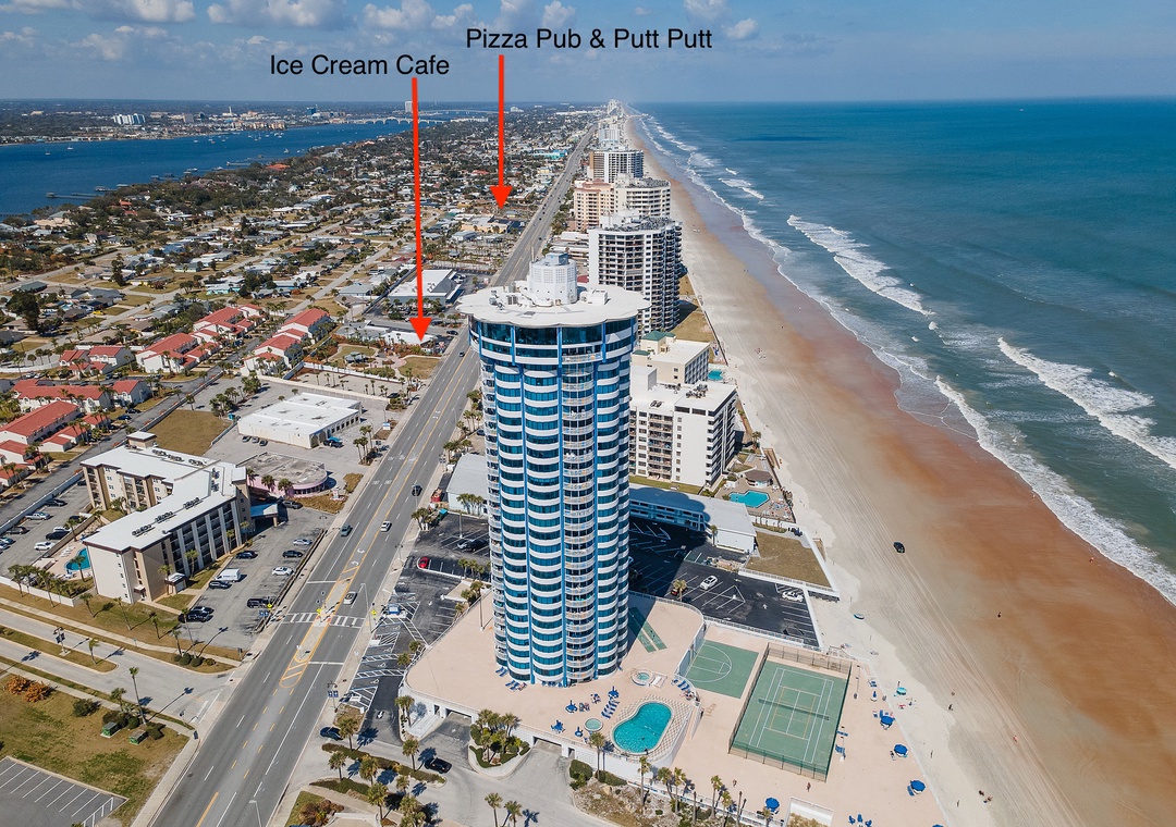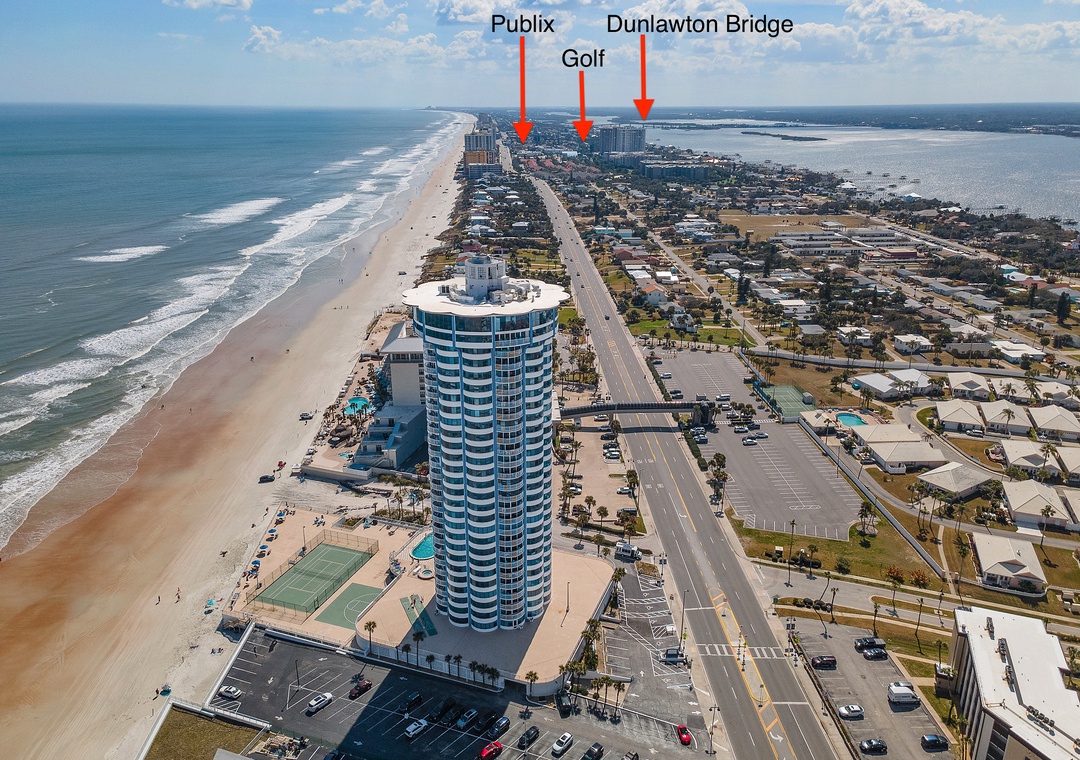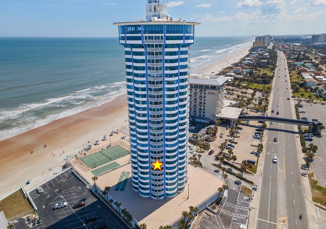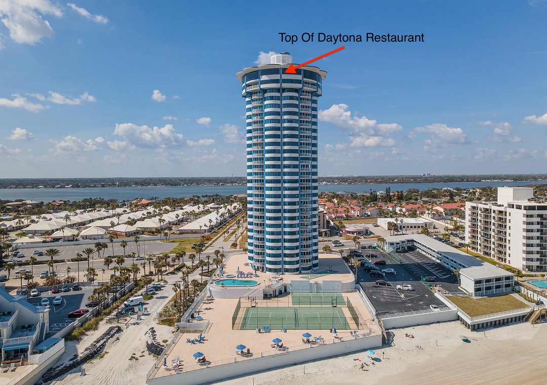 Peck Plaza is a distinctive 29-story oceanfront condominium in Daytona Beach Shores, known for its iconic round tower design and sweeping panoramic views of the Atlantic Ocean, Daytona shoreline, and Halifax River. Built in 1974 by developer Edwin Peck, it remains the tallest building in the Daytona metro area and was once the tallest direct oceanfront structure on the Atlantic Coast. Residents and guests enjoy standout amenities including a two-level oceanfront pool deck with a resort-style pool, kiddie pool, hot tub, fire pit, BBQ grills, private beach access, tennis, pickleball, basketball, and shuffleboard courts, plus a clubhouse and fitness center. At the top of the tower, Top of Daytona Restaurant offers unforgettable 360-degree views and an elevated dining experience.
