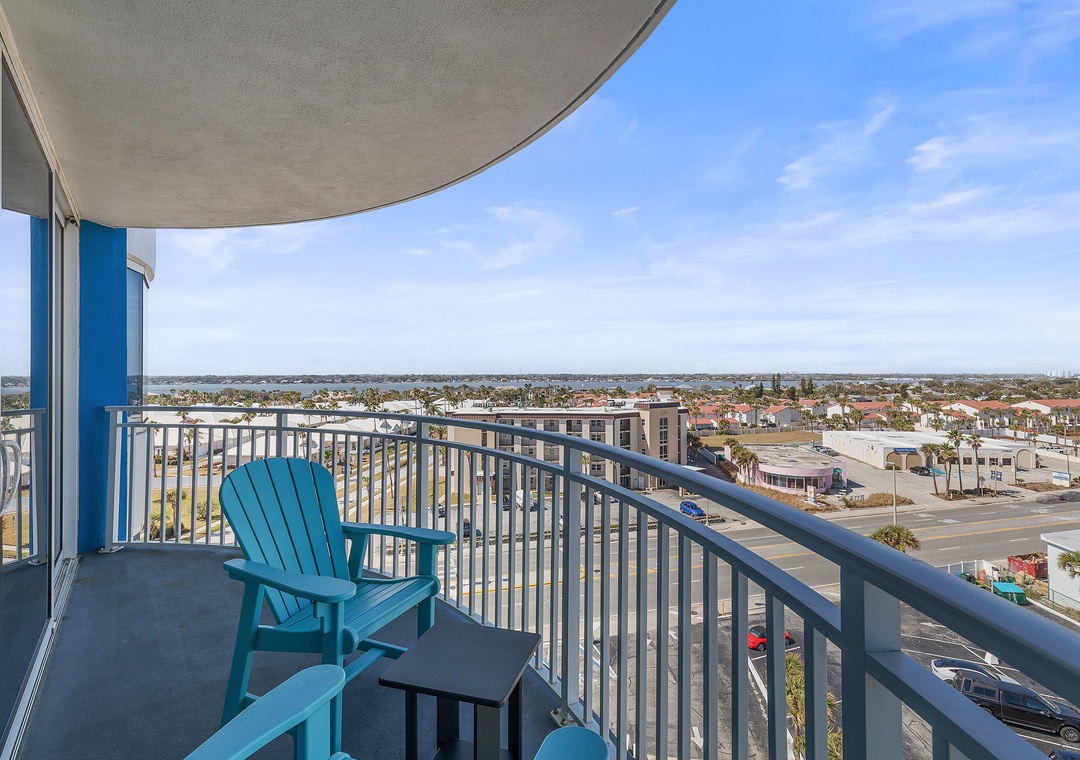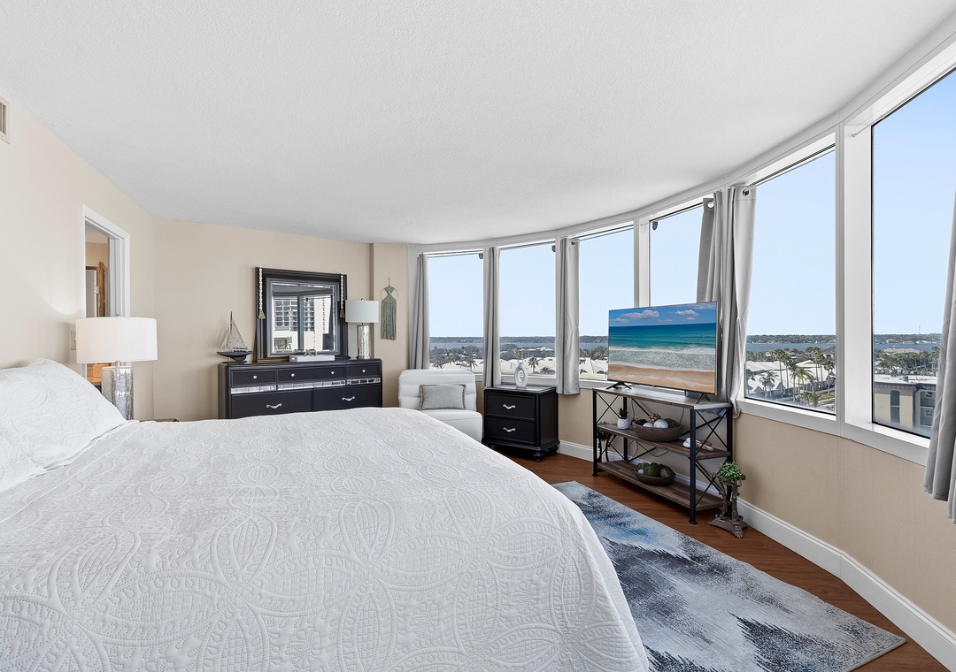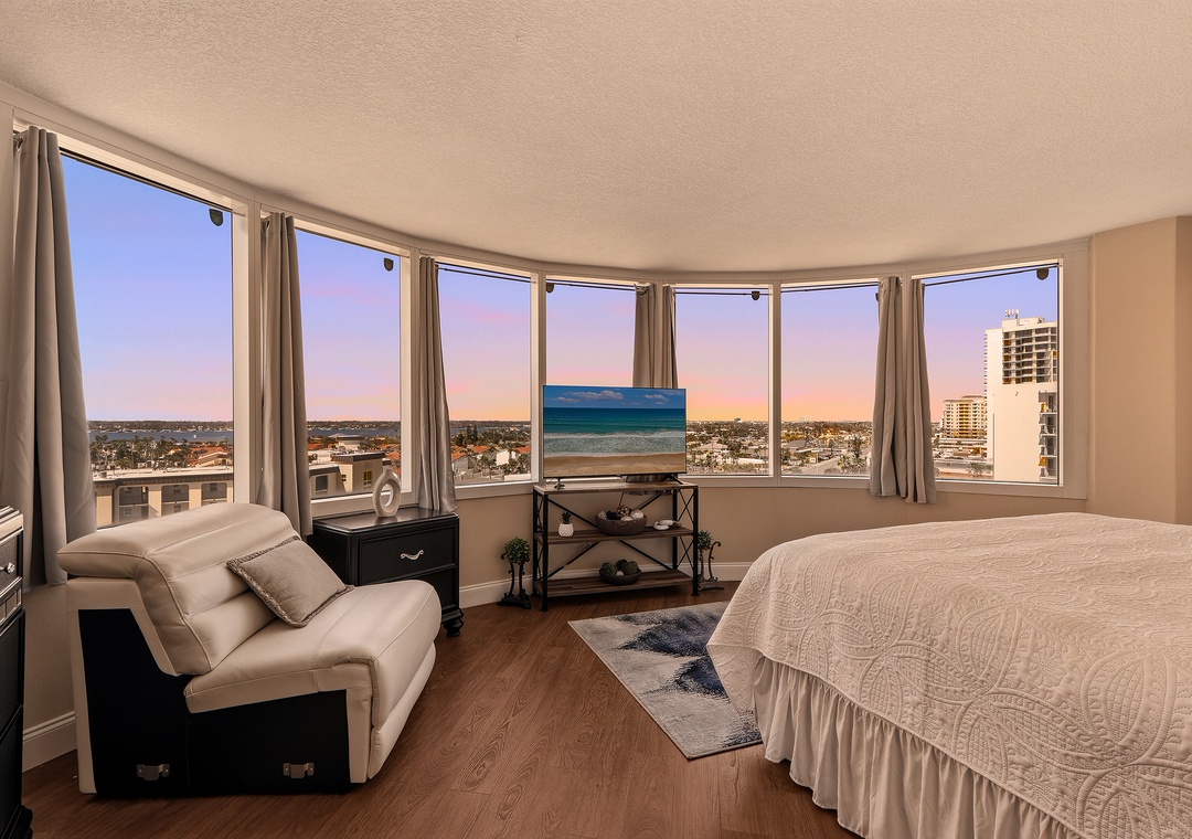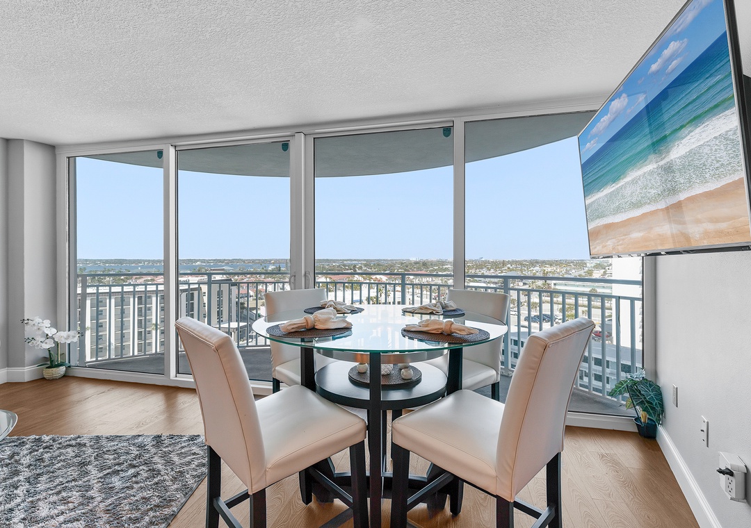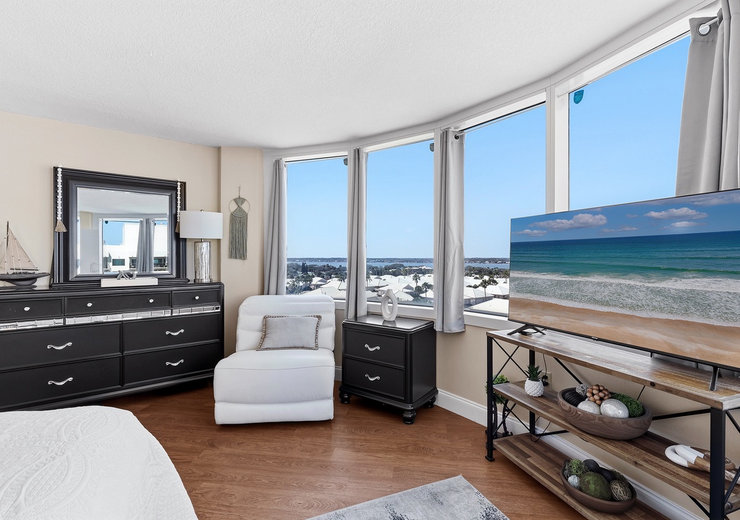 Enjoy a one-of-a-kind beach getaway at iconic Peck Plaza in beautiful Daytona Beach Shores. This 4th-floor, two-bedroom condo sits on the drive section of the beach, placing you in the heart of the classic Daytona experience. The building’s signature round tower design showcases dramatic curved floor-to-ceiling windows in the living room and both bedrooms, filling the space with natural light and panoramic views of the Atlantic Ocean, Intracoastal Waterway, and A1A. The living room opens to a private balcony, though the sweeping views can be enjoyed from nearly anywhere inside. The primary suite features a king bed, ensuite bath, and stunning Intracoastal sunset views, while the guest bedroom offers a queen and twin bed with beautiful ocean sunrises. A dining table for four, additional bar seating, in-unit washer and dryer, and parking for two vehicles add everyday convenience.