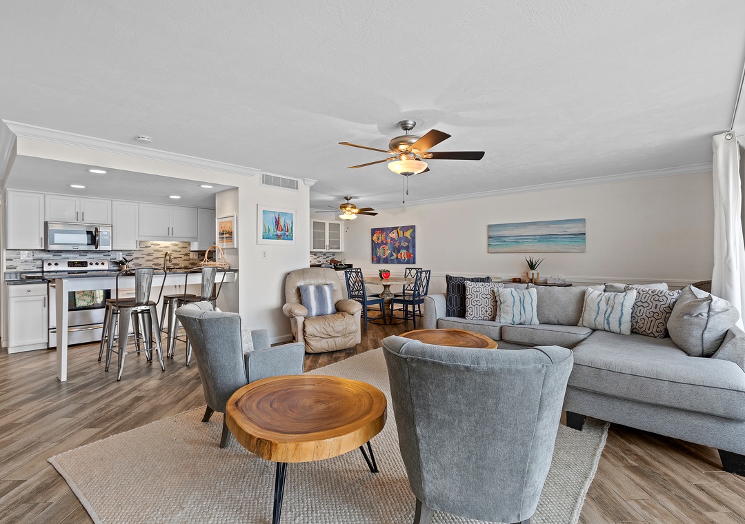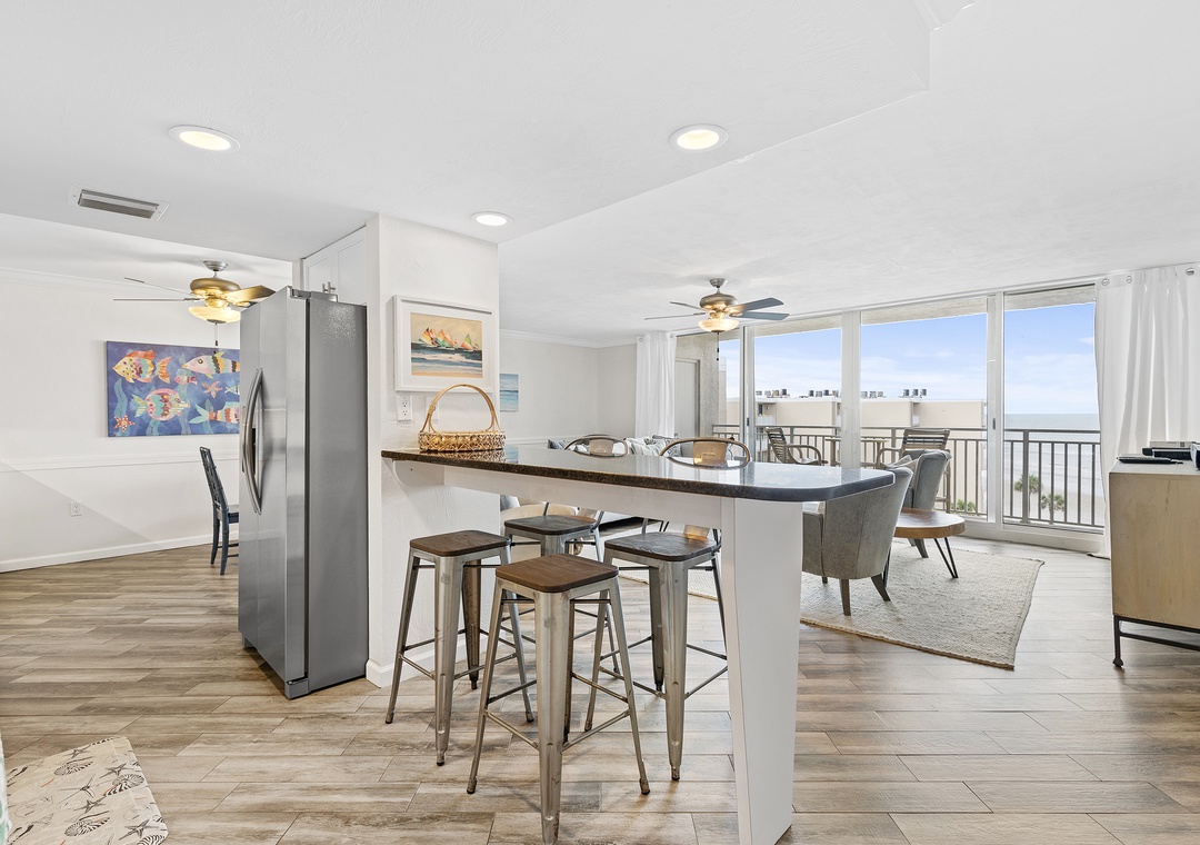 If you're searching for the definition of effortlessly relaxed, look no further than The Pelican 606C. With a sweeping sixth-floor view of the Atlantic Ocean and a bright, open interior, this condo for six knows how to give guests relaxation. This 2-bedroom, 2-bathroom condo boasts ocean scenery, wood-tile flooring, and a spacious layout. If cooking is your forte, you'll find meal prep a breeze as the kitchen is well-stocked with amenities. You will find a king in the master, a king in the guest bedroom, and an air mattress for additional guests in the living room. Quiet reflection and reading are best done on the condo's sixth-floor balcony. Sit in one of the two chairs to behold a bird's eye view of the complex pools, grounds, and crashing waves beyond. Any time spent here is guaranteed to be calming! Come start making memories at Pelican 606C!