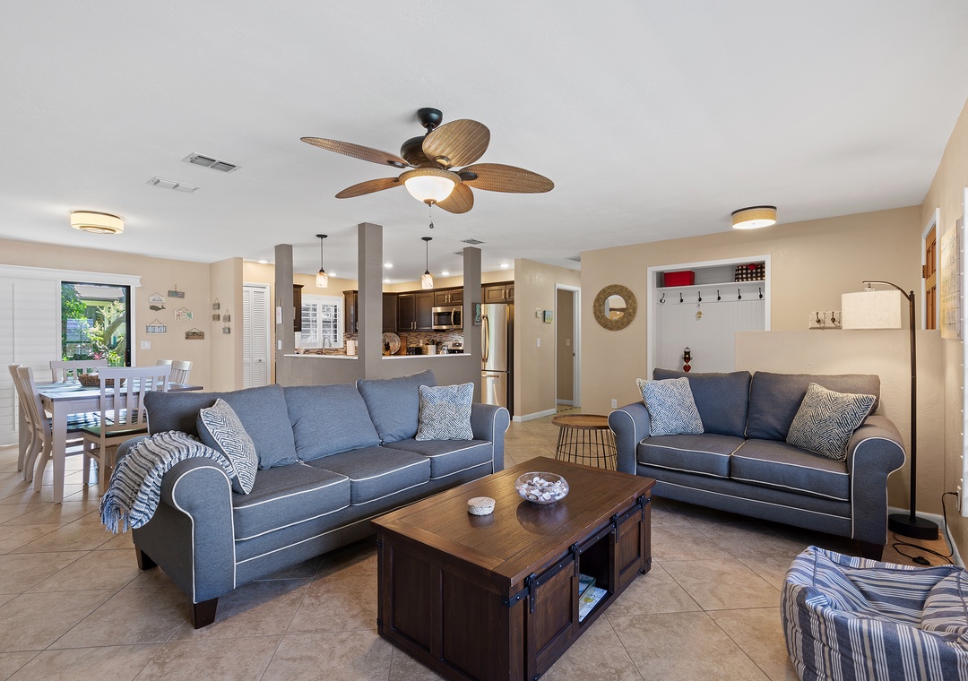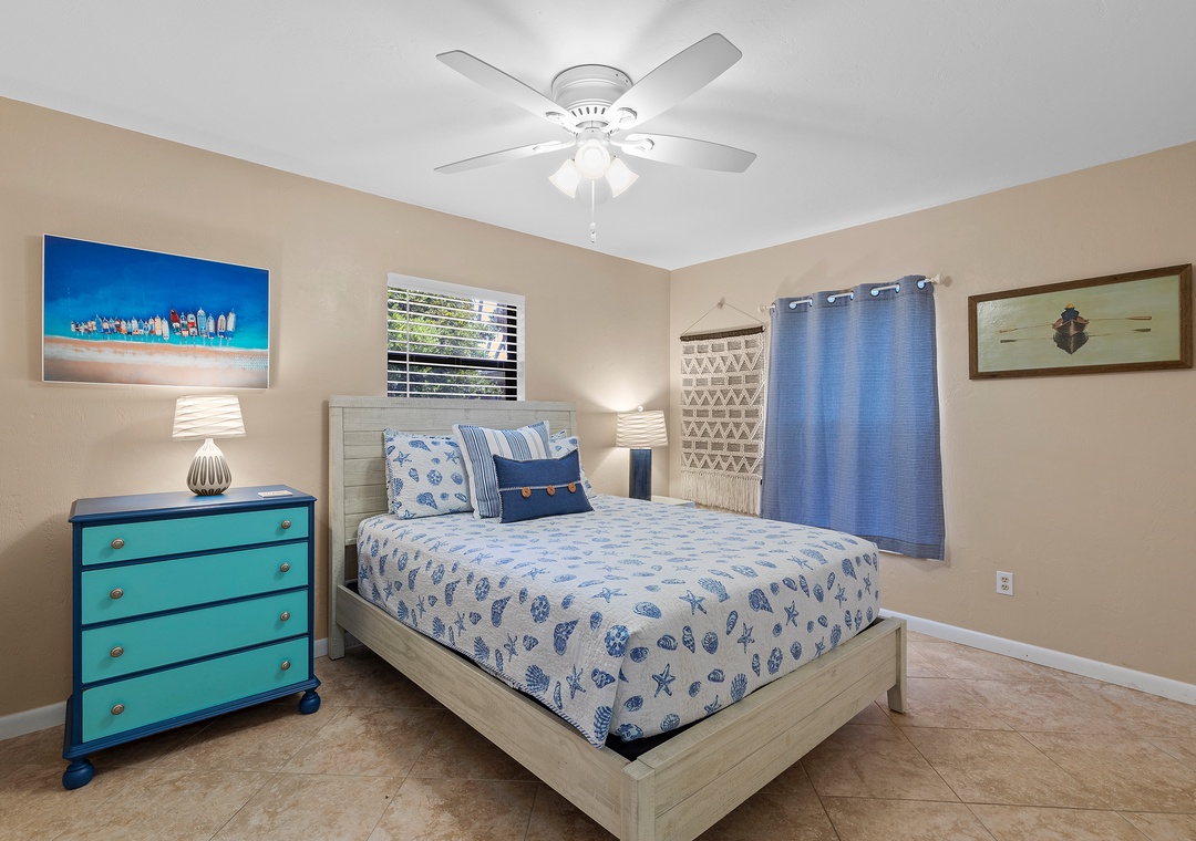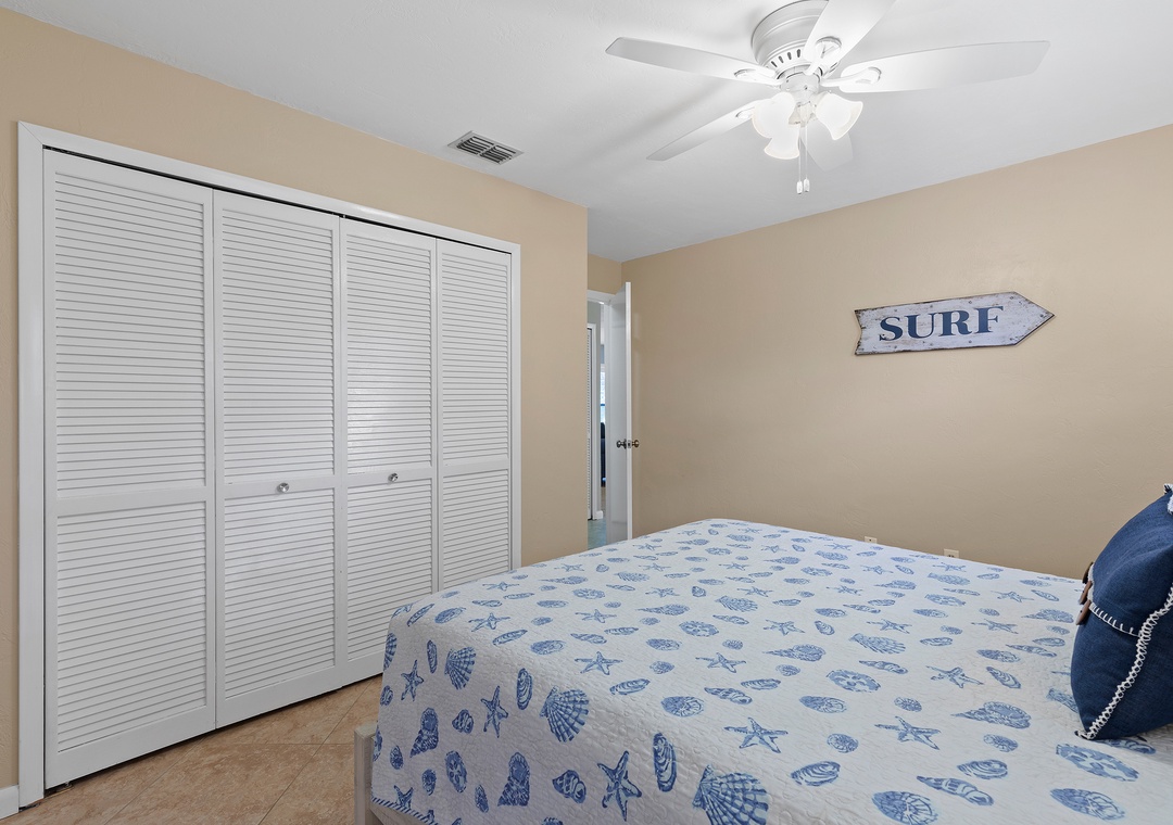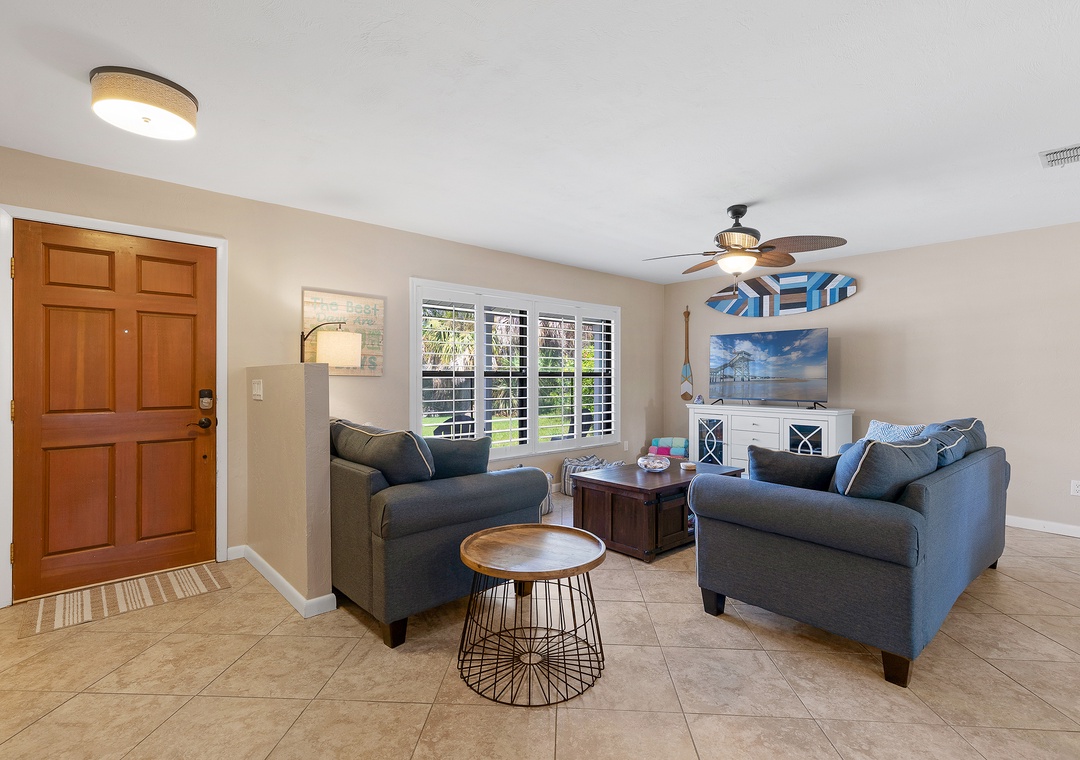 Outdoors, Pelican’s Cove has you covered with everything you need for fun in the Florida sun—two kayaks, beach chairs, a foldable wagon, and more, all stored in the garage for your convenience. After a day of exploring, enjoy the backyard patio under the shady trees, or unwind in the cheerful primary suite with a king bed, Roku TV, and private bath. The guest bedroom features a queen bed and extra sleeping space with a twin air mattress. With amenities like a washer/dryer, Roku streaming, wireless internet, and plenty of linens and beach gear, Pelican’s Cove is the perfect home base for your next family adventure.