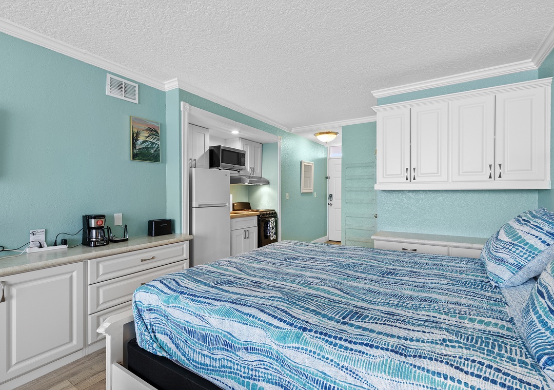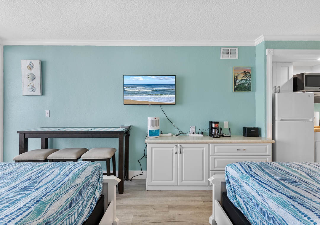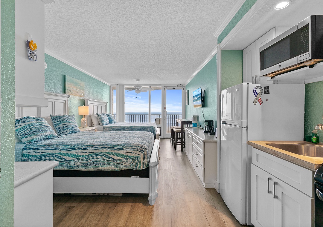 Welcome to Pirates Cove 221! With an updated interior and views of the Atlantic Ocean, this studio condo accommodates 4 guests. Pirates Cove 221 makes guests feel as if they never left the beach as the driving shore is always in sight. This unit features two queen beds and a stocked kitchenette. The condo is equipped with plenty of linens, towels, and all the conveniences of home to make your stay comfortable. There is wireless internet, Smart TVs, a drip coffee maker. Plan your next beach getaway at Pirates Cove 221!