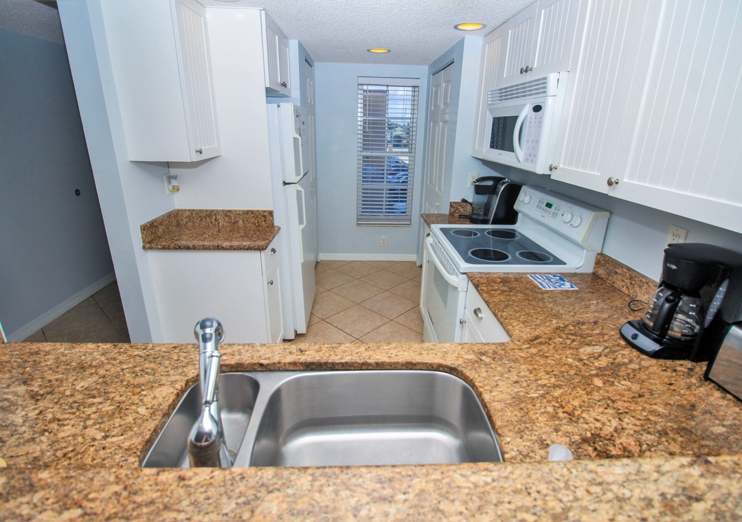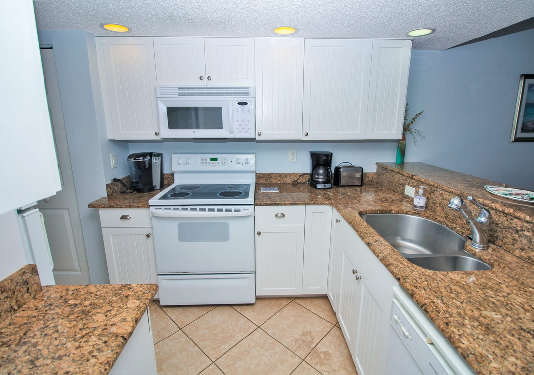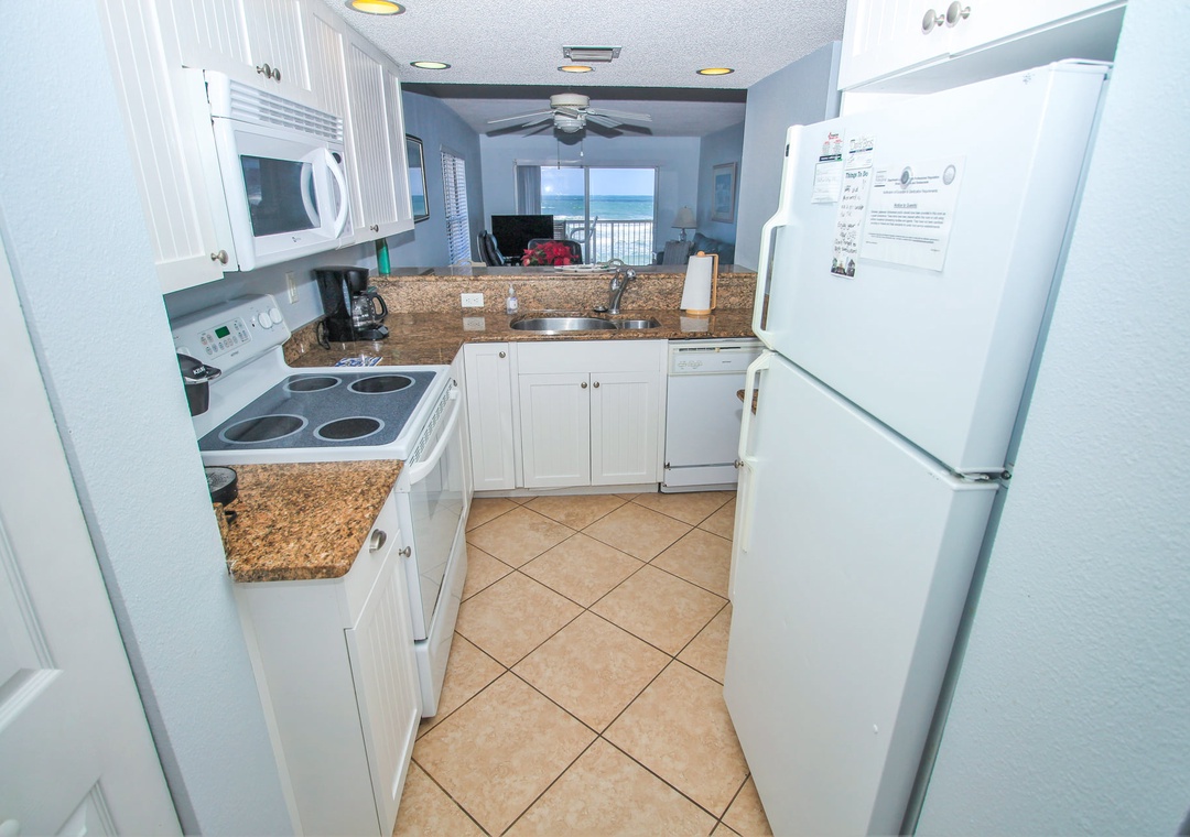 Those who arrive with beach snacks and groceries will gravitate to the updated kitchen. The kitchen has a fresh feeling with its white beadboard cabinetry, white appliances, and granite countertops. Along with a clean aesthetic, this space is fully equipped for any recipe you're eager to try. A Keurig and drip coffee maker, toaster, pots and pans, cooking utensils, and more provide guests a seamless cooking experience. Plus, the kitchen grants its chefs a dreamy view to chop and prep to! Meals can be enjoyed at the dining room table for four.