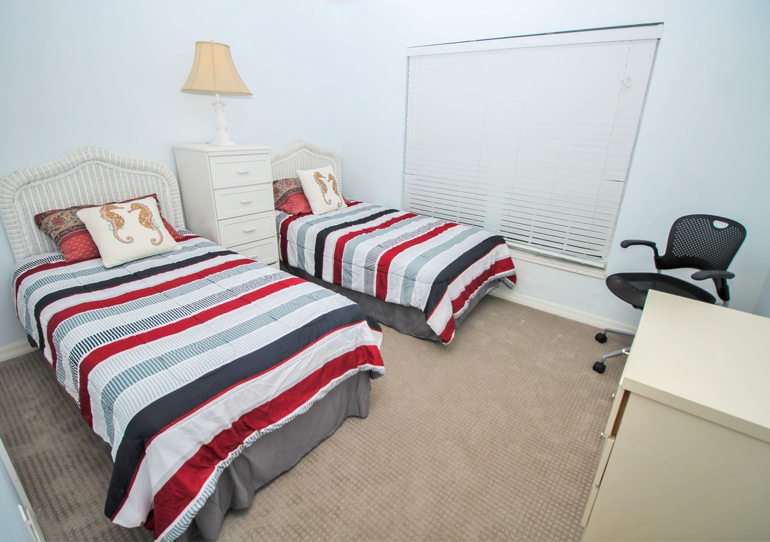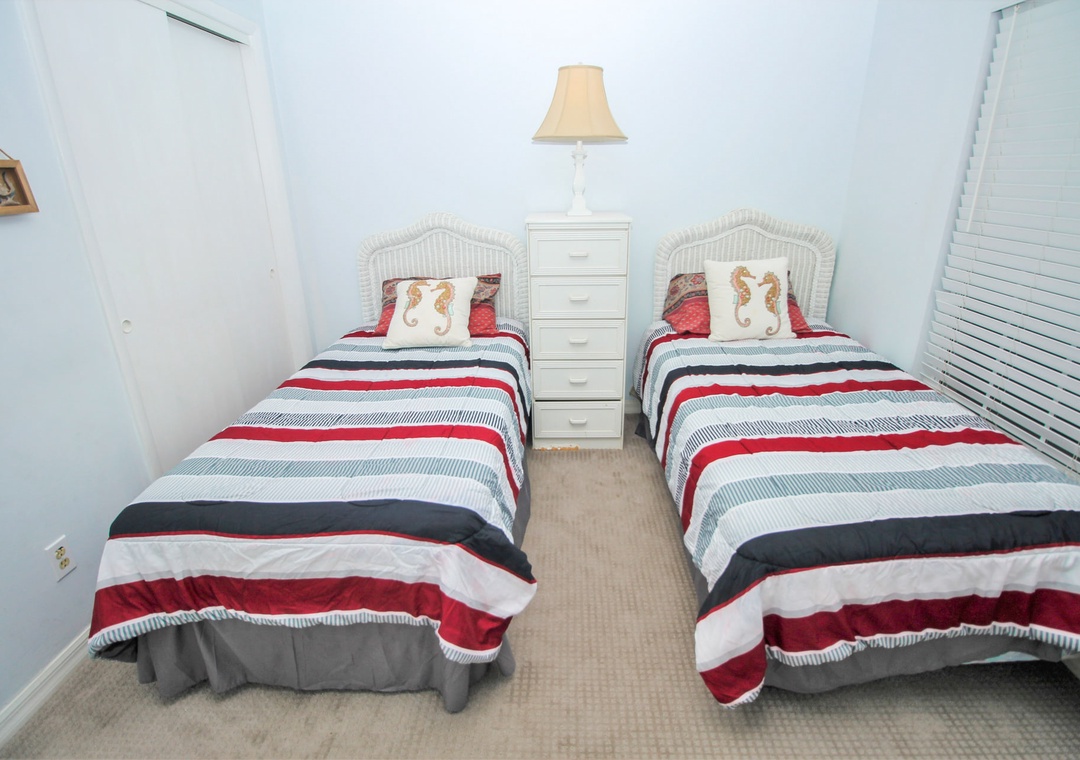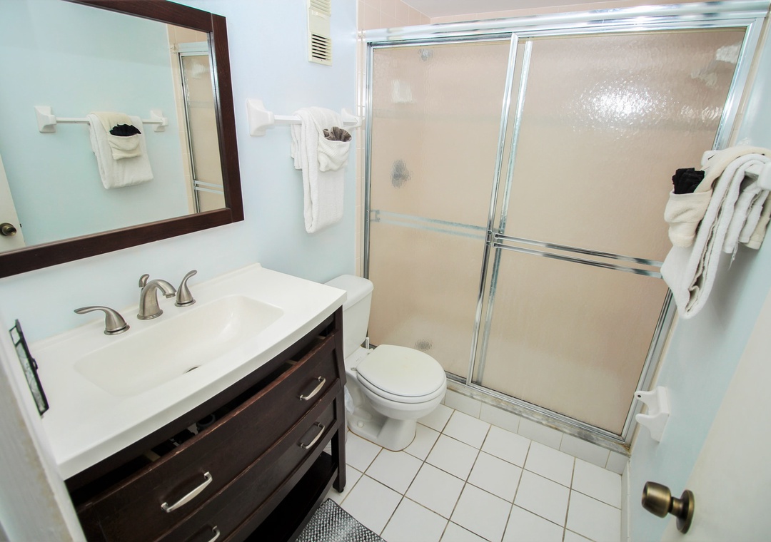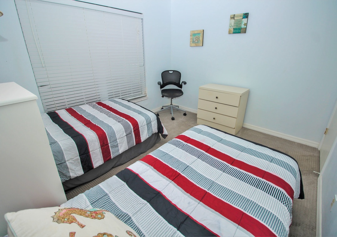 Two others can share the second bedroom as it has two twin beds. Guests can use the nearby bathroom which has a walk-in shower and plenty of bath towels.