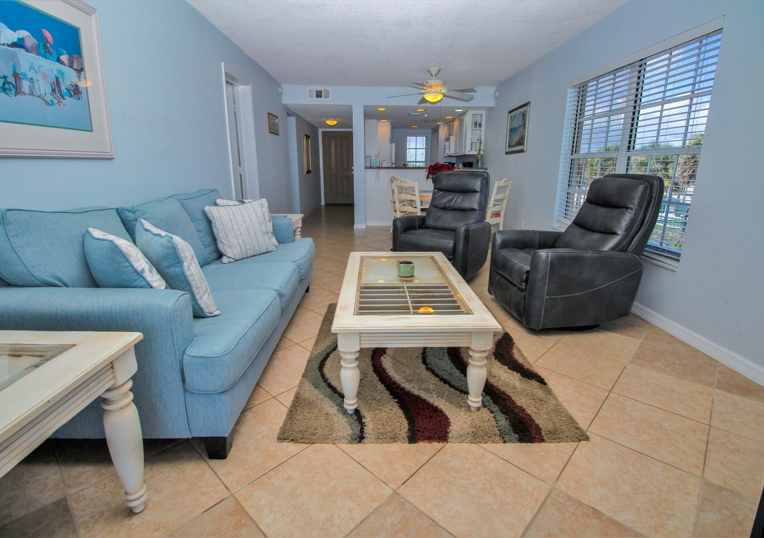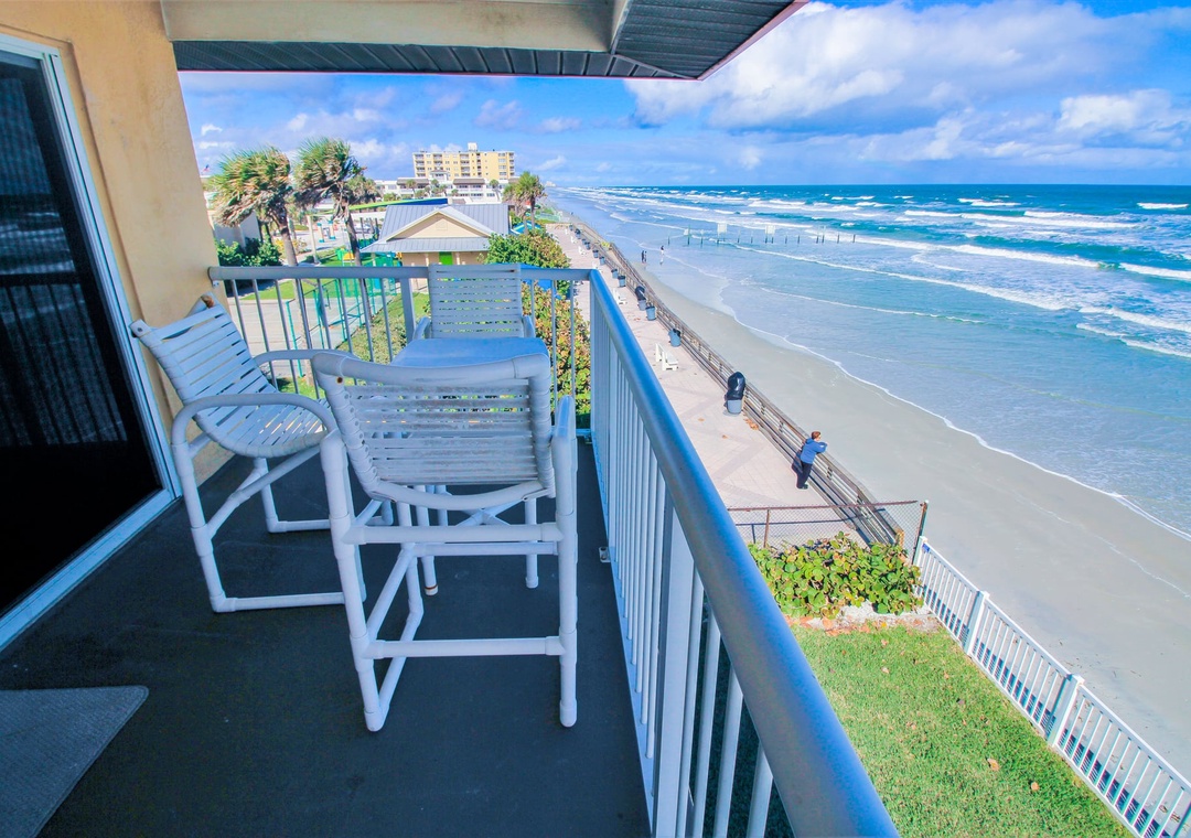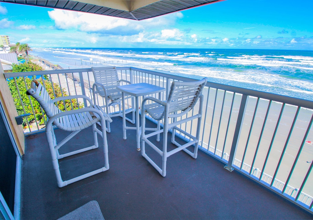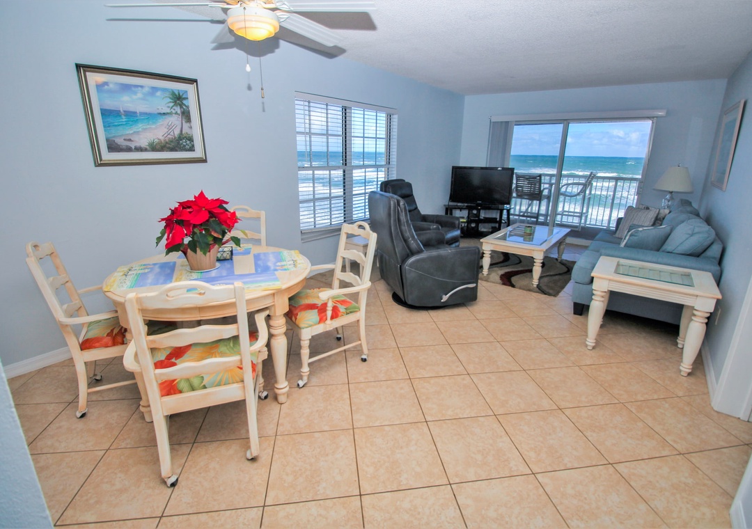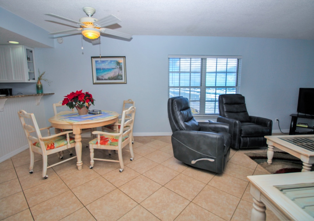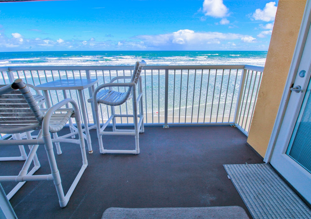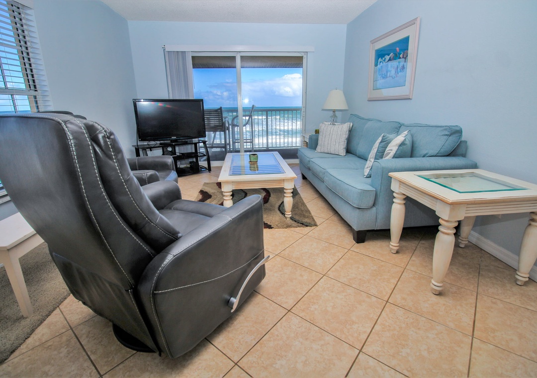 In between trips to the shore, kick back in the living room. You'll never have to say goodbye to the sea as this room has a direct and corner view of the ocean. Pick a spot on either the pull-out couch or one of the three recliners and enjoy your favorite shows on the flat-screen TV equipped with cable. If you'd rather spend your R&R in the Florida sunshine, you can do so on the third-floor balcony. With a sweeping view of the driving and non-driving shore, this space is perfect for enjoying morning coffee or evening cocktails.