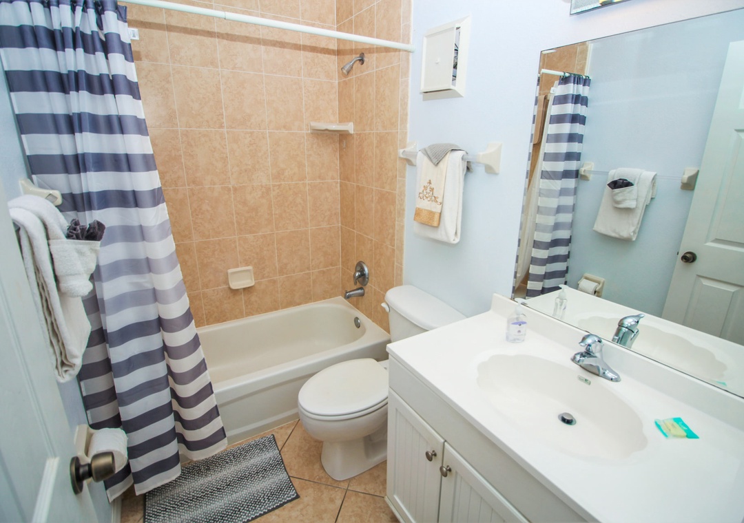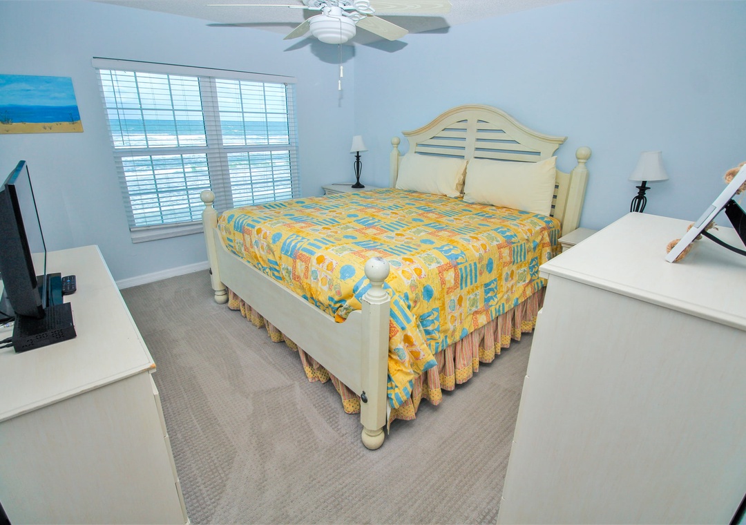 After walks on the beach and wading through the waves, you'll be more than ready to retire to the primary bedroom. Fall asleep in the king bed to a late-night movie and awake to the sun rising over the ocean in the morning. Along with exclusive access to the balcony, the bedroom has an adjoining bathroom with a standard bathtub and soft bath linens.