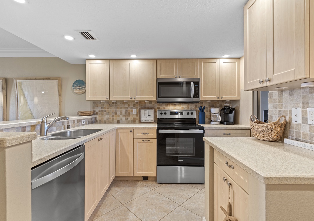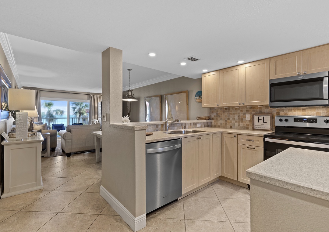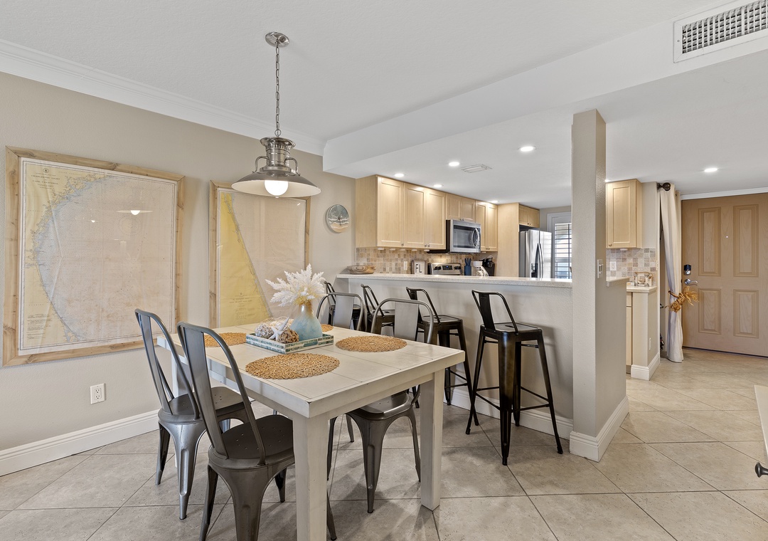 Escape reality and find the fun at Point East 314! This top floor two-bedroom haven accommodates up to six guests, offering a relaxing retreat with scenic ocean views, top-rate amenities, and coastal charm. The comfy, fun atmosphere welcomes you, with coastal pops of color against muted walls and natural wood flooring. The airy kitchen invites culinary creativity with its inviting cabinetry and natural light, while the breakfast bar is perfect for socializing. The fully stocked kitchen features both Keurig and drip coffee makers and ample cabinet space for snacks.