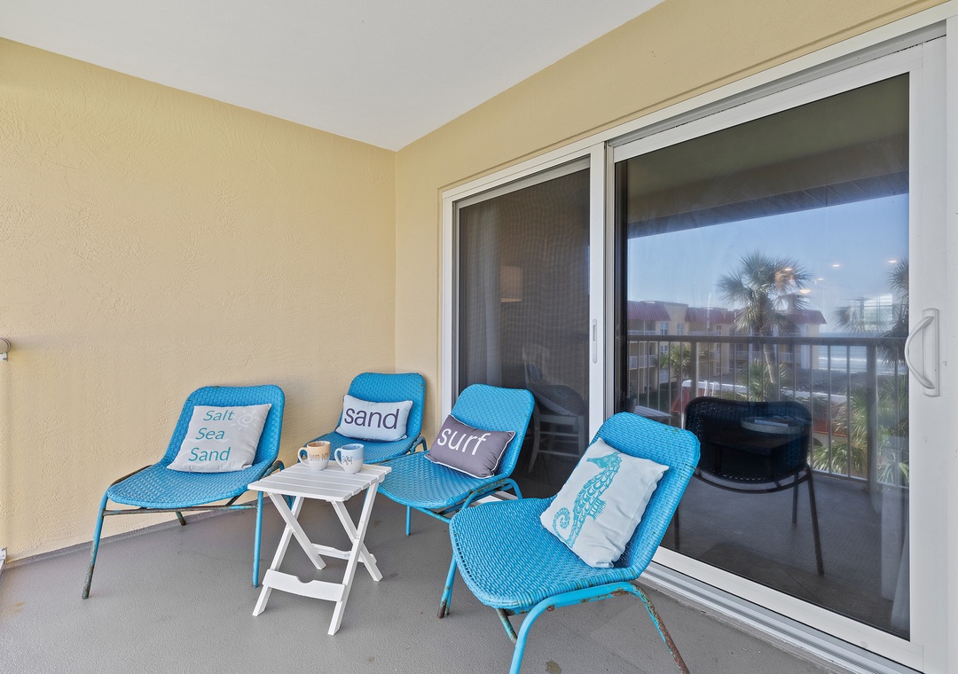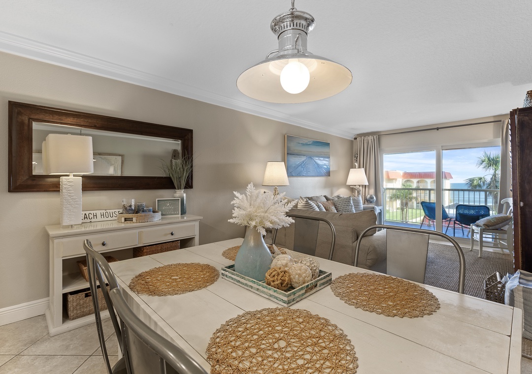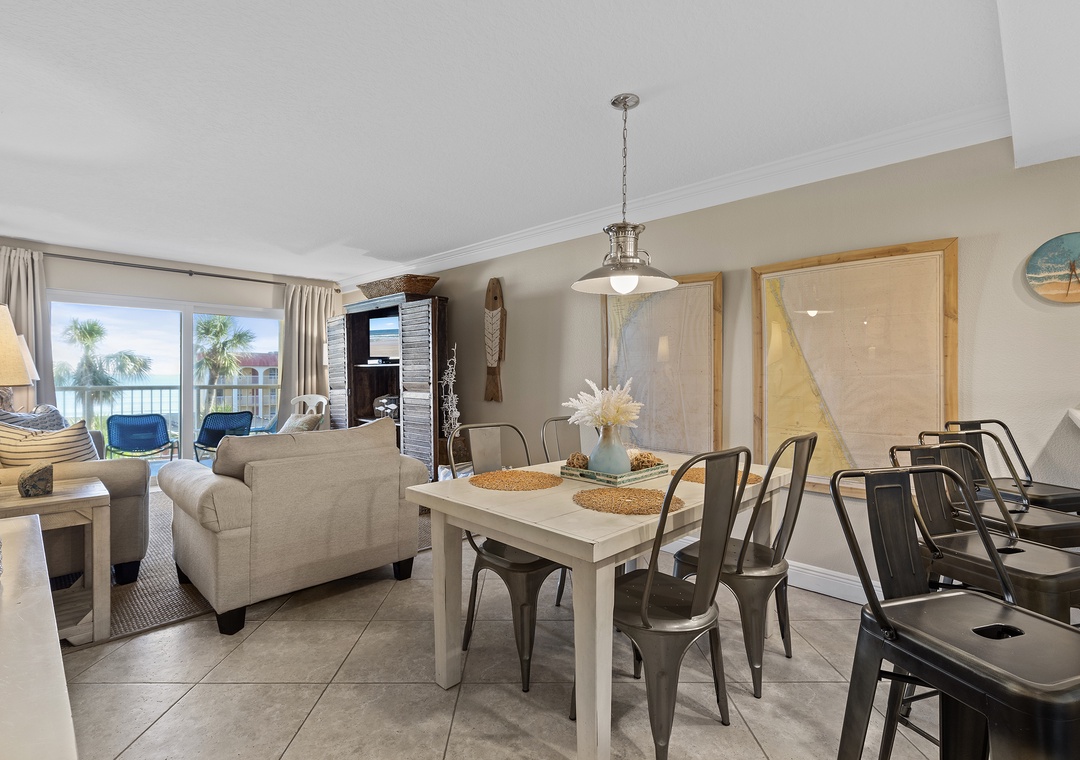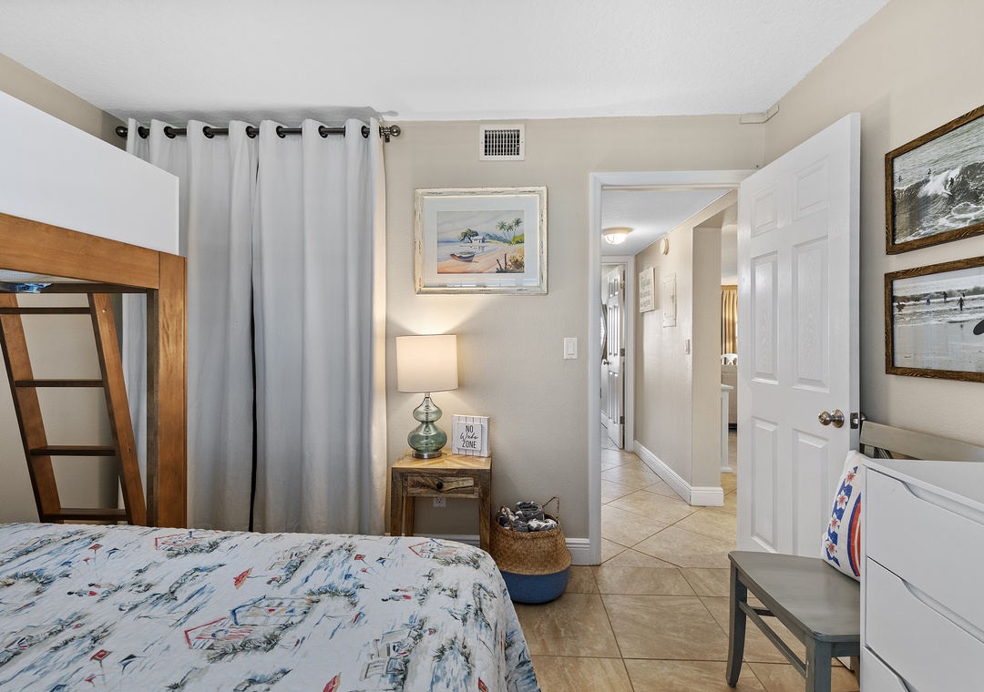 The dining area, with its ocean view and conversational layout, is ideal for memorable meals and laughter. The comfy living room, adorned with coastal decor, boasts a pull-out couch and plush chair with stunning ocean views. Enjoy Florida's temperate weather and breathtaking sunsets from the third-story balcony with a beverage of your choice. The primary bedroom offers a king bed with coastal charm and a private bathroom. The guest bedroom continues the beach theme with bunk beds featuring a twin over queen and beachy decor. The condo includes linens, towels, beach chairs, free Wi-Fi, and cable TV for a comfortable stay.