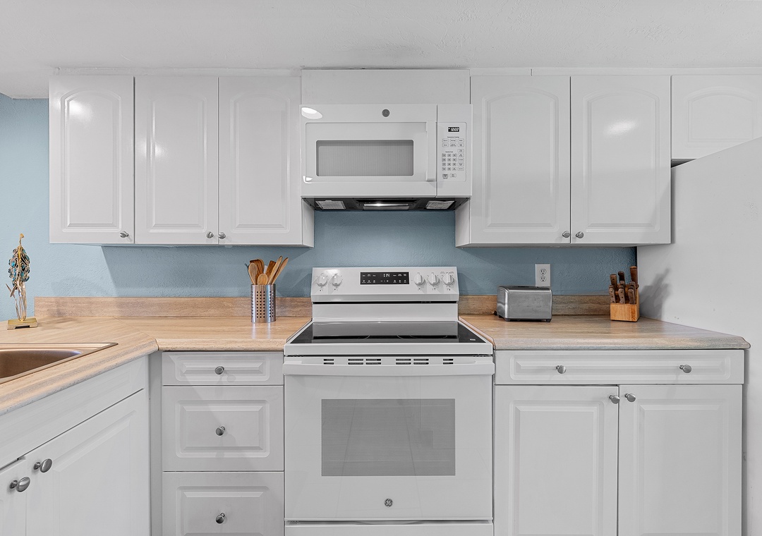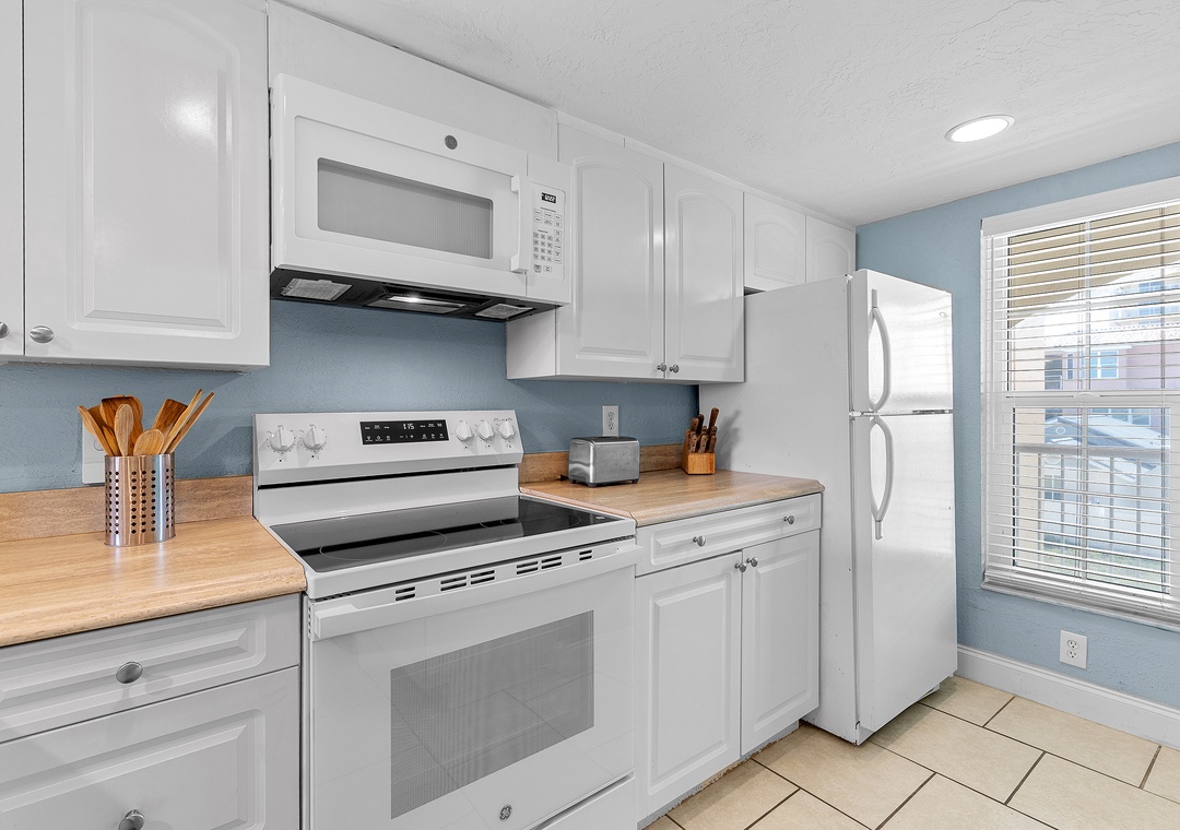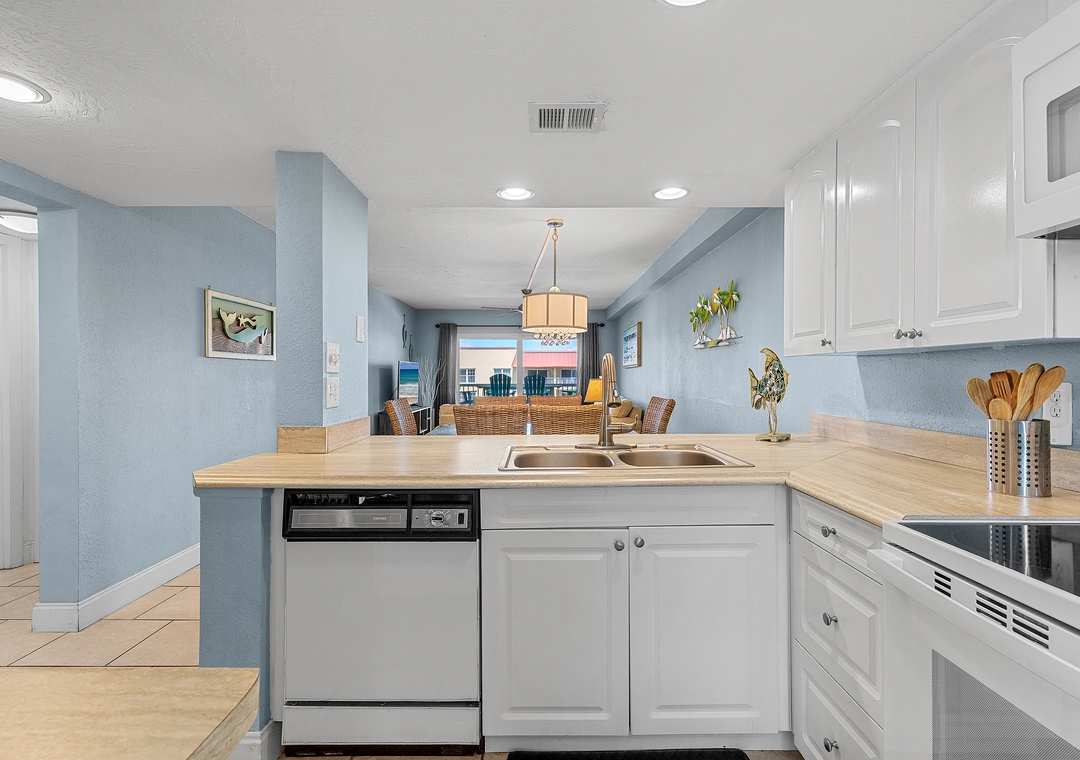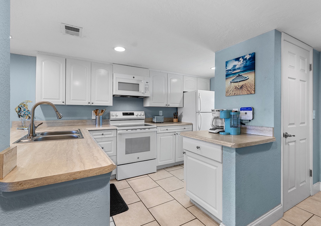Escape reality and find the fun at Point East 320! This top floor two-bedroom haven accommodates up to five guests, offering a relaxing retreat with scenic ocean views, top-rate amenities, and coastal charm. The comfy, fun atmosphere welcomes you, with coastal pops of color and all tile flooring. The airy kitchen invites culinary creativity with its inviting cabinetry and natural light. The fully stocked kitchen features both Keurig and drip coffee makers and ample cabinet space for snacks.