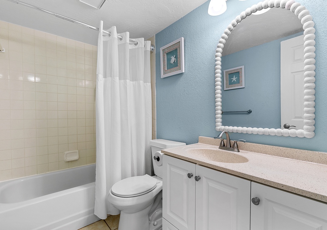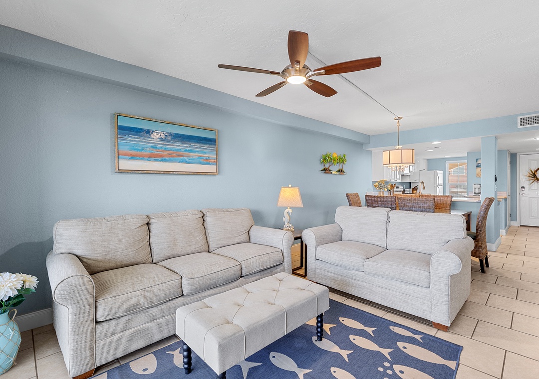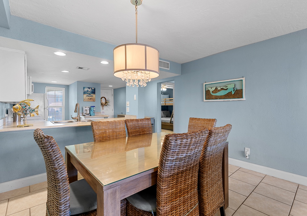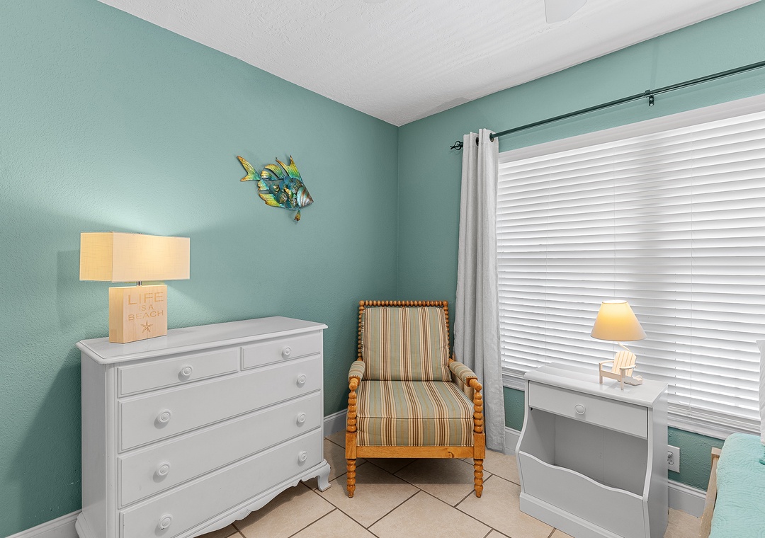Escape reality and find the fun at Point East 320! This top floor two-bedroom haven accommodates up to five guests, offering a relaxing retreat with scenic ocean views, top-rate amenities, and coastal charm. The comfy, fun atmosphere welcomes you, with coastal pops of color and all tile flooring. The airy kitchen invites culinary creativity with its inviting cabinetry and natural light. The fully stocked kitchen features both Keurig and drip coffee makers and ample cabinet space for snacks.