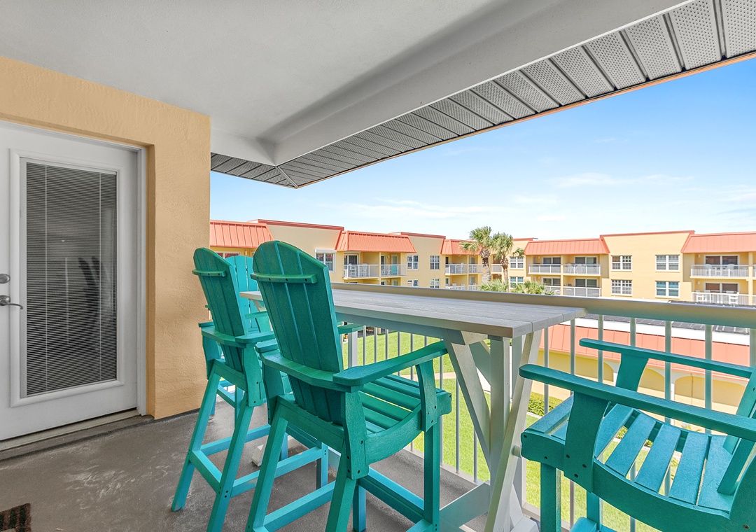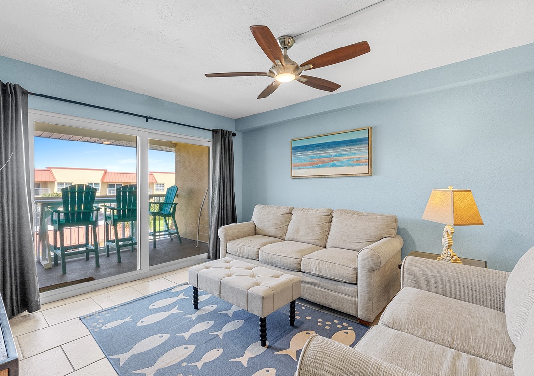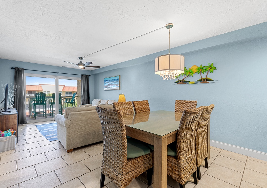 The dining table seating six, with its ocean view and conversational layout, is ideal for memorable meals and laughter. The comfy living room, adorned with coastal decor, boasts a sofa and love seat with ocean views. Enjoy Florida's temperate weather and breathtaking sunsets from the third-story balcony on new polywood furniture. The primary bedroom offers a king bed with coastal charm and a private bathroom. The guest bedroom continues the beach theme with bunk beds featuring a twin over double and beachy walls. The condo includes linens, towels, beach chairs, free Wi-Fi, and cable TV for a comfortable stay.