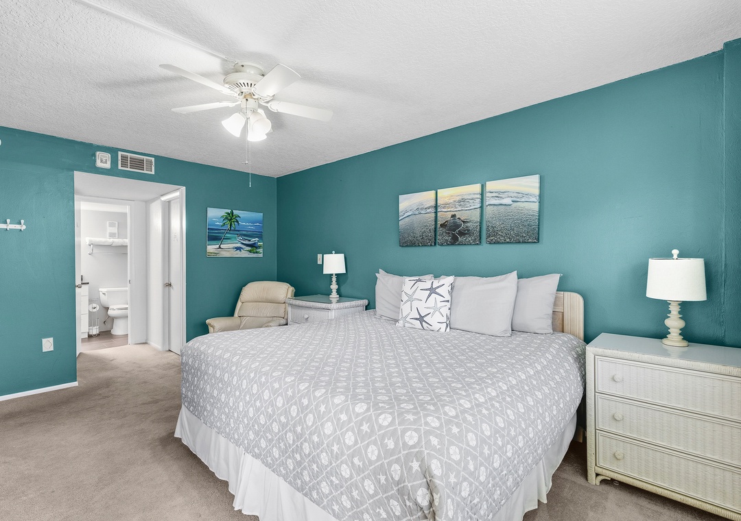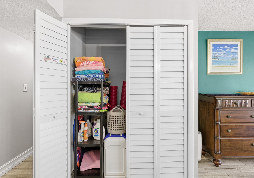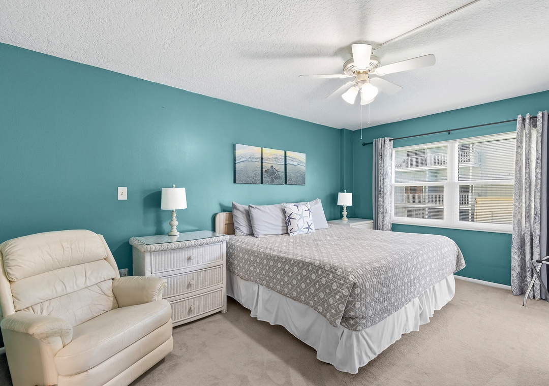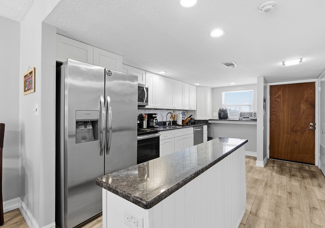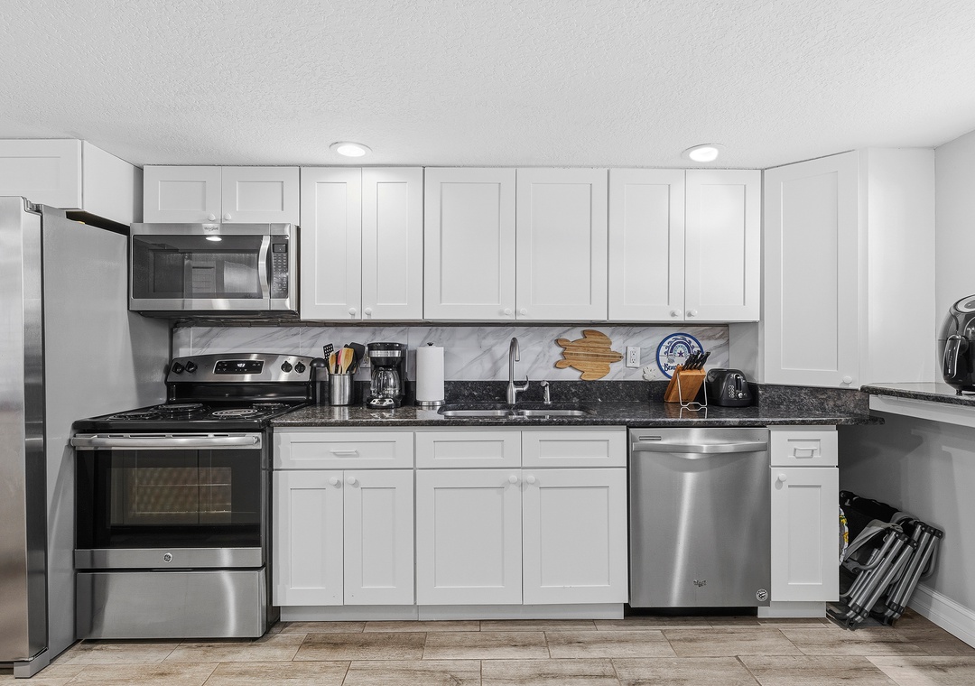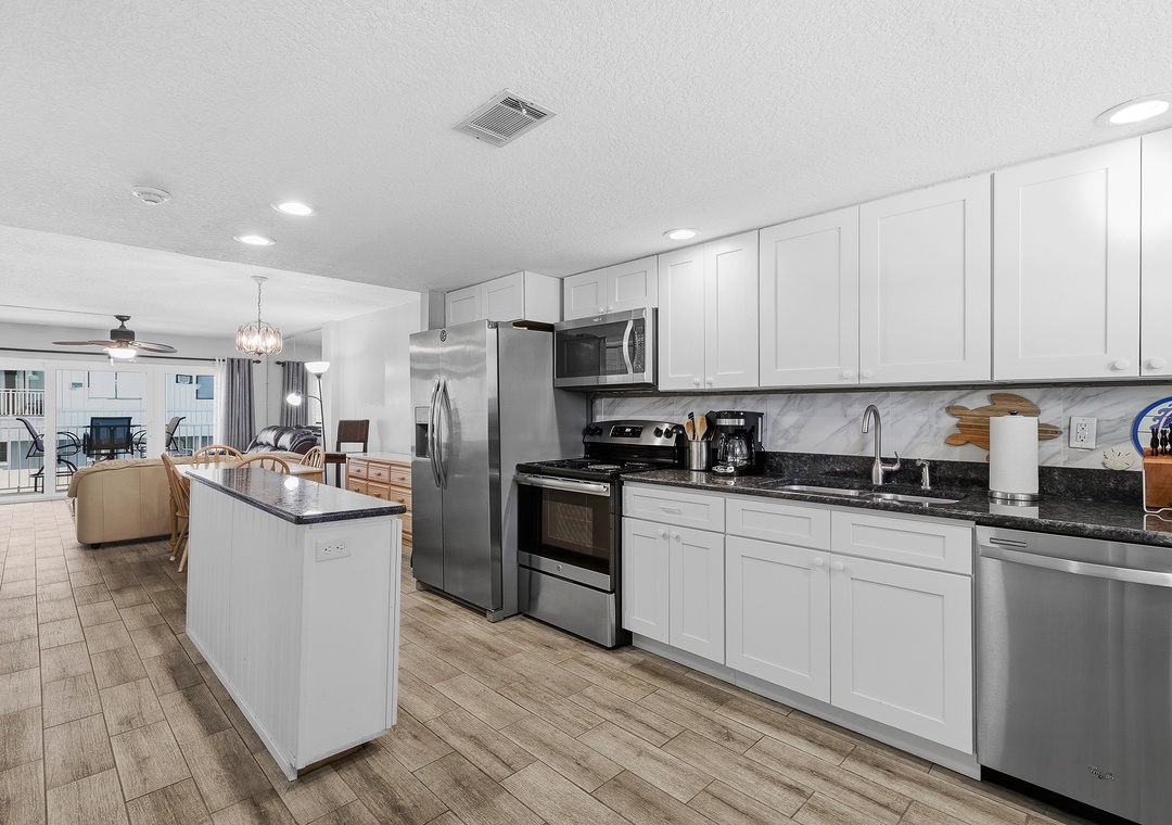 The kitchen is stocked with all the essentials for cooking at home, plus the added bonus of a toaster oven and air fryer, and features stainless steel appliances with crisp white cabinetry. Pool toys and beach gear are provided so you can pack lighter and play more. Two TVs—one in the living room and one in the primary bedroom—round out this comfortable, no-stress condo that’s perfect for a fun, laid-back beach getaway.