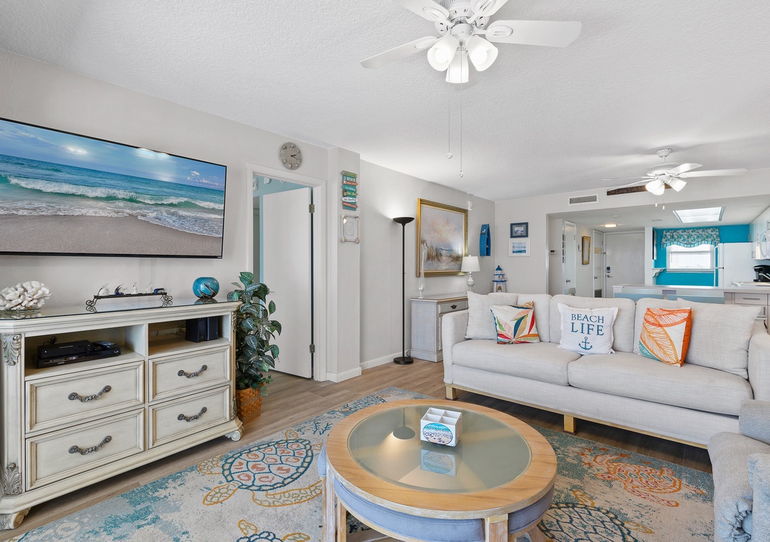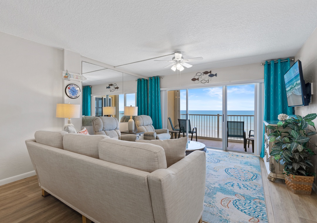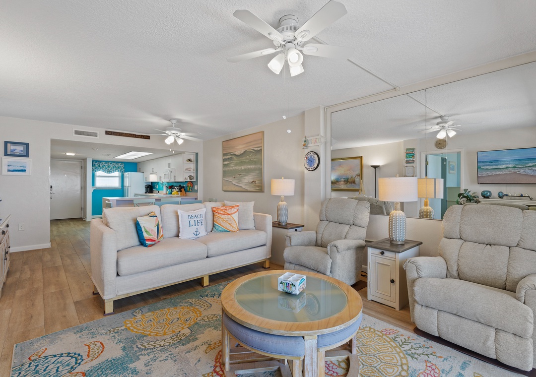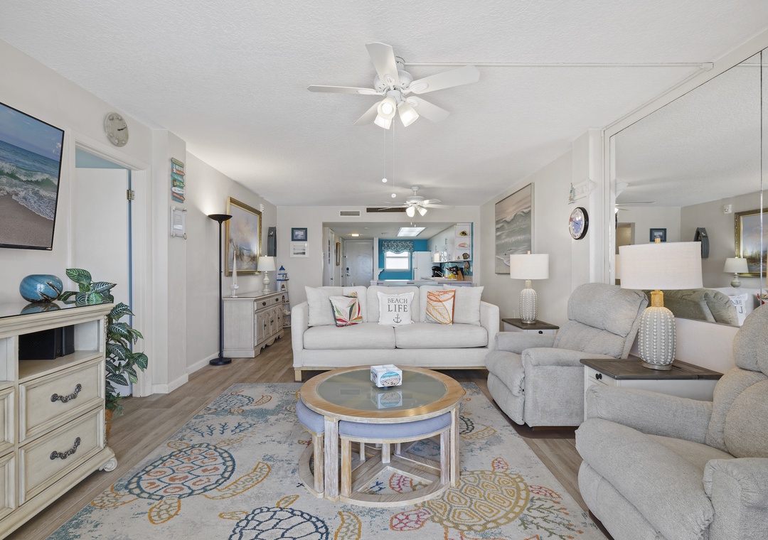 Flowing seamlessly from the dining area is the light and cozy living room. This space is one you'll retreat to regularly as it holds a lovely couch, two plush recliners, and a large flat-screen TV with a DVD and Blu-Ray player. From coastal décor to a mirrored wall reflecting the ocean, you'll find yourself completely charmed by this room.