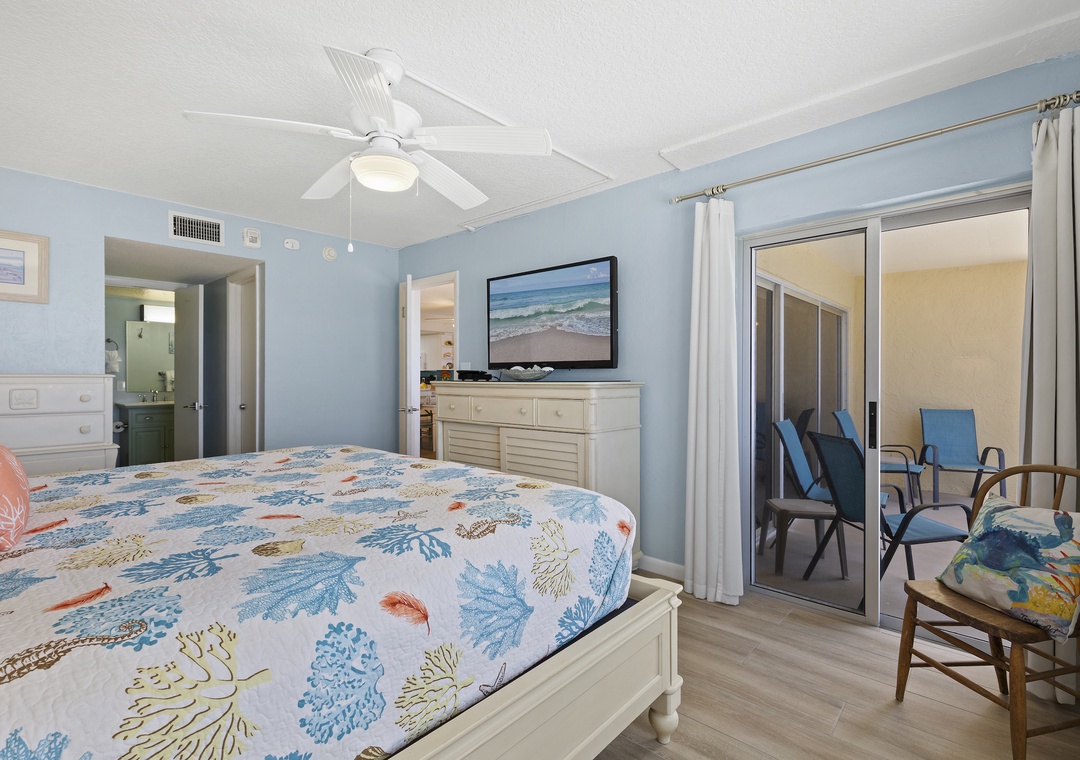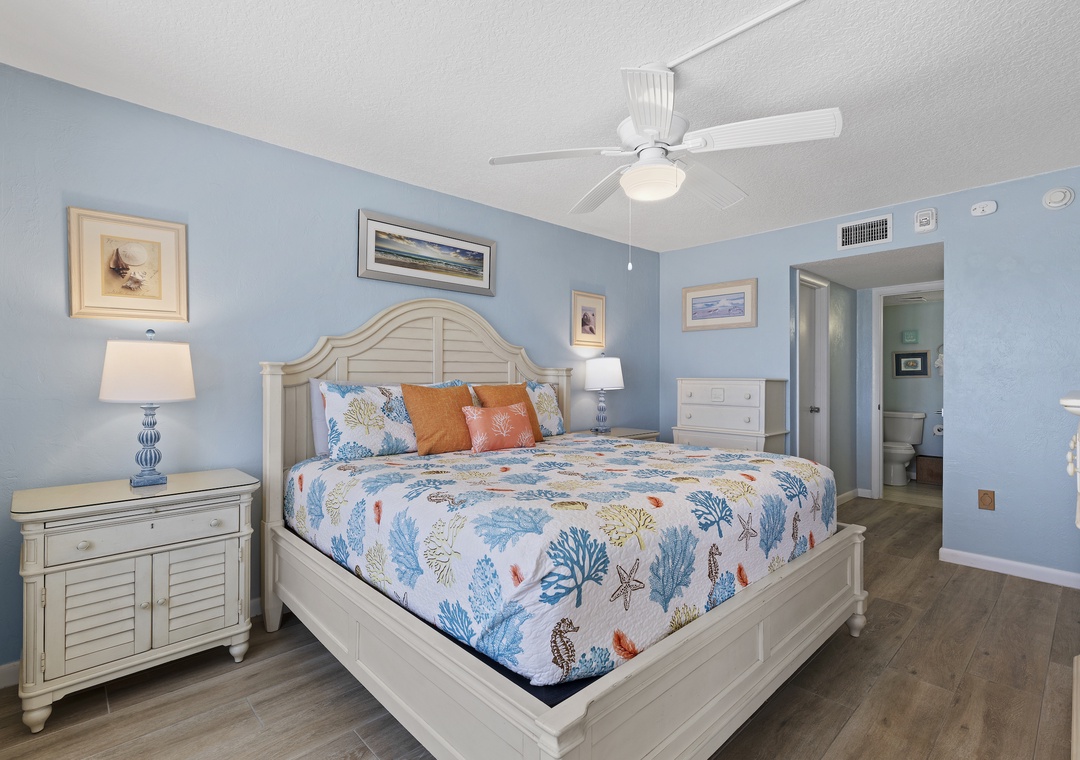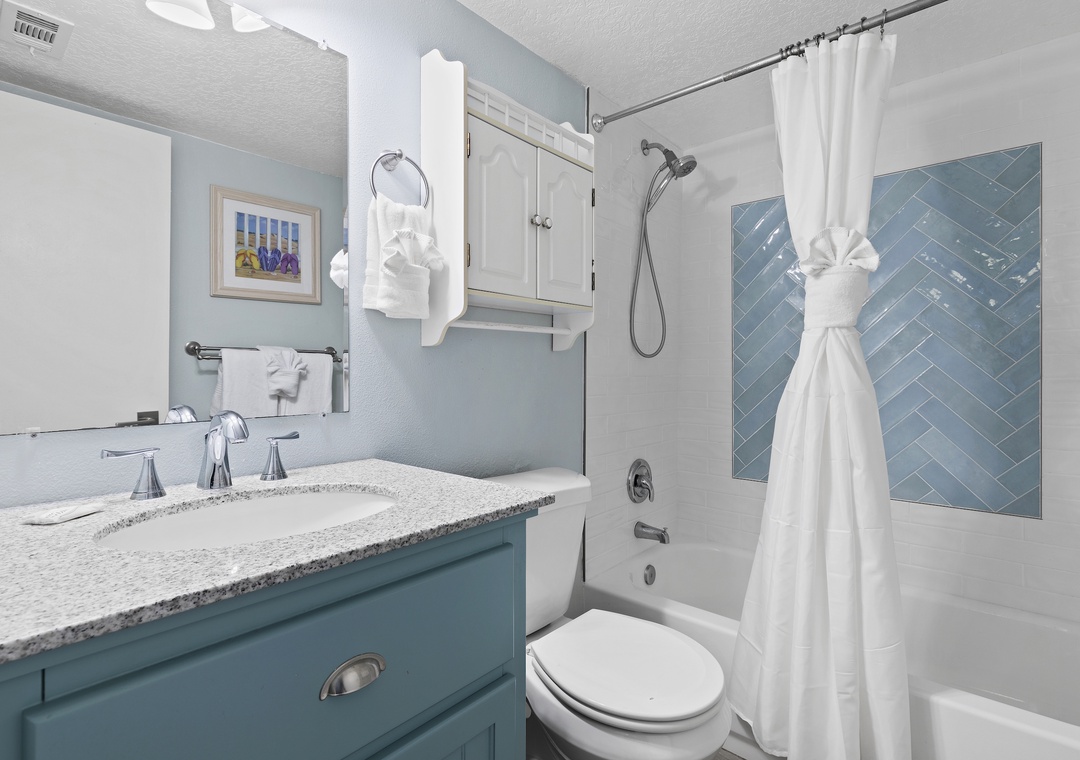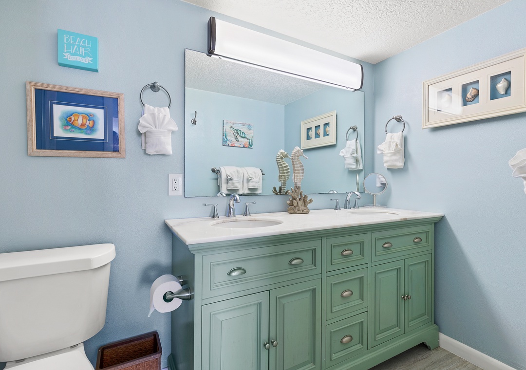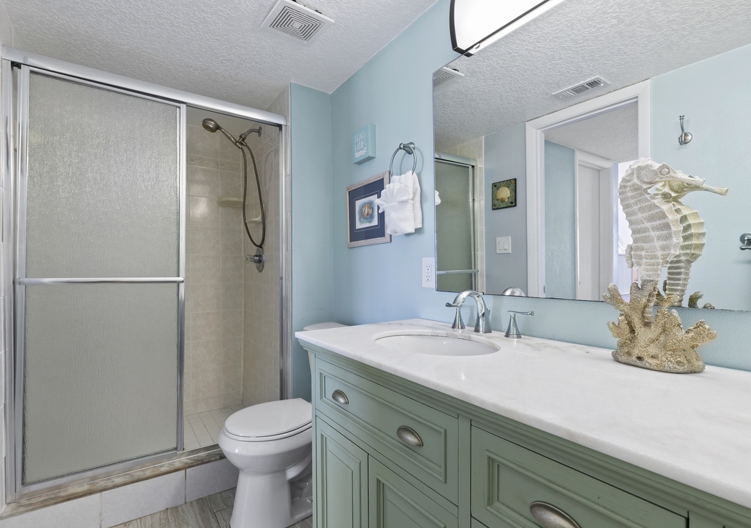 When your eyes grow weary from a day of fun, retreat to the primary bedroom for R&R. This suite is arrayed in teal tones, light furniture, and soft linens on the king bed. In the morning, you'll have the privilege of waking up with the sun as the window looks onto the ocean's horizon. A large flat-screen TV is provided so you can get ready with your favorite morning show. The primary bathroom continues the quaint, beachy theme and has a walk-in shower and double vanity with granite countertops.