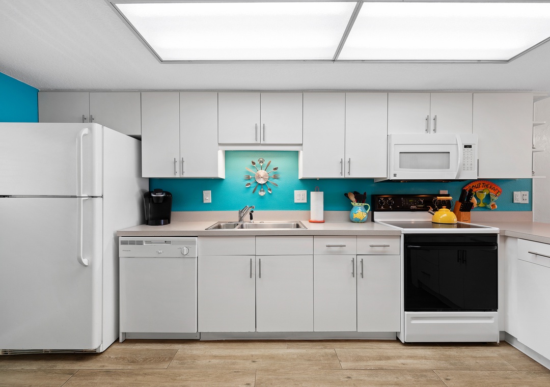 As the entryway opens up to a spacious kitchen, hold off on unpacking and grab a light snack instead. Crisp white cabinets and appliances contrast against a vibrant blue wall making this space both playful and clean. Whether you brew a cup of coffee in the Keurig, make tea with the kettle, or show off your skills with a gourmet dish, you'll find the kitchen equipped with every essential you need.