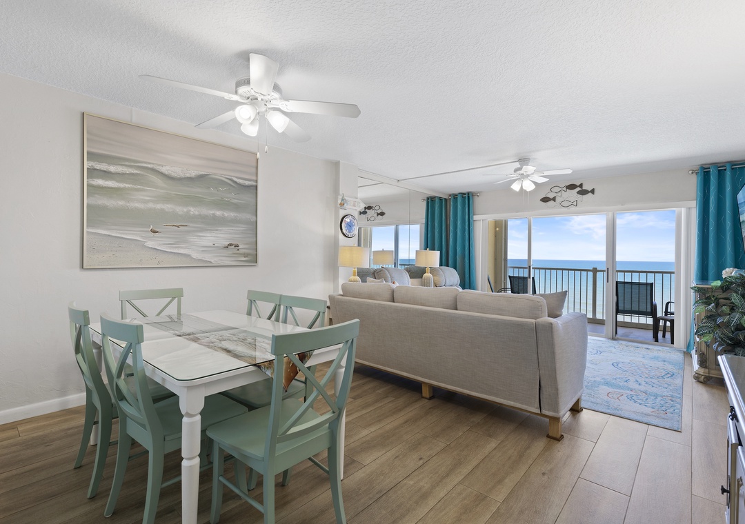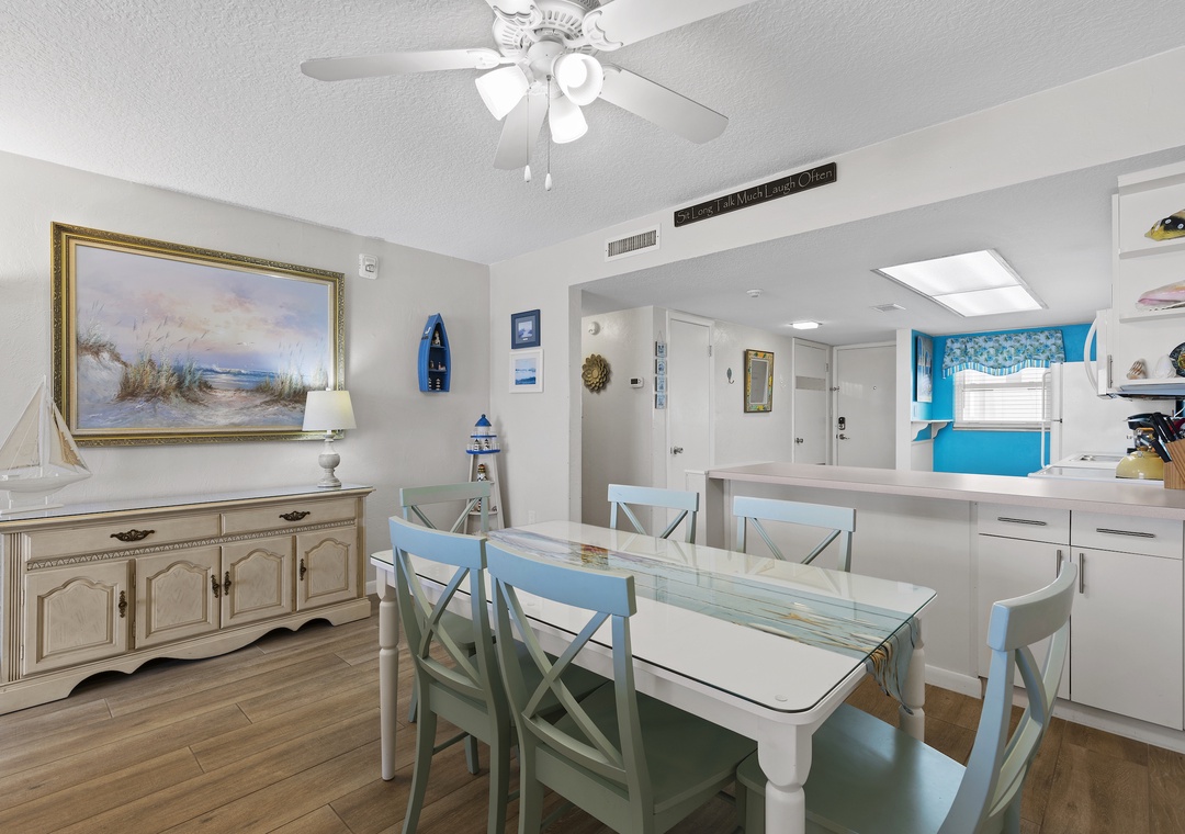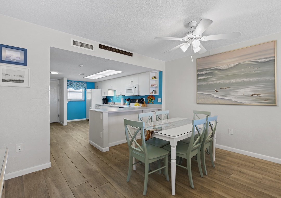 Spend quality time with the people you love by enjoying meals together around the dining room table. With seating for six, this shabby chic table provides the opportunity to eat, laugh, and reminisce together… all to an ocean view!