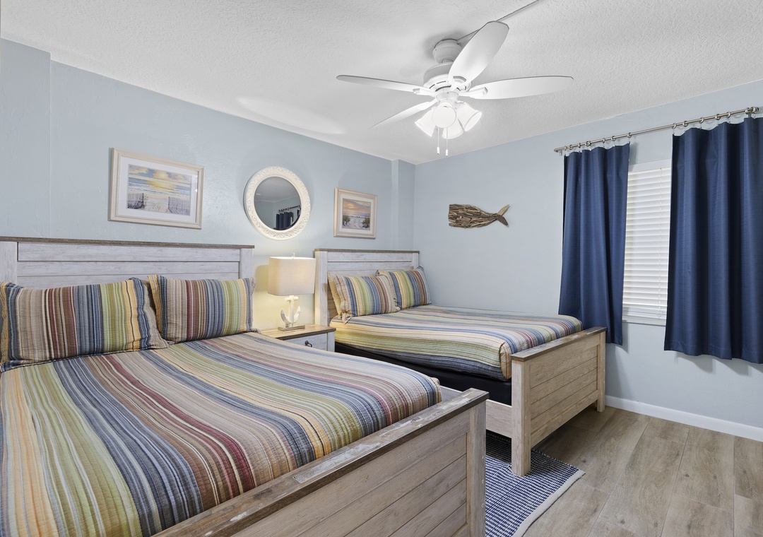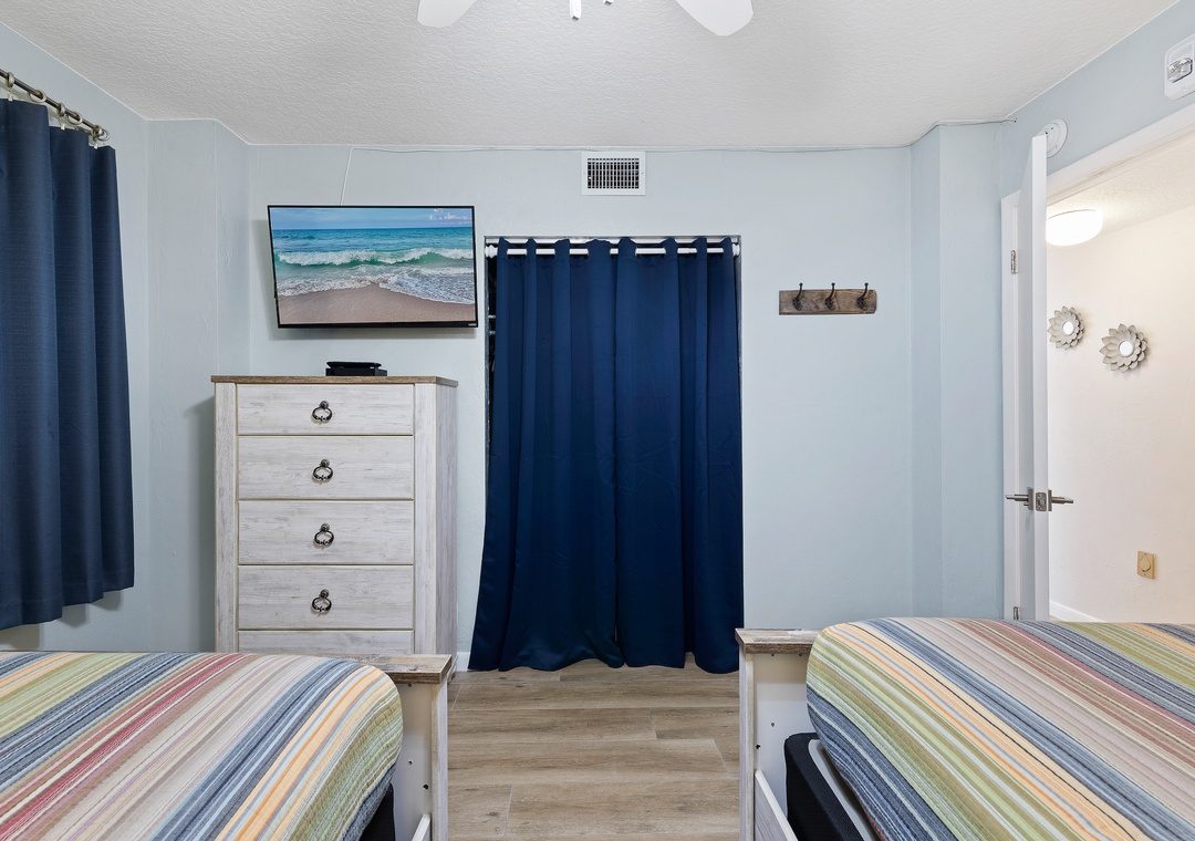 Your family won't envy your primary suite as the second bedroom is just as tastefully decorated. From high-end furniture with a coastal weathered look to beautiful bedding on the two full beds, this bedroom is magazine-worthy. Guests will also find a dresser and flat-screen TV provided. The nearby second bathroom accommodates with a standard bathtub, teal vanity, and plenty of soft bath towels.