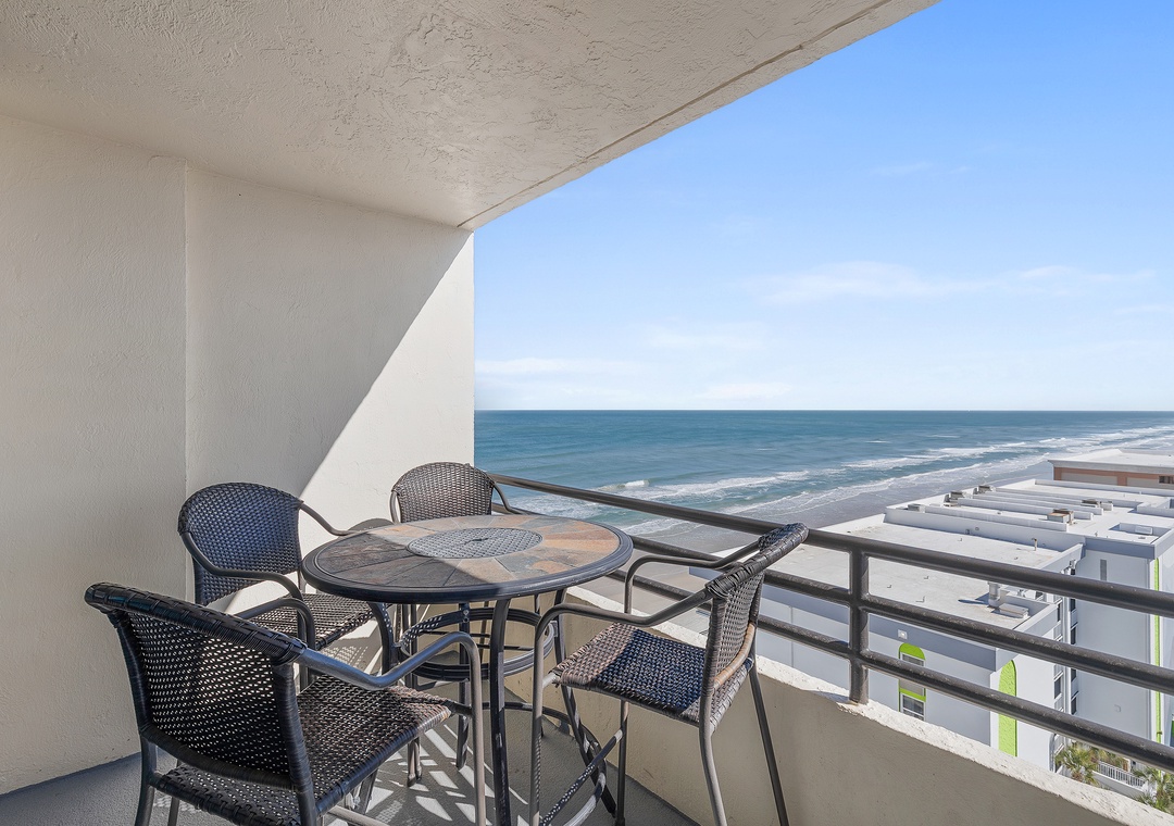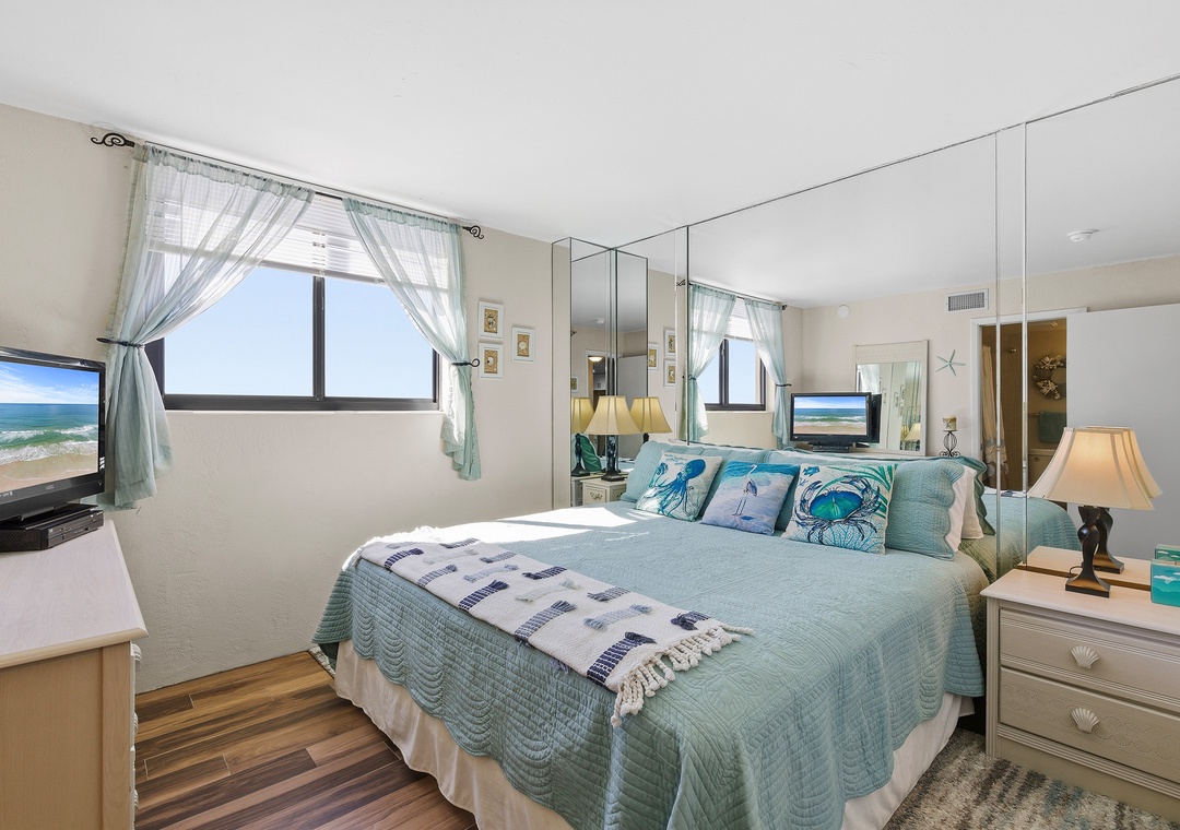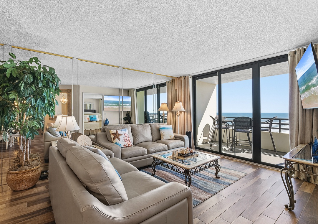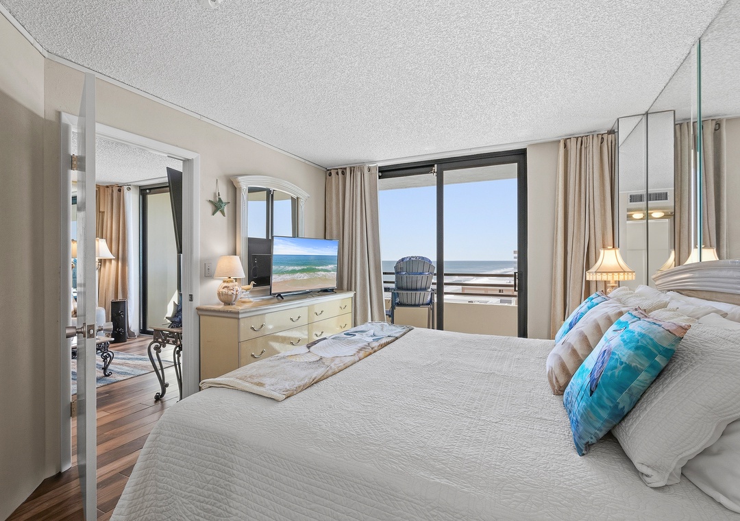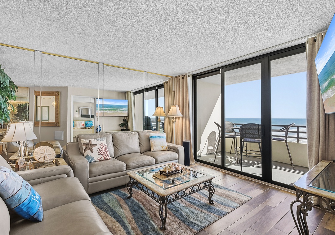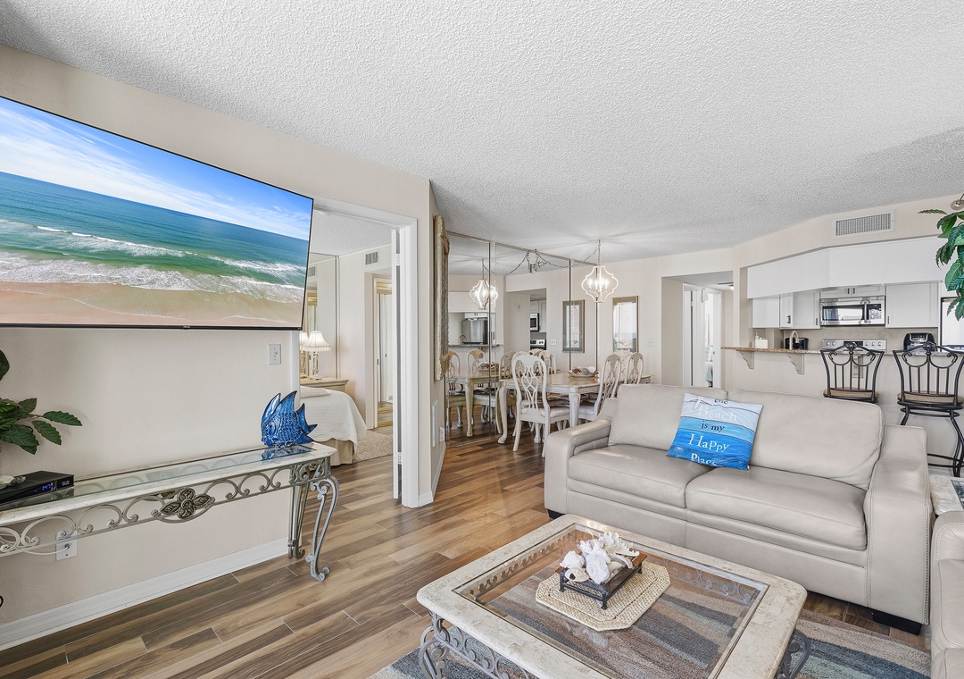 This 2-bedroom, 2-bath condo in Daytona Beach Shores offers wide, scenic ocean views and is thoughtfully designed to capture natural light and relaxed coastal living. The primary suite features a king bed, TV, private ensuite bath with shower, and direct access to the balcony, while the ensuite bathroom includes intracoastal views through a window that fills the space with daylight. The guest bedroom offers a king bed and TV, along with an ensuite bathroom with a tub/shower combination and convenient hall access. The open-concept kitchen is fully equipped with stainless steel appliances, a multi-function Keurig with both drip and K-Pod capability, and an air fryer, flowing seamlessly into the living and dining areas where reflective accents enhance brightness and highlight beautiful ocean views. The living room includes comfortable leather seating, a TV, and a queen sleeper sofa, with sliding doors leading to a spacious balcony overlooking both the ocean and intracoastal, furnished with a table, chairs, and two high-top Adirondack chairs for easy indoor-outdoor enjoyment. Additional features include dining seating for six, bar seating for three, an in-unit washer and dryer, and secure underground parking, making this condo a relaxed and inviting beachside retreat.