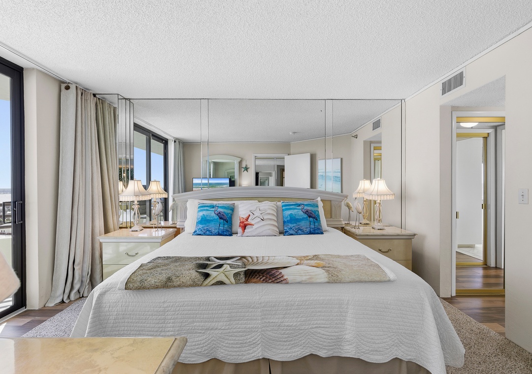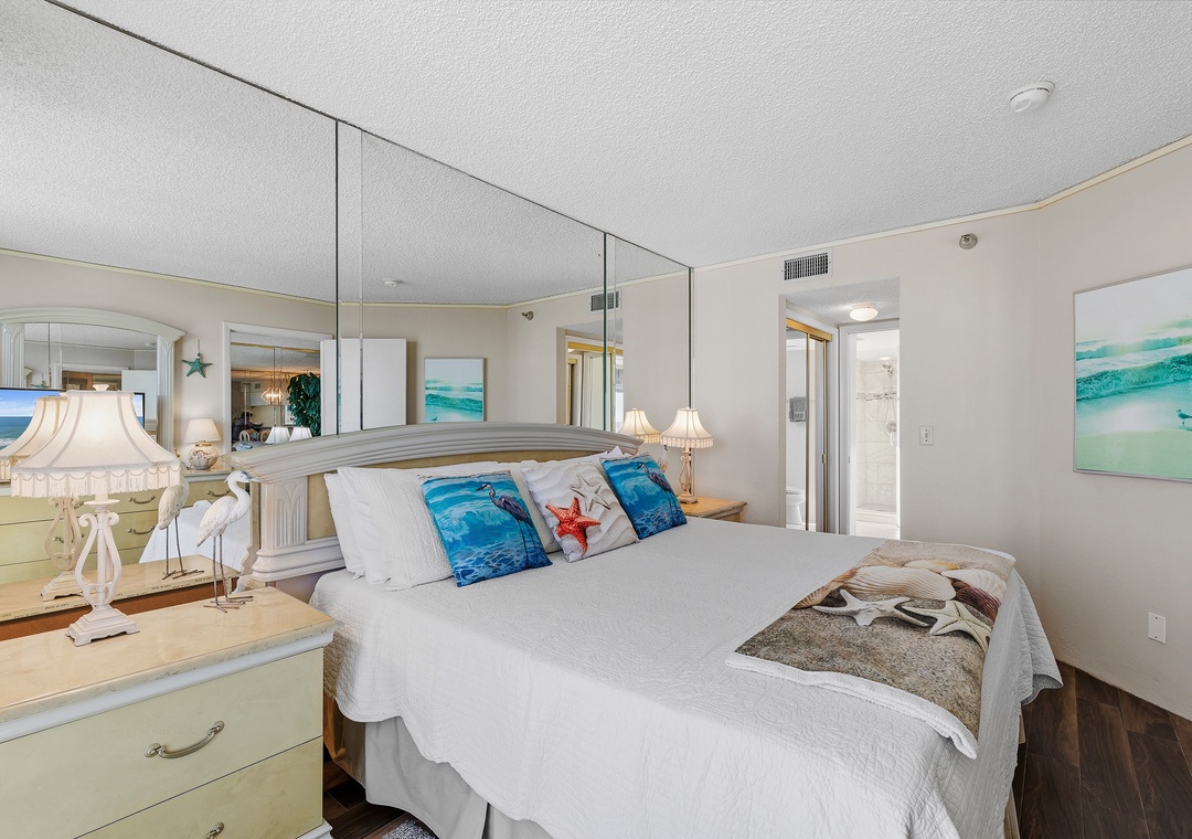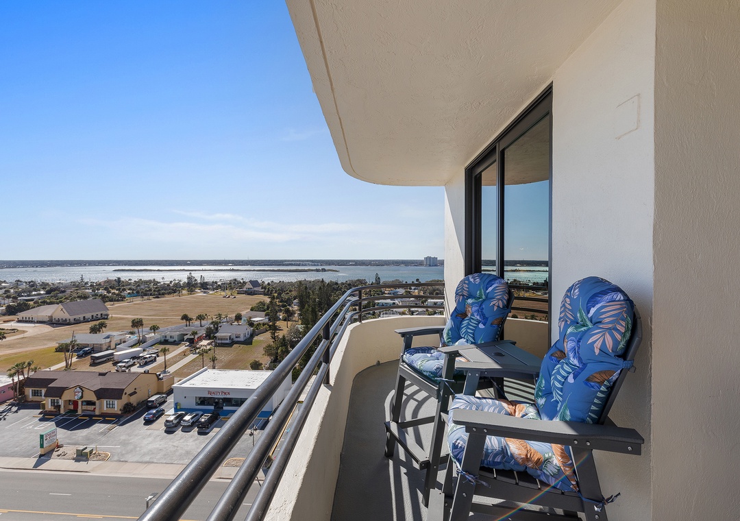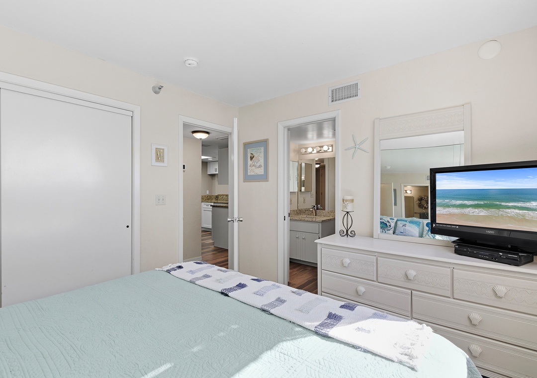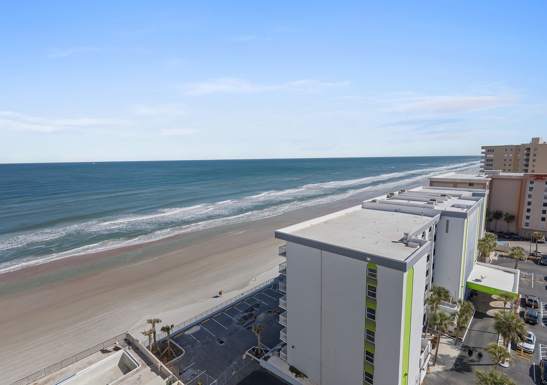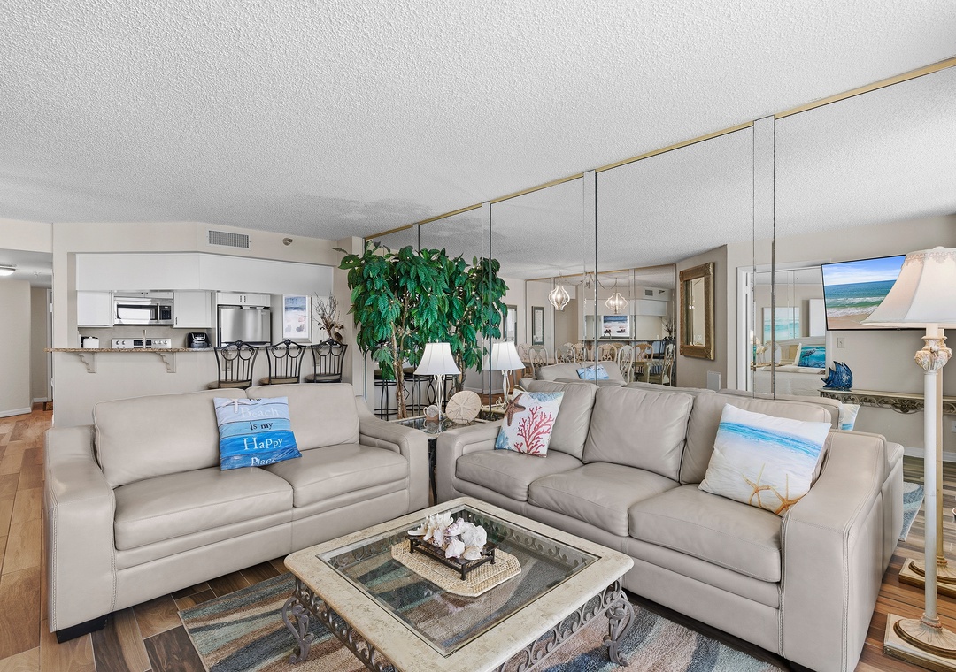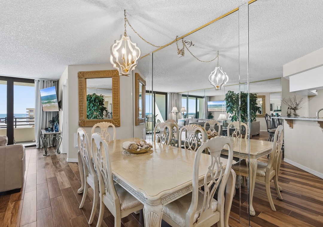 This 2-bedroom, 2-bath condo in Daytona Beach Shores offers wide, scenic ocean views and is thoughtfully designed to capture natural light and relaxed coastal living. The primary suite features a king bed, TV, private ensuite bath with shower, and direct access to the balcony, while the ensuite bathroom includes intracoastal views through a window that fills the space with daylight. The guest bedroom offers a king bed and TV, along with an ensuite bathroom with a tub/shower combination and convenient hall access. The open-concept kitchen is fully equipped with stainless steel appliances, a multi-function Keurig with both drip and K-Pod capability, and an air fryer, flowing seamlessly into the living and dining areas where reflective accents enhance brightness and highlight beautiful ocean views. The living room includes comfortable leather seating, a TV, and a queen sleeper sofa, with sliding doors leading to a spacious balcony overlooking both the ocean and intracoastal, furnished with a table, chairs, and two high-top Adirondack chairs for easy indoor-outdoor enjoyment. Additional features include dining seating for six, bar seating for three, an in-unit washer and dryer, and secure underground parking, making this condo a relaxed and inviting beachside retreat.