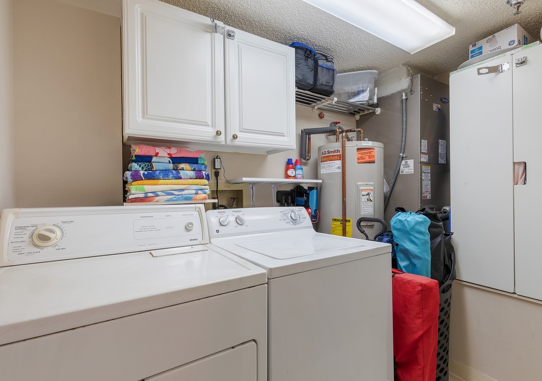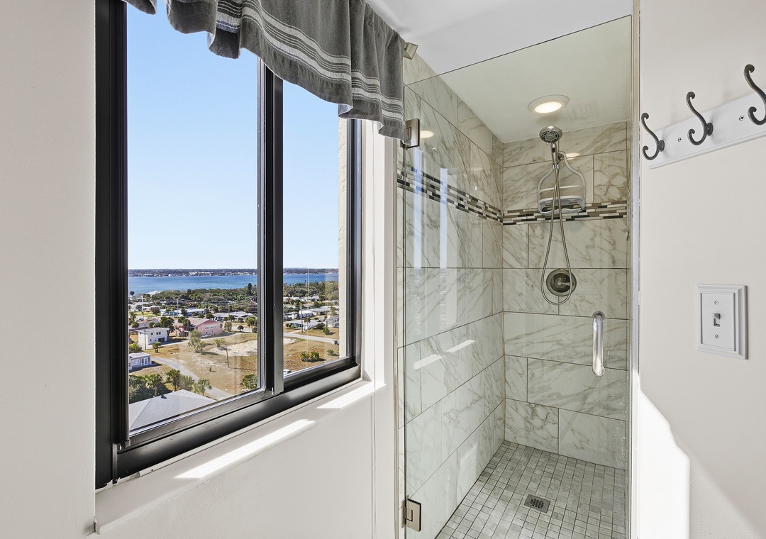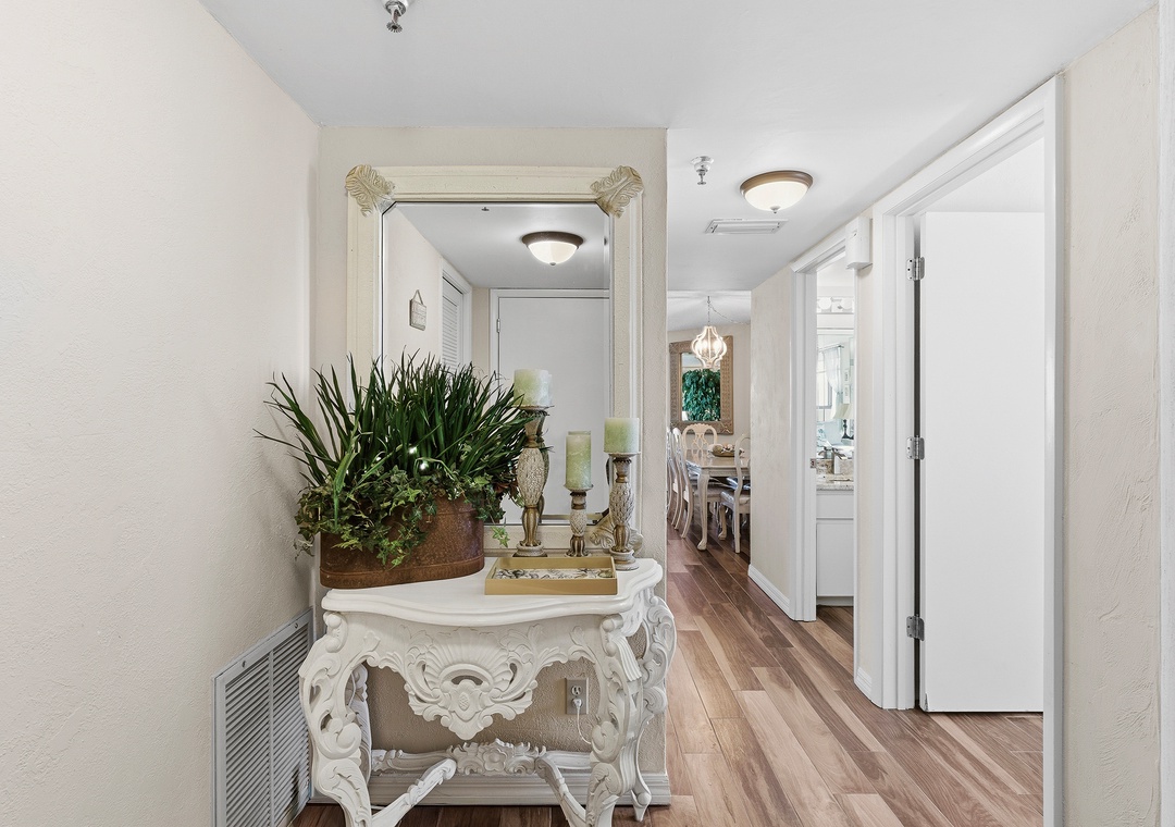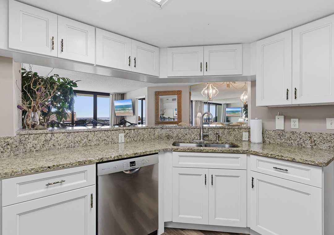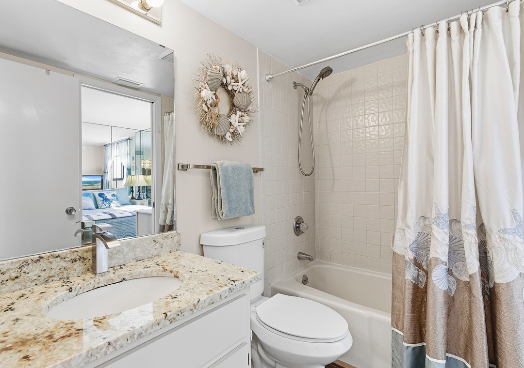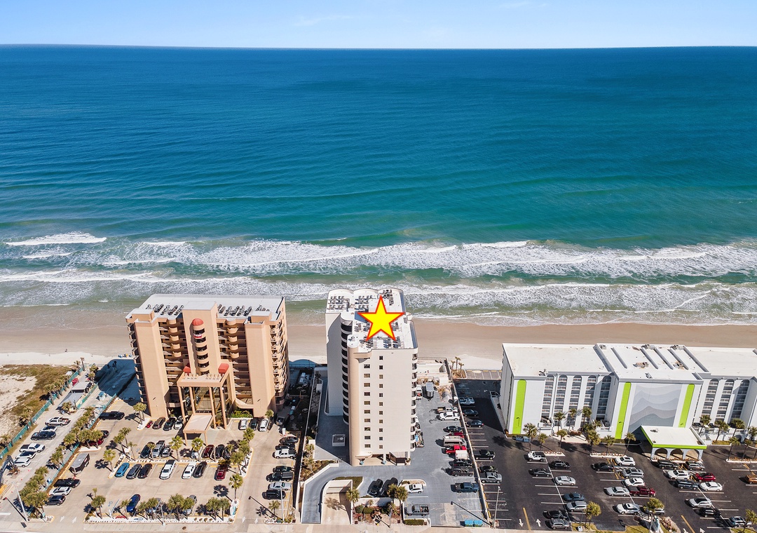 This 2-bedroom, 2-bath condo in Daytona Beach Shores offers wide, scenic ocean views and is thoughtfully designed to capture natural light and relaxed coastal living. The primary suite features a king bed, TV, private ensuite bath with shower, and direct access to the balcony, while the ensuite bathroom includes intracoastal views through a window that fills the space with daylight. The guest bedroom offers a king bed and TV, along with an ensuite bathroom with a tub/shower combination and convenient hall access. The open-concept kitchen is fully equipped with stainless steel appliances, a multi-function Keurig with both drip and K-Pod capability, and an air fryer, flowing seamlessly into the living and dining areas where reflective accents enhance brightness and highlight beautiful ocean views. The living room includes comfortable leather seating, a TV, and a queen sleeper sofa, with sliding doors leading to a spacious balcony overlooking both the ocean and intracoastal, furnished with a table, chairs, and two high-top Adirondack chairs for easy indoor-outdoor enjoyment. Additional features include dining seating for six, bar seating for three, an in-unit washer and dryer, and secure underground parking, making this condo a relaxed and inviting beachside retreat.