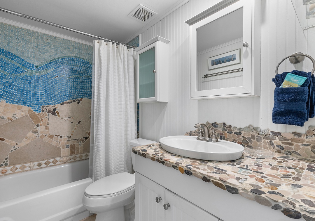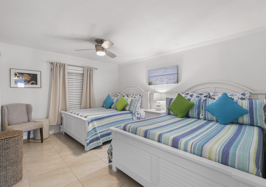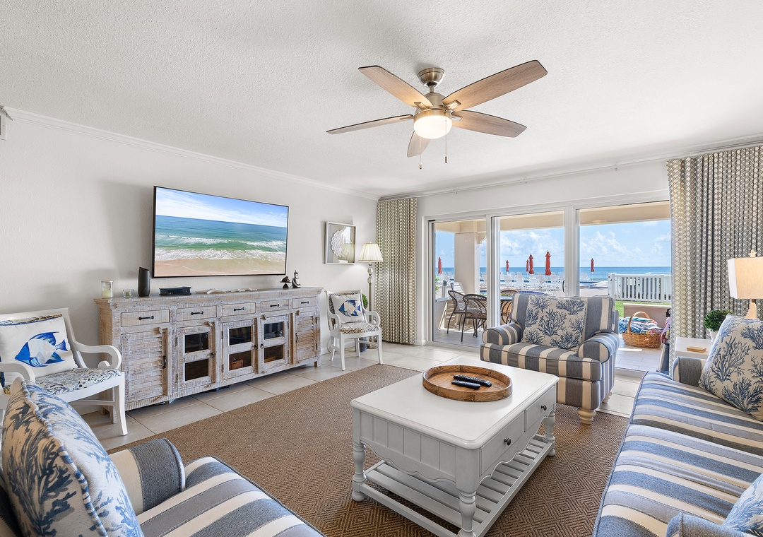 Welcome to Sandpiper 108! This beautifully renovated condo is light, bright, and airy, styled in fresh coastal décor with nautical navy and crisp white accents paired with soft neutrals for a relaxed seaside vibe. From the living room and primary suite, guests can enjoy spectacular ocean views that create the perfect backdrop for a memorable stay, while comfortable furnishings invite you to unwind as you listen to the waves rolling along the shoreline. The bed setup includes a primary bedroom with a king-size bed and spa-like bathroom, and a guest bedroom with two queen beds.