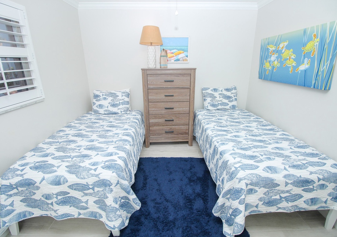 The primary suite is a tranquil escape with a king-sized bed and a private ensuite bathroom, offering both comfort and privacy after a long day in the sun. The guest bedroom is equally inviting, featuring two twin beds perfect for families or friends traveling together. Each room is tastefully decorated in soothing coastal tones, creating a relaxing beach house atmosphere throughout the condo.