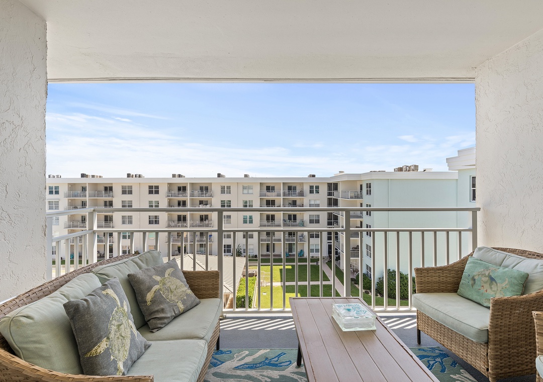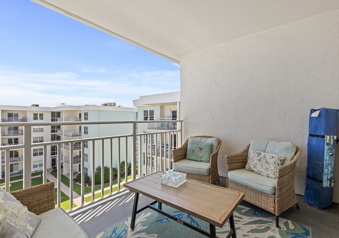 Sea Coast Gardens II 513 is an impeccably decorated ocean-view 2-bedroom 2-bathroom condo. The first thing that you'll notice is the brilliant golden wood floors throughout the home. As you enter the condo, you'll be captivated by the gorgeous, recently renovated Kitchen with stainless steel appliances, that will have everything you need to prepare a delicious meal. From this private balcony, you can see Sea Coast Gardens' two pools, the shuffleboard courts, and the white sands of New Smyrna Beach beyond. Watch the waves wash against the shore as you feel the salty wind on your skin. The balcony has a lounge chair and two sitting chairs. Here you can enjoy a novel in peace and still be able to keep an eye on the kids in the pool! The primary bedroom has a king bed, guest bedroom has a queen bed and a sleeper sofa in the living room, making this condo sleep 6. Come see why the fun never stops at Sea Coast Gardens II 513!