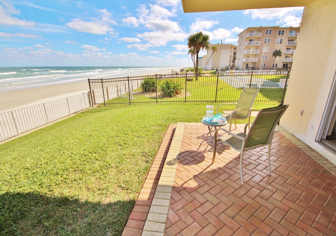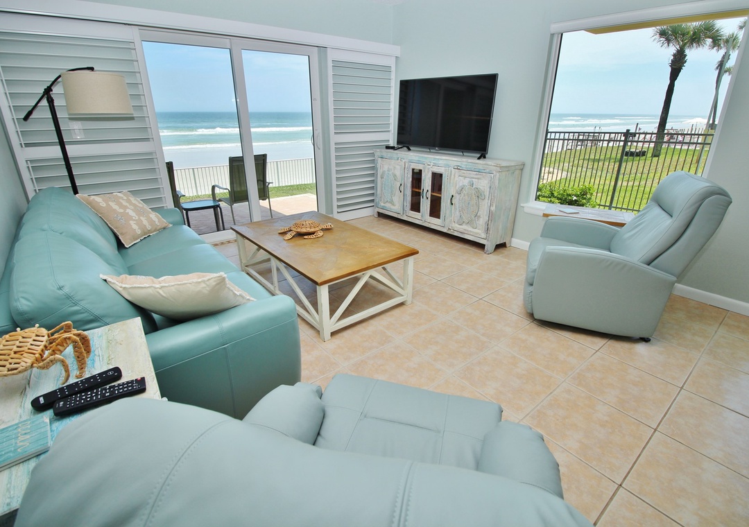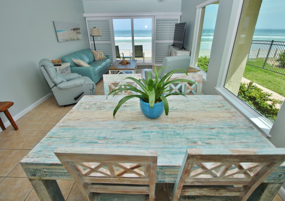 This ground-floor corner condo offers true oceanfront living on New Smyrna Beach’s sought-after non-driving shoreline. With unobstructed views of the Atlantic, the bright and welcoming living area opens directly to a private patio where you can enjoy ocean breezes, sunrise views, and the soothing sound of the waves. The condo features a full kitchen and an open, comfortable layout, making it easy to relax and settle in for a carefree beach stay.
