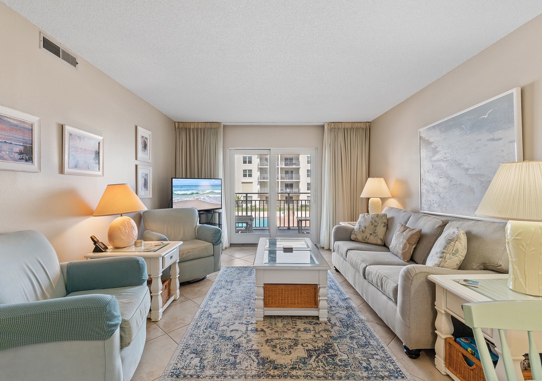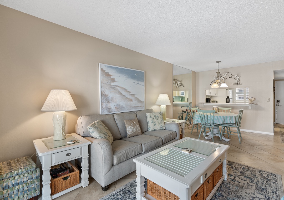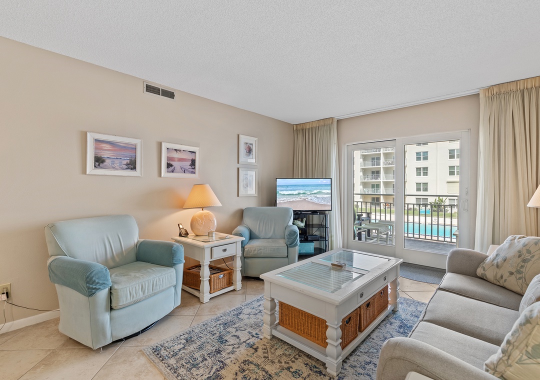 Upon entering Sea Coast Gardens III 208 you will be instantly relaxed by the coastal color palate. Enjoy the comfortable and stylish furniture in the living room as you and your family gather around the large 42" flat-screen television to watch your favorite TV show or pop in a DVD or Blu-Ray. Prepare a fancy feast for the entire family or pop a quick bag of popcorn in your fully equipped kitchen. Complete with everything you'll need, this kitchen will make masterpieces a breeze. Enjoy pool views while sitting on your private balcony. When you are finished reliving all the events of the day, retire to your king master bedroom with gorgeous views of the beach! The second bedroom features two comfortable twin beds, a sleeper sofa in the living room, perfect for the rest of the family to enjoy. Come see why the fun never stops at Sea Coast Gardens III 208!