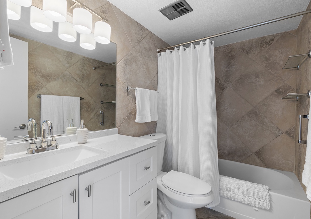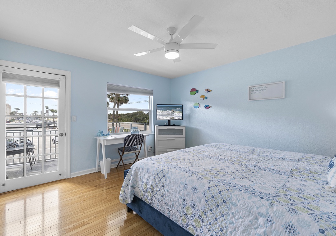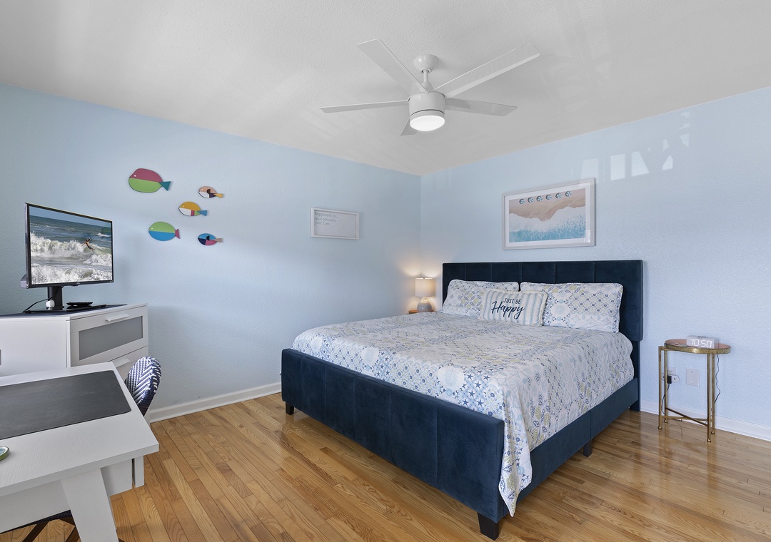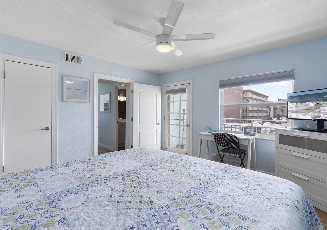 When at last your eyes grow weary from a day spent walking the shore and exploring Flagler Avenue, retire to the master bedroom that awaits you. This bedroom holds beautiful furniture pieces from the traditional era. Aside from the king sleigh bed, you'll also have an elegant vanity table, spacious dresser, and Smart TV to enjoy. The nearby bathroom accommodates with a standard bathtub, white vanity, and plenty of bath towels.
