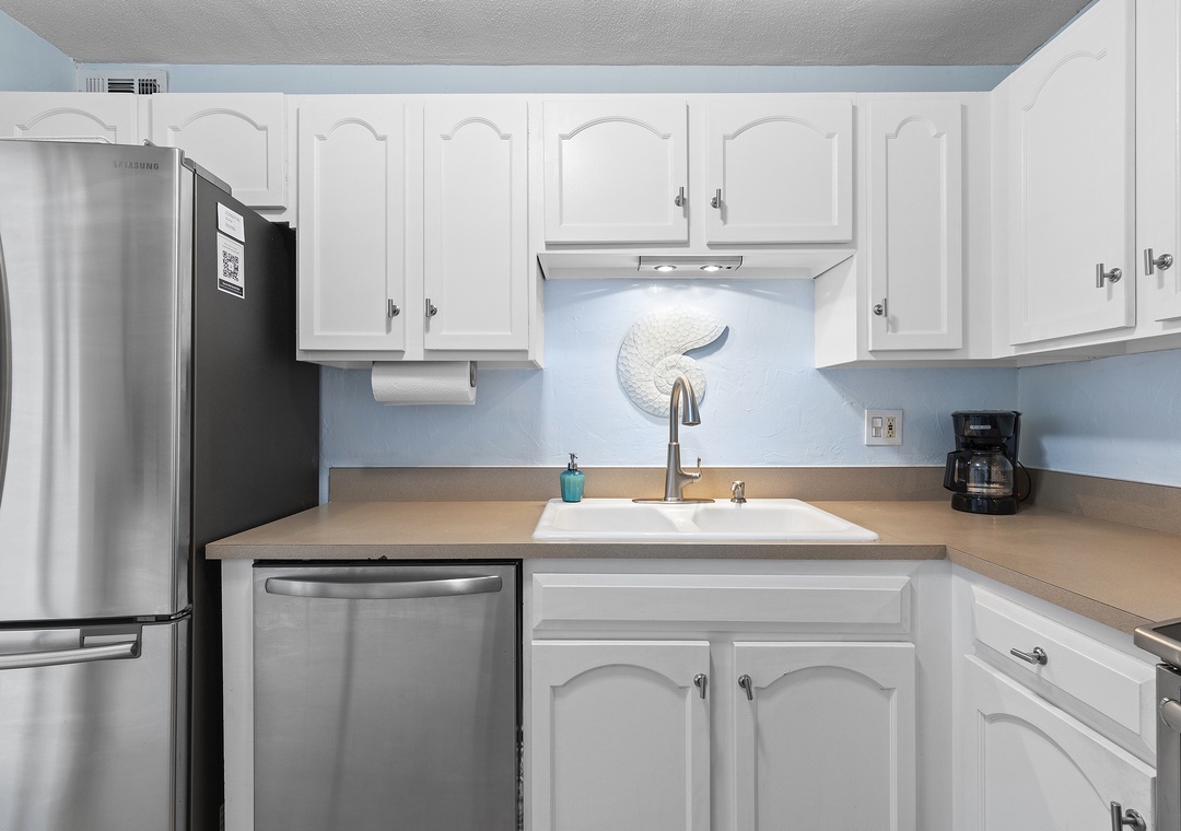 This condo is equipped with plenty of linens, towels, and all the conveniences of home to make your stay comfortable. There is wireless internet, cable, a Smart TV, a DVD player, a pull-out couch, a coffee maker, beach towels, a beach blanket, a designated parking space, and an outside storage locker stocked with beach chairs, umbrellas, kids beach toys, noodles, and coolers.