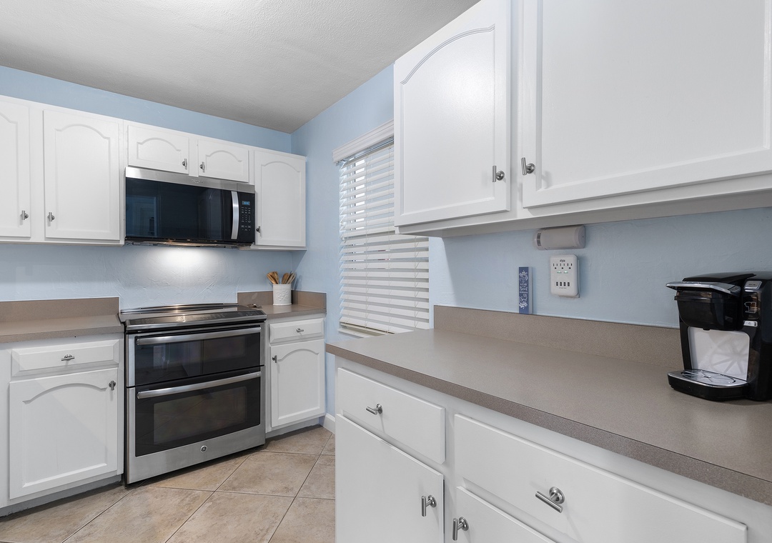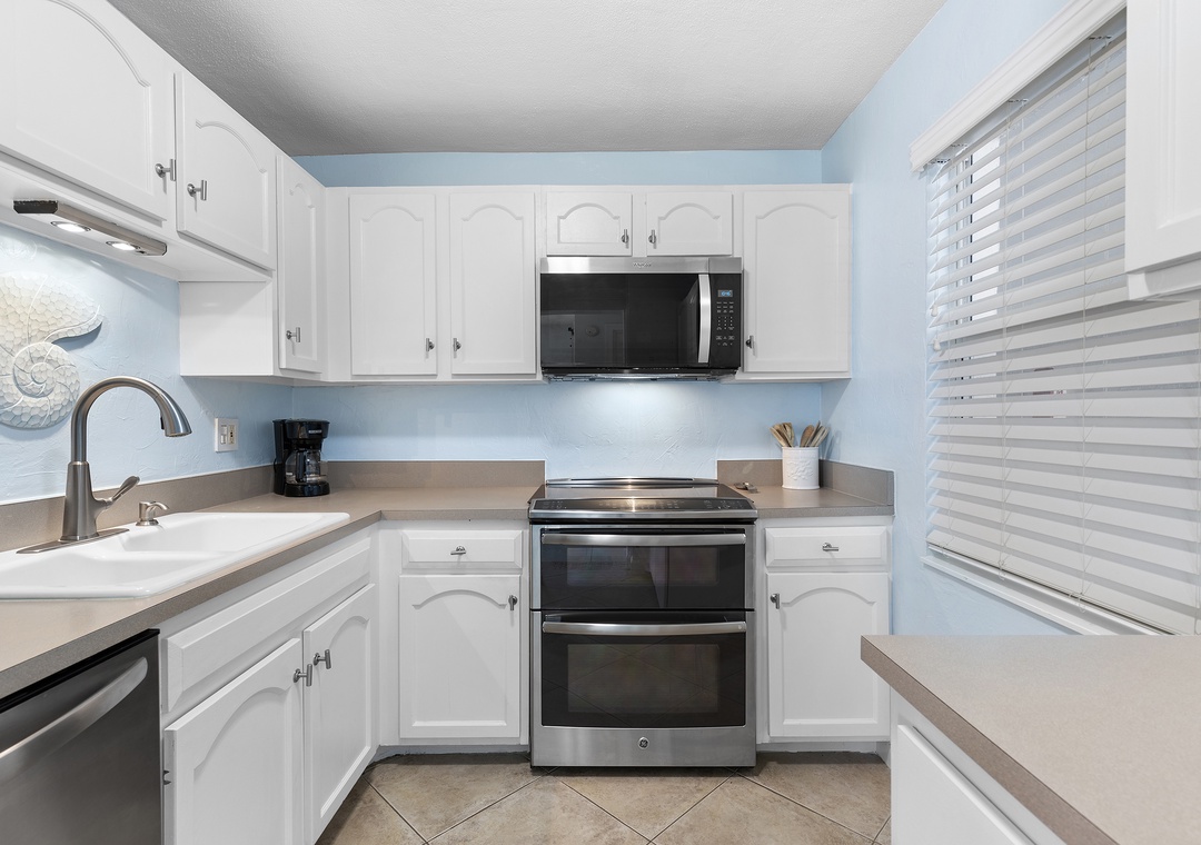Before you curl up with a good book in the living room, set your groceries down in the kitchen. With its white cabinetry, stainless steel appliances, and large tile flooring, this space boasts of a clean, updated look. Have your loved ones join you for a glass of wine and a relaxing evening cooking together. You'll find the cabinets and drawers fully equipped with kitchen essentials and ready to aid your culinary creativity.