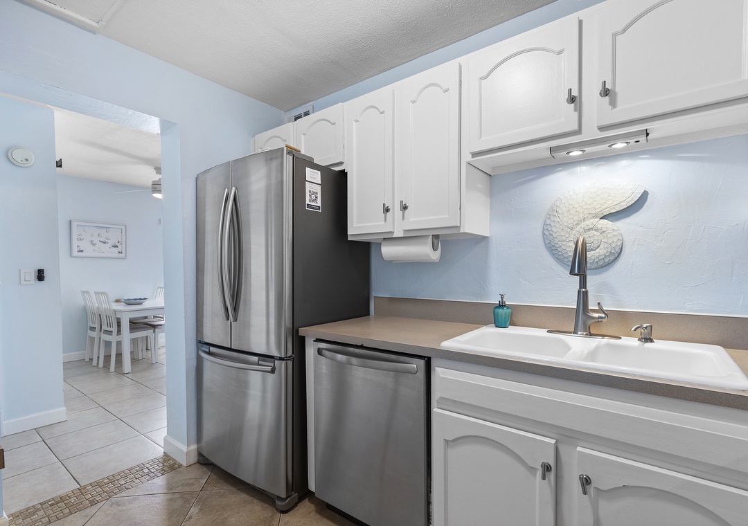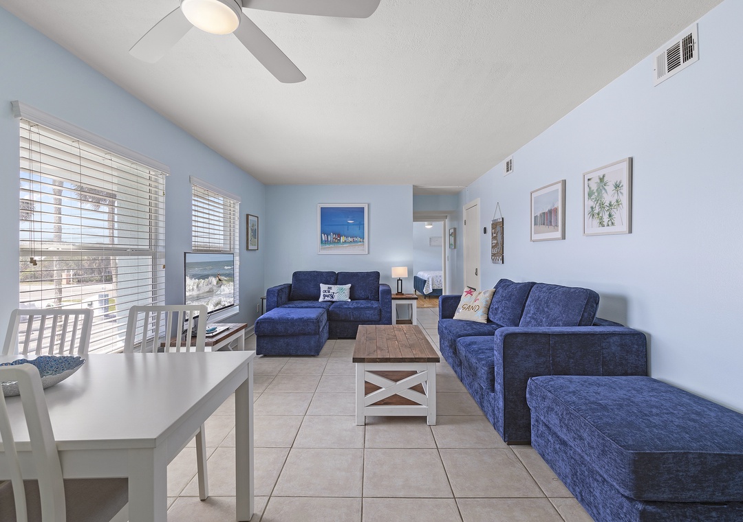 The condo's welcoming atmosphere quickly ushers you into vacation mode. Light tile flooring, sky blue walls, and warm leather furniture make this space feel bright yet cozy.