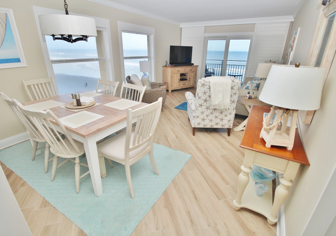 As you enter the beachside condo, the open floor plan combines the kitchen, dining room and living space. The fully-equipped kitchen boasts beautiful granite counter tops, stainless steel appliances and rustic white cabinetry. A pass through to the dining room makes for serving delicious meals that much easier. A large wooden table can be found in the dining room, and comfortably seats six. Views of the ocean can be seen through the large windows while enjoying a family meal.