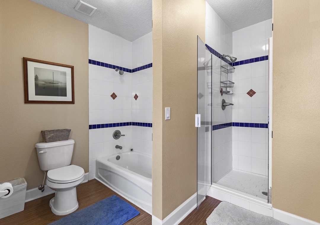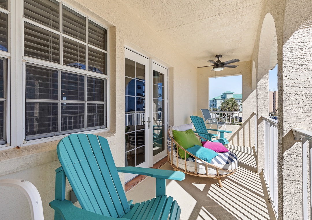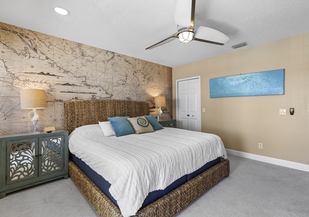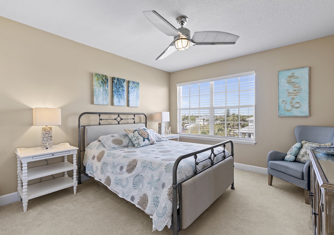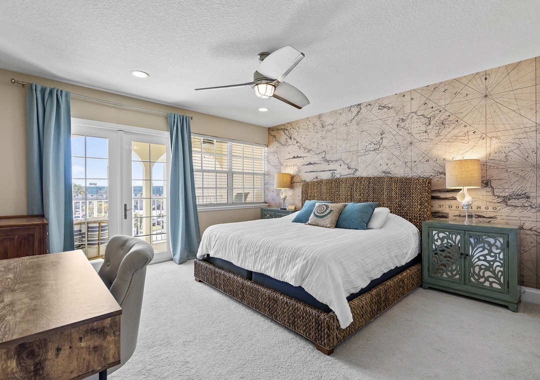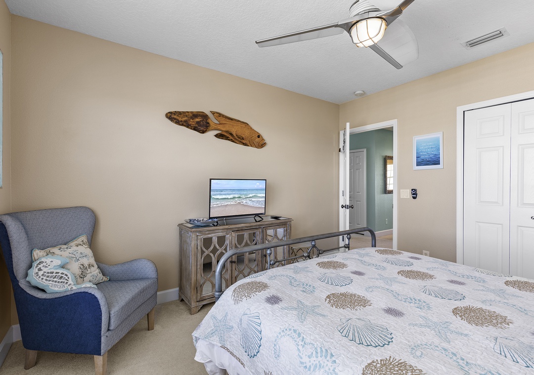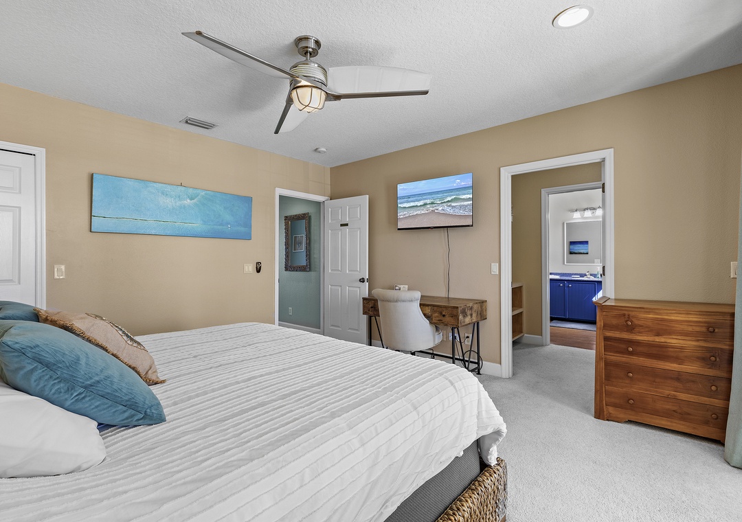 At the end of each fun-filled day, you'll be more than ready to retire. Those staying in the primary bedroom are in for a treat as it has a third-story view of the Atlantic! It accommodates two guests with a king bed, desk, private balcony, flat-screen TV, and a bathroom with a bathtub and walk-in shower.
