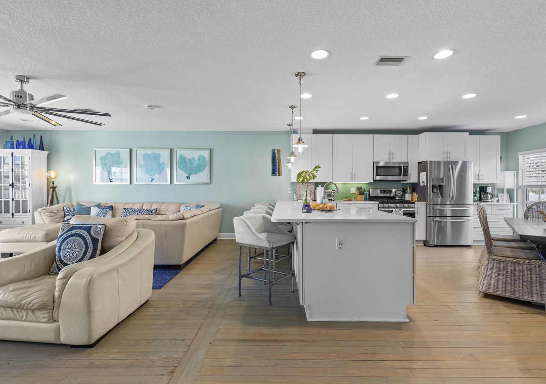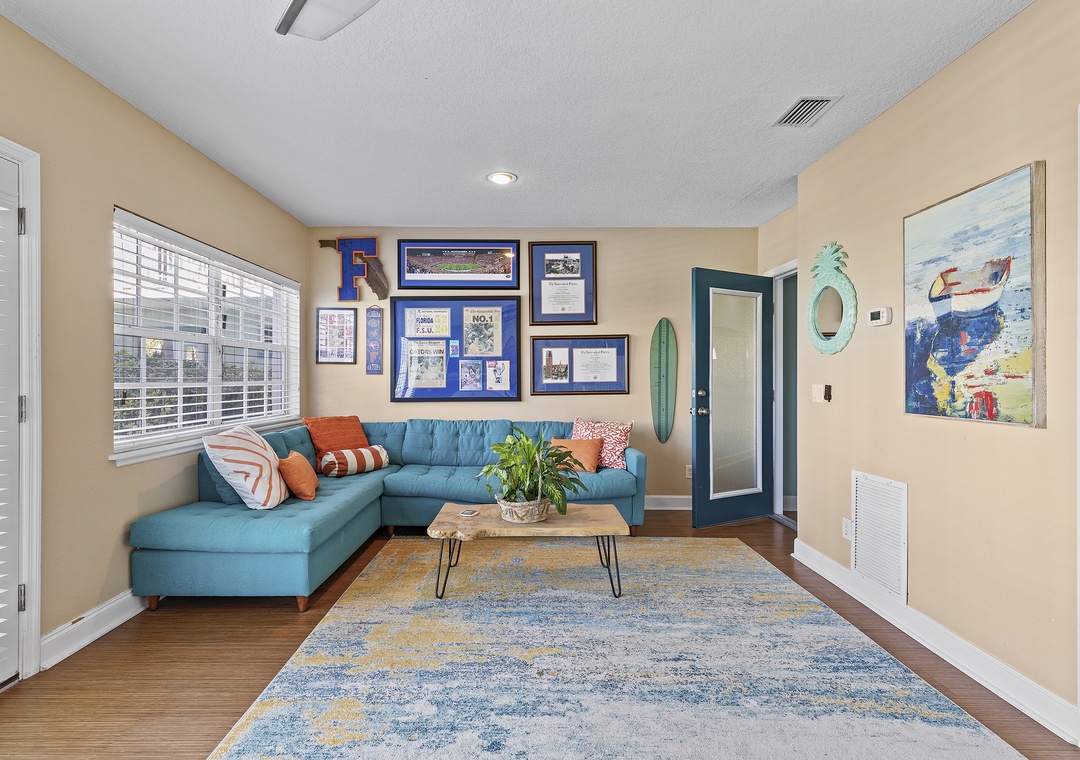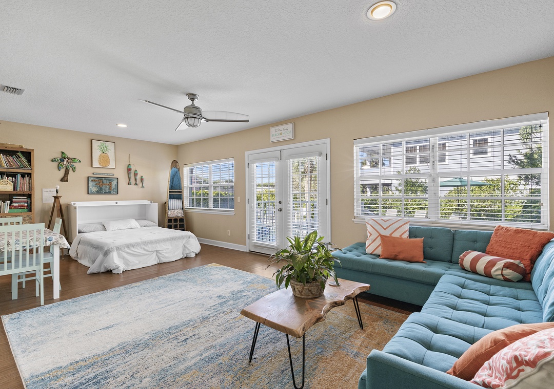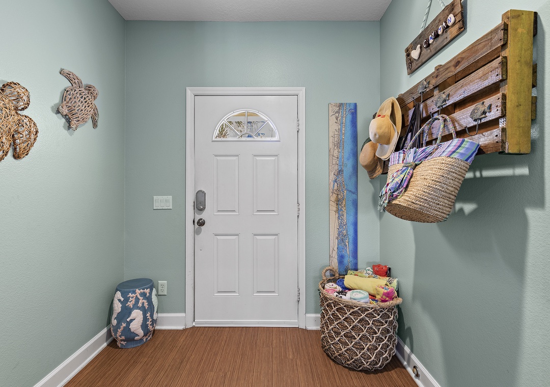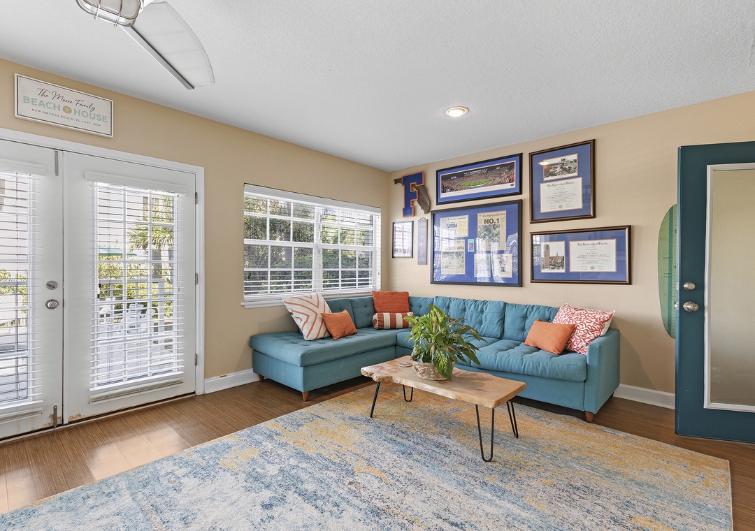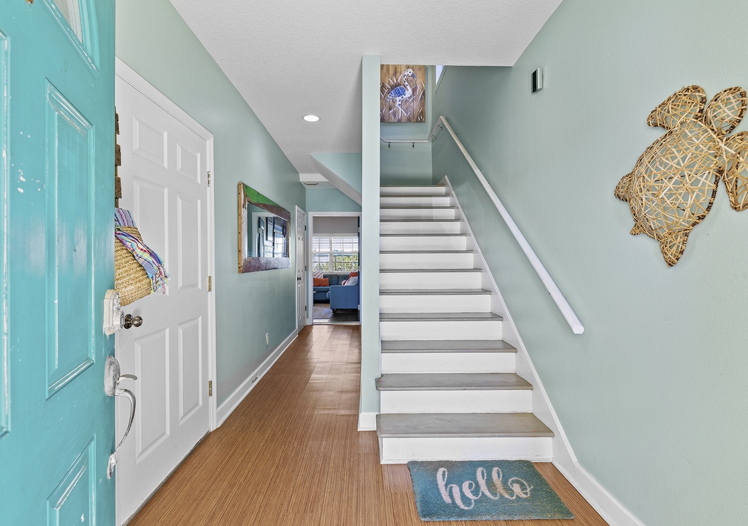 As you pull into the home's large driveway, you'll be delighted to start your vacation with a glimpse of the sea. The townhome resides next to a crosswalk that leads right to NSB's driving shore. Before you don your flip flops, take the time to unpack and explore inside. The front door ushers guests into the downstairs suite. You'll find it decorated with playful hues, comfortable seating, and even a dining table for four. The youngest in your group will claim this space as their own as it not only sleeps four, but also leads to the backyard pool. There is a queen murphy bed and a queen sleeper sofa. Guests can use the adjoining bathroom with a walk-in shower.