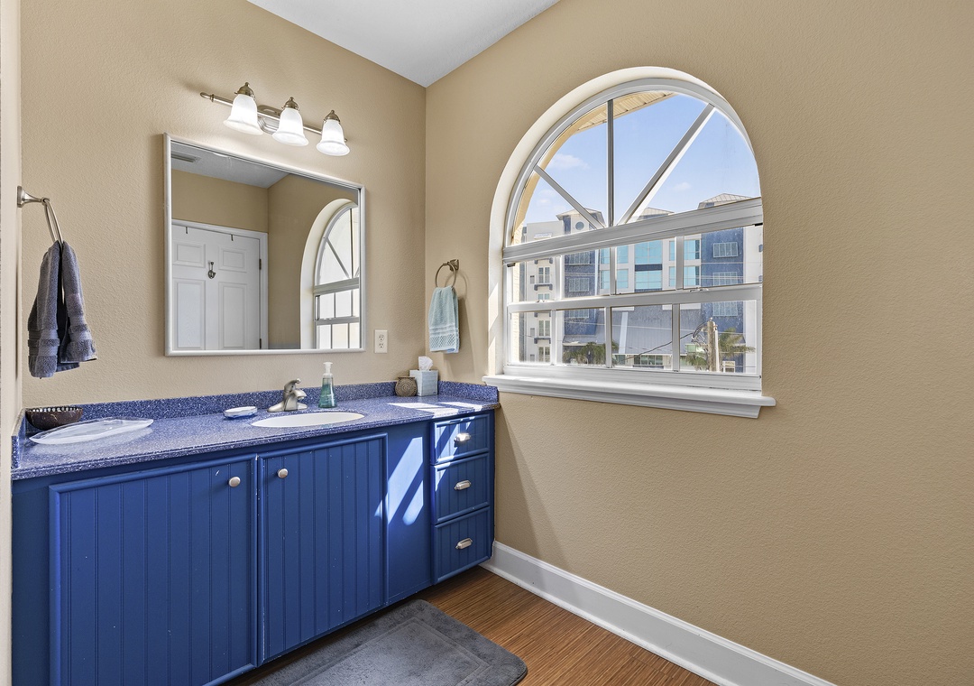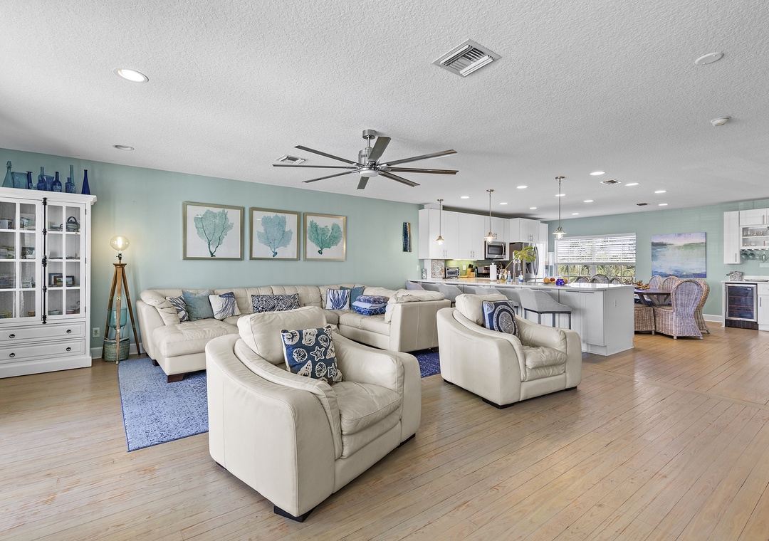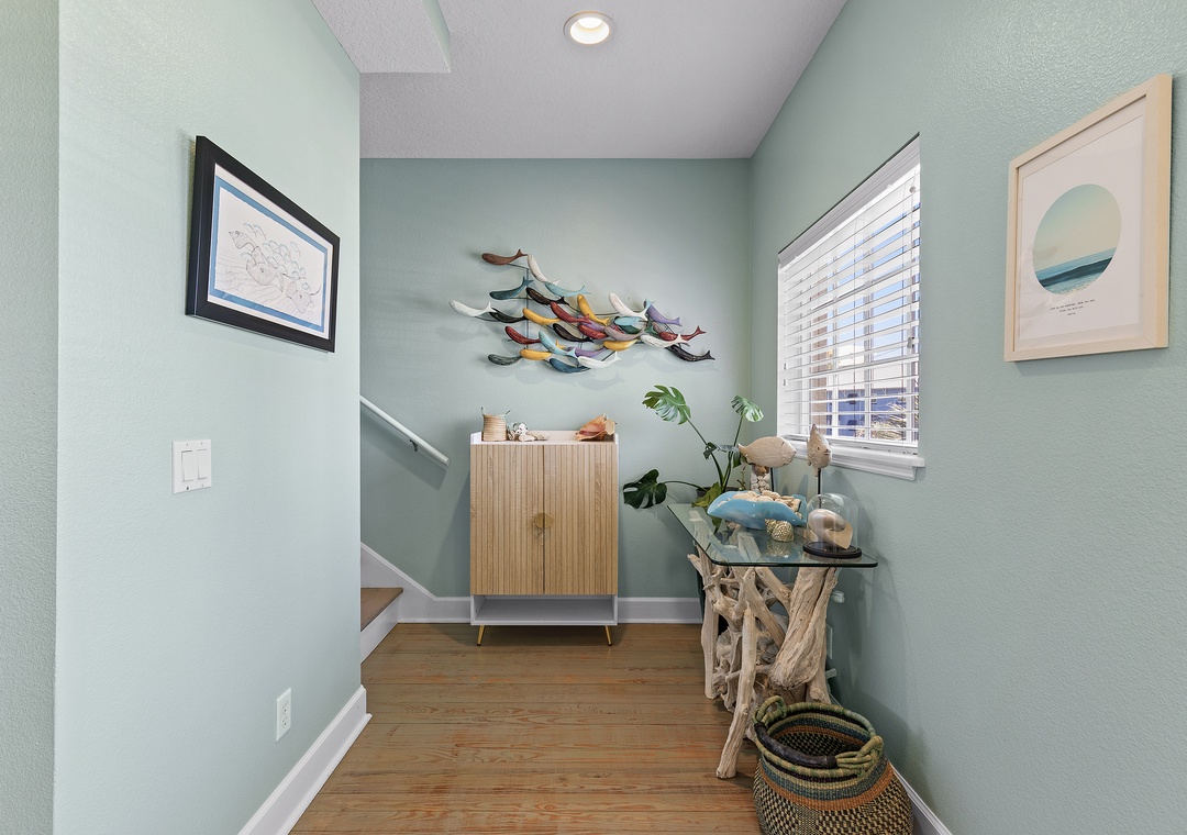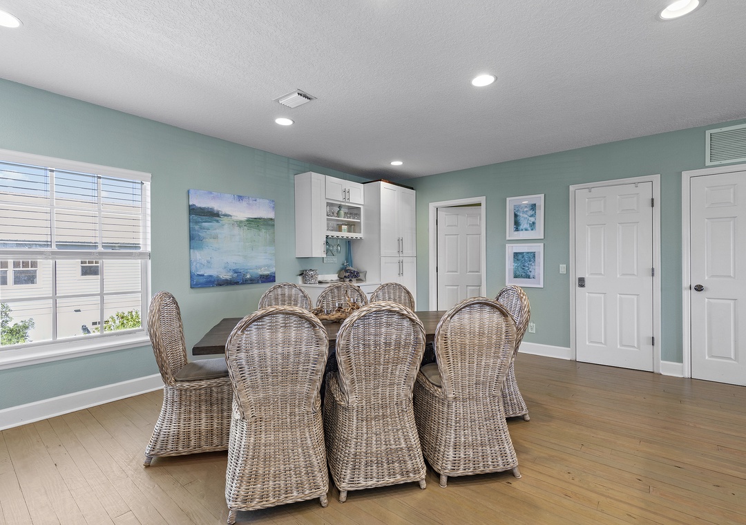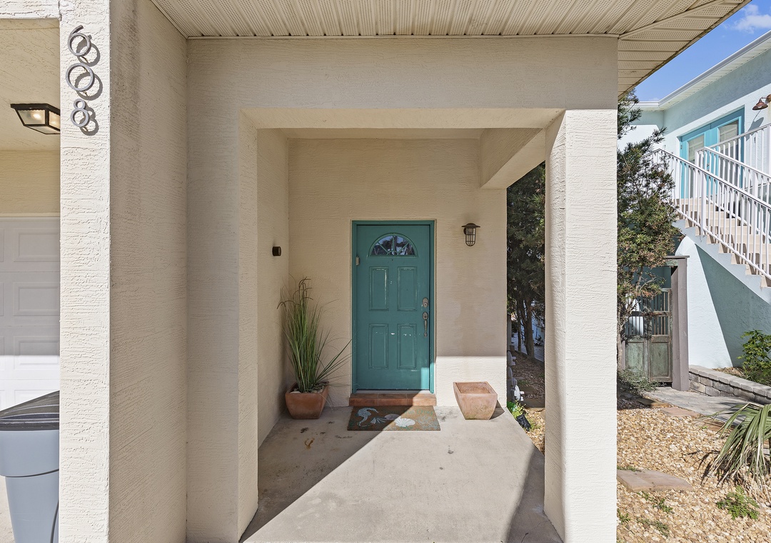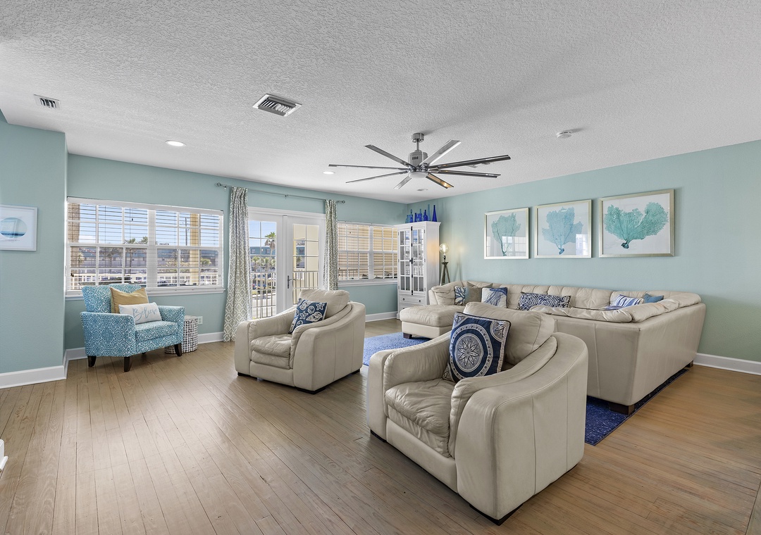 As you pull into the home's large driveway, you'll be delighted to start your vacation with a glimpse of the sea. The townhome resides next to a crosswalk that leads right to NSB's driving shore. Before you don your flip flops, take the time to unpack and explore inside. The front door ushers guests into the downstairs suite. You'll find it decorated with playful hues, comfortable seating, and even a dining table for four. The youngest in your group will claim this space as their own as it not only sleeps four, but also leads to the backyard pool. There is a queen murphy bed and a queen sleeper sofa. Guests can use the adjoining bathroom with a walk-in shower.