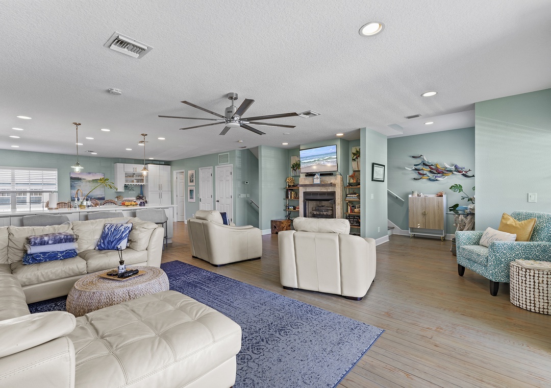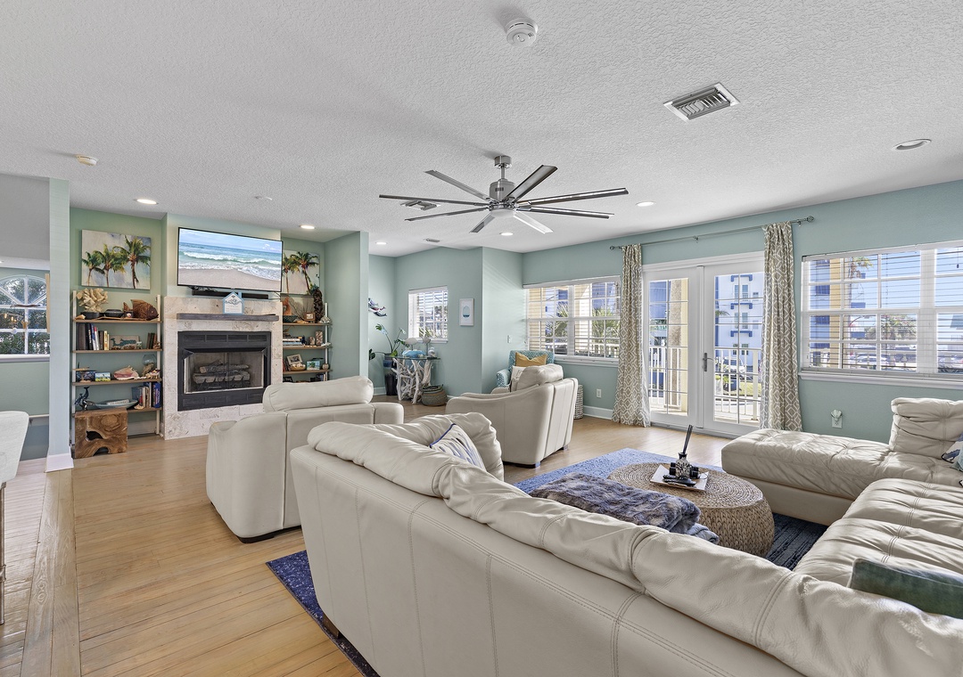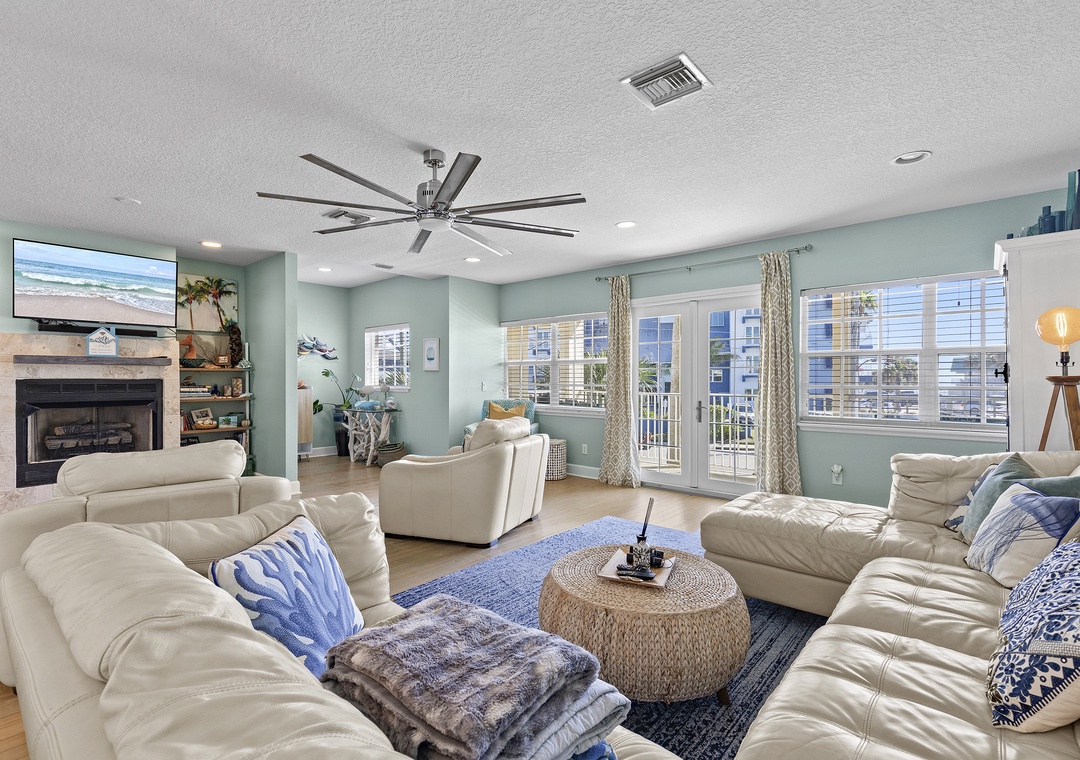 When it's time to eat, you have two seating options. Quick bites can be had at the breakfast bar for four, and formal sit-down meals can be enjoyed around the dining room table for eight. Pour yourself a glass of wine at the dry bar, and head to the living room for a chill night in. The living area is furnished with a large leather sectional and two armchairs. Once you sit down, you can relax to an ocean view, the warmth from the fireplace, and your favorite show playing on the 50" Smart TV. Those that prefer R&R outdoors can enjoy the evening on the furnished balcony.