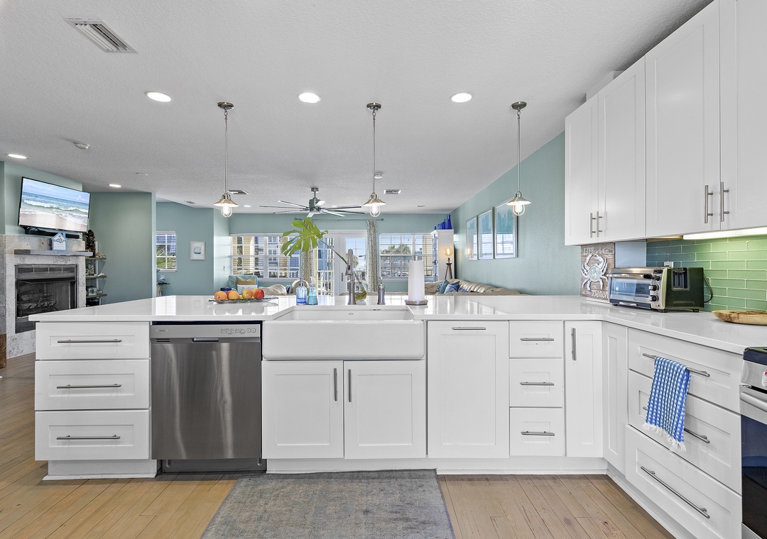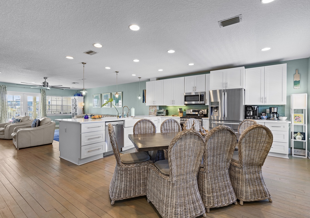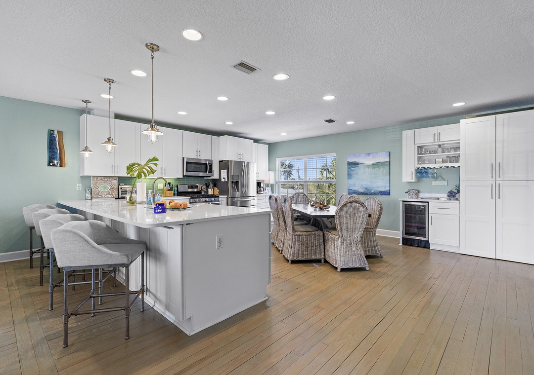 In the evenings, you'll find your group gathered in the main living area on the second floor. This space is tastefully arrayed in soothing blue tones, white accents, and wood flooring. Though restaurants are only a 6-minute walk away, you'll love the option of a home-cooked meal in the kitchen. White cabinetry, stainless steel appliances, a farmhouse sink, and a dry bar make this kitchen deluxe. Everyday essentials such as a drip and Keurig coffee maker, toaster oven, blender, kettle, wine fridge, and more are provided for your use.