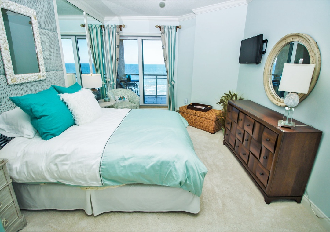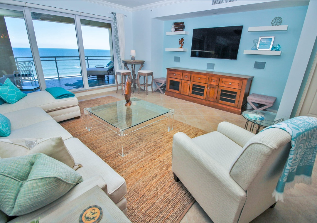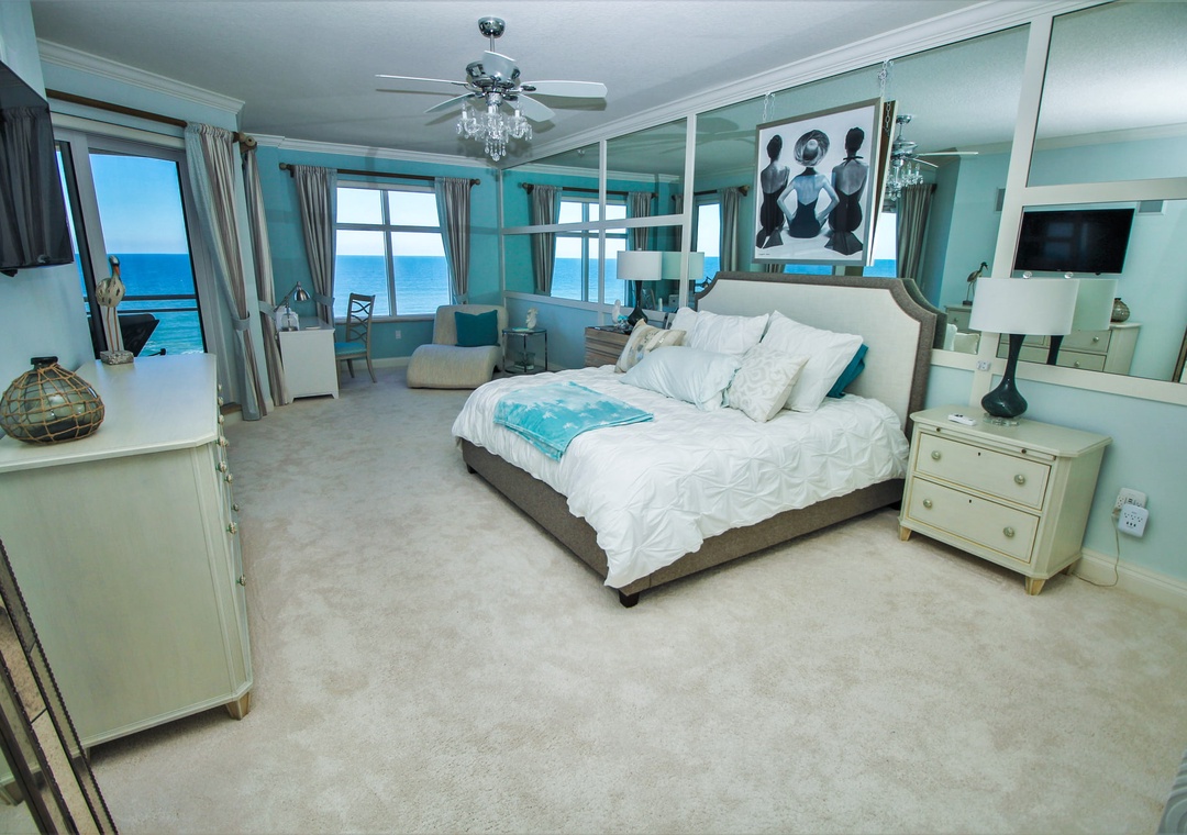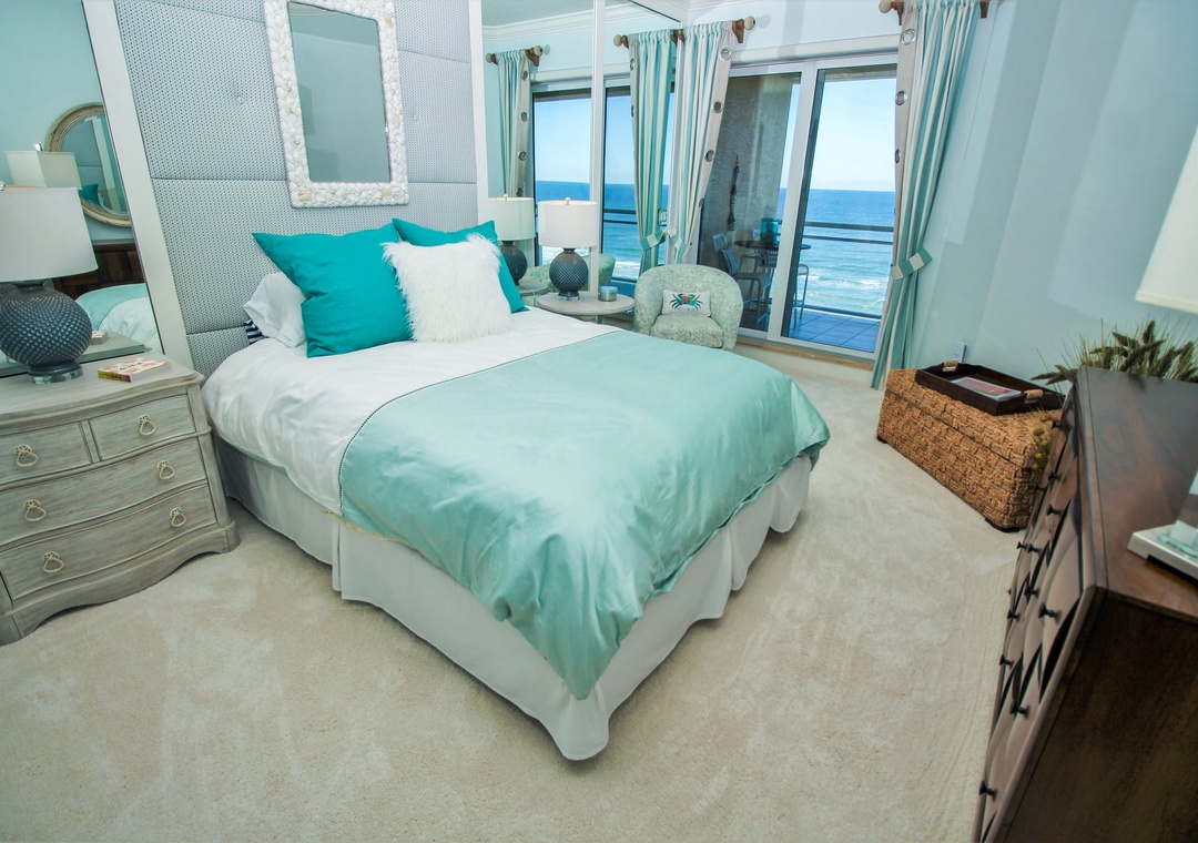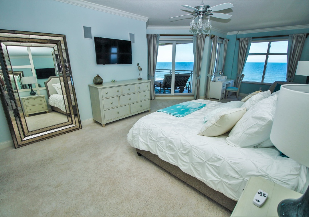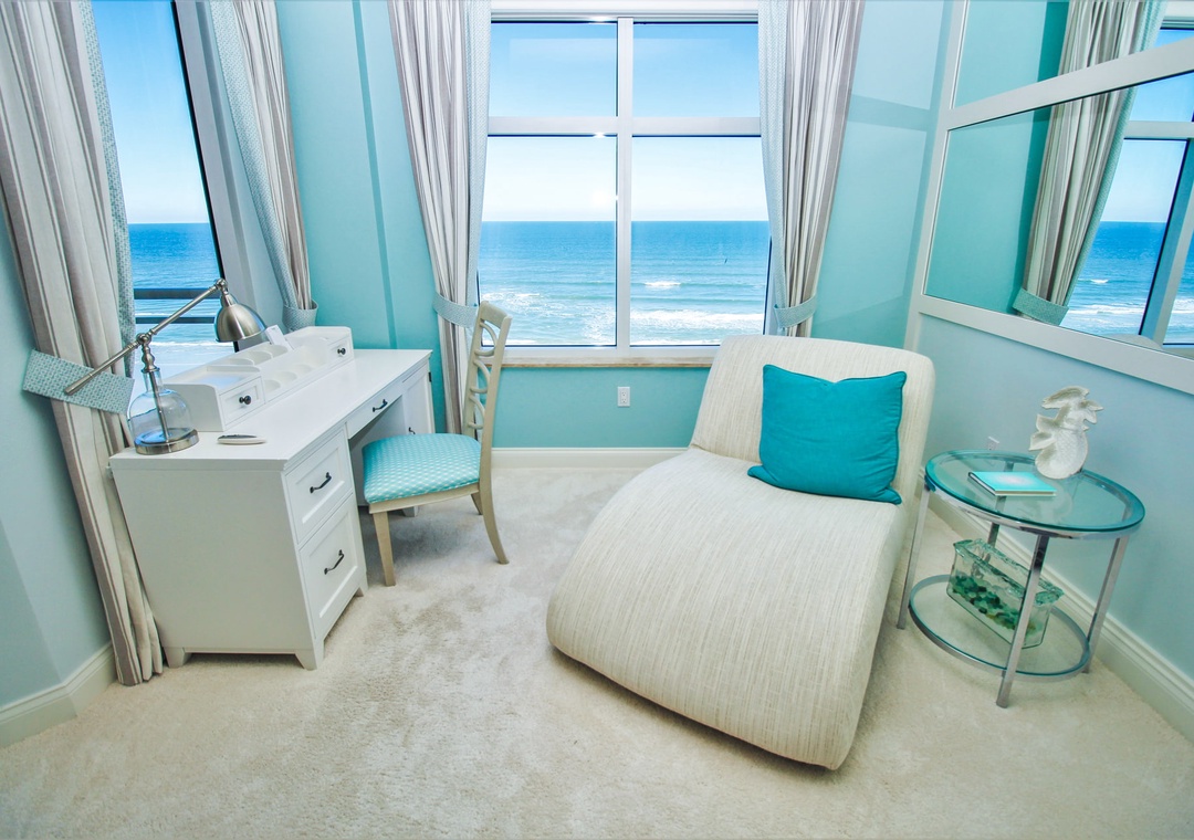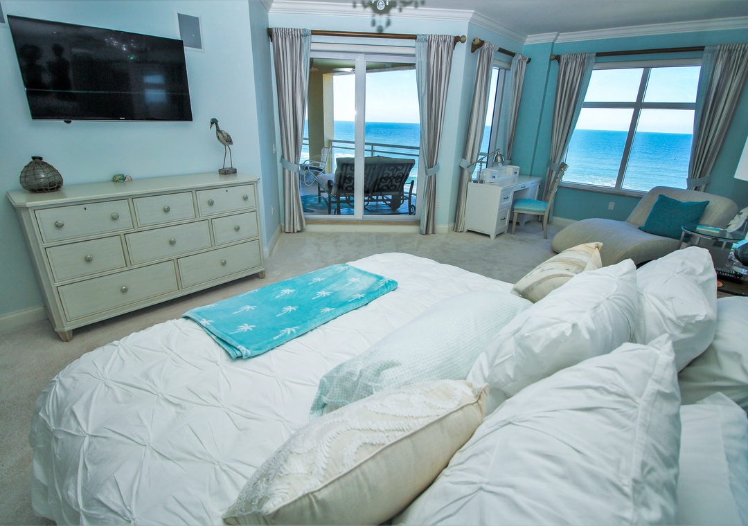 The spacious primary bedroom offers a king bed, ensuite bathroom, and spectacular floor-to-ceiling ocean views that make every morning unforgettable. The guest bedroom features a comfortable double bed, perfect for family or friends. Step out onto your private balcony to take in the sweeping ocean views, or unwind in the stylish living room after a day in the sun. The complex offers direct beach access for residents and guests, and you’re just minutes from local dining, boutique shopping, and the lively charm of Flagler Avenue.