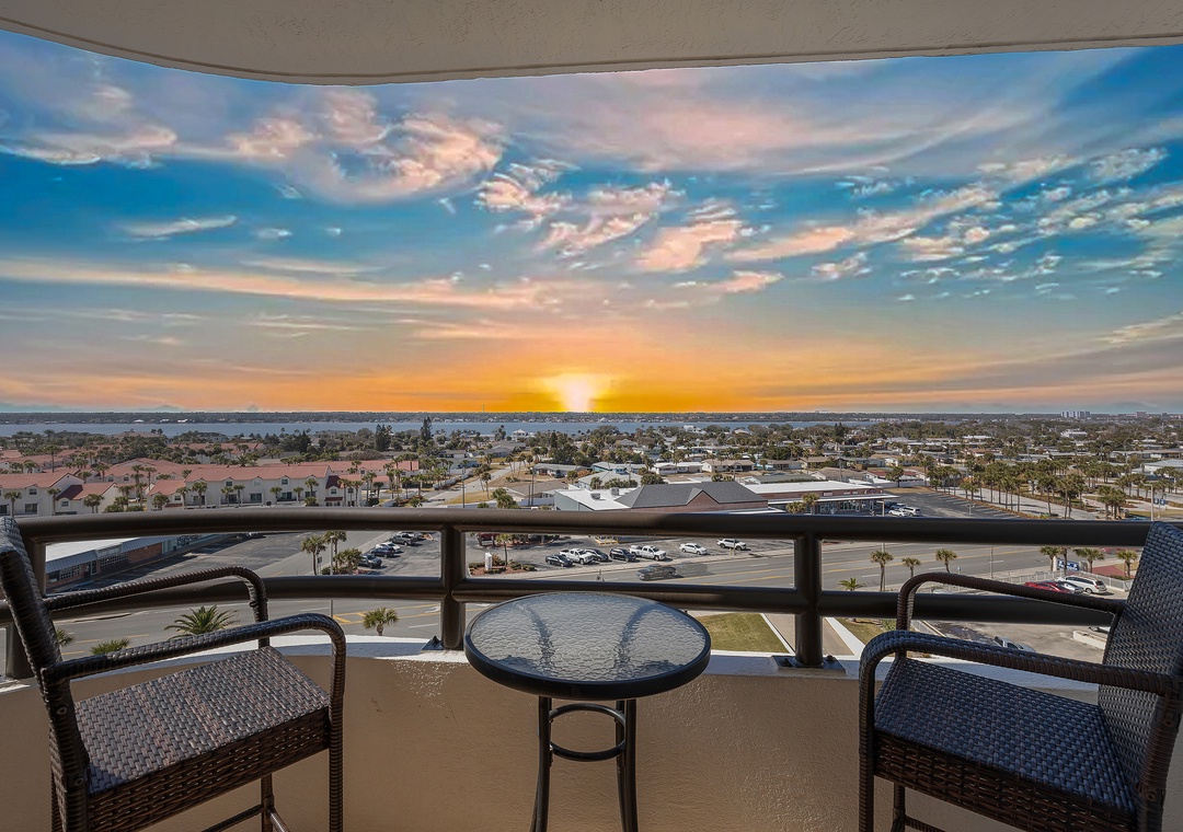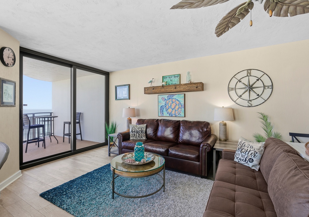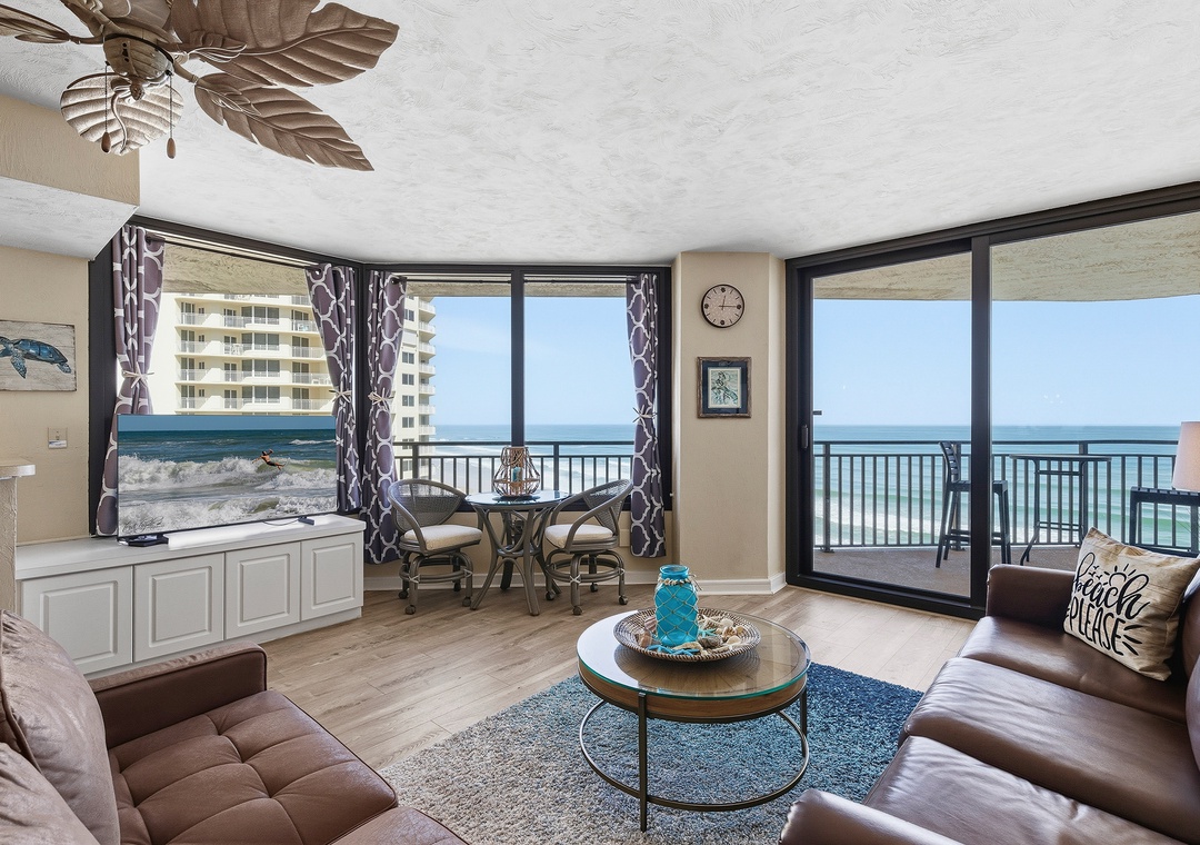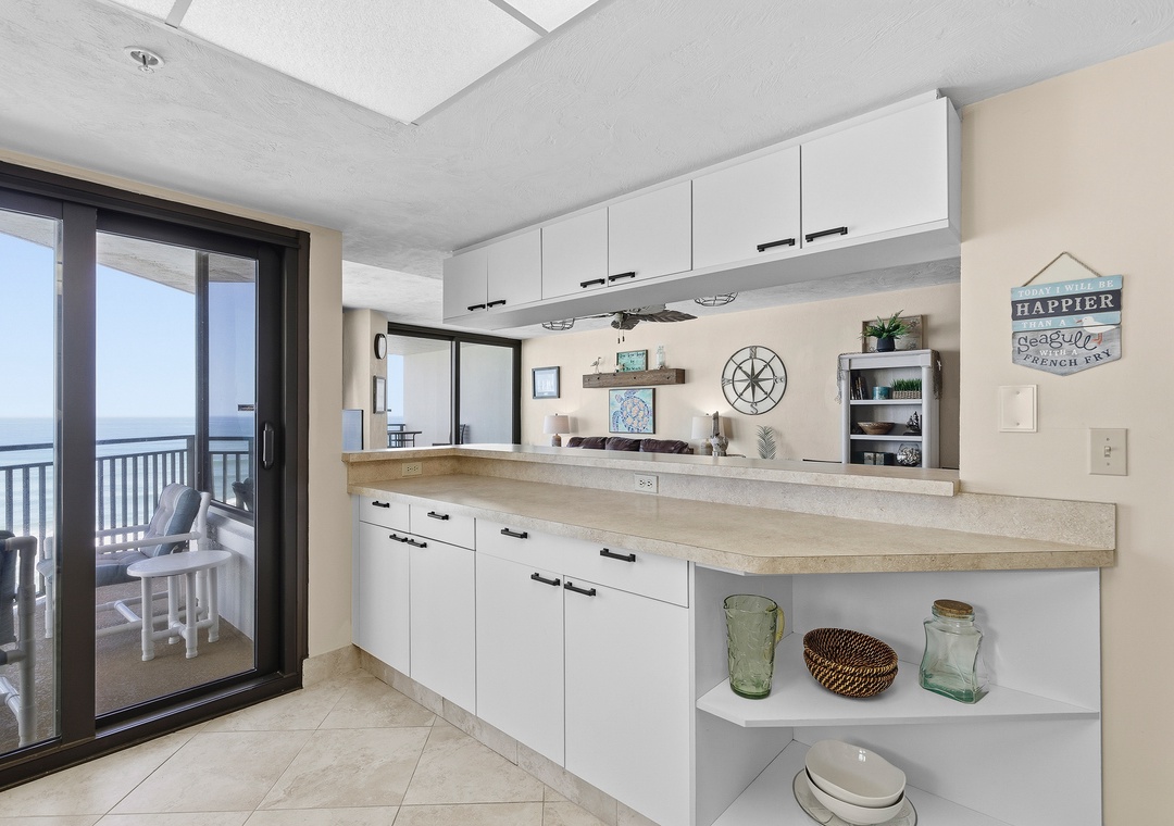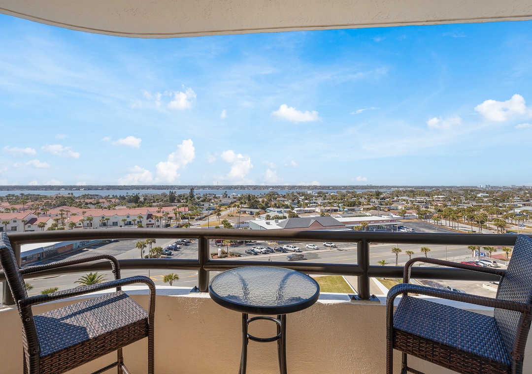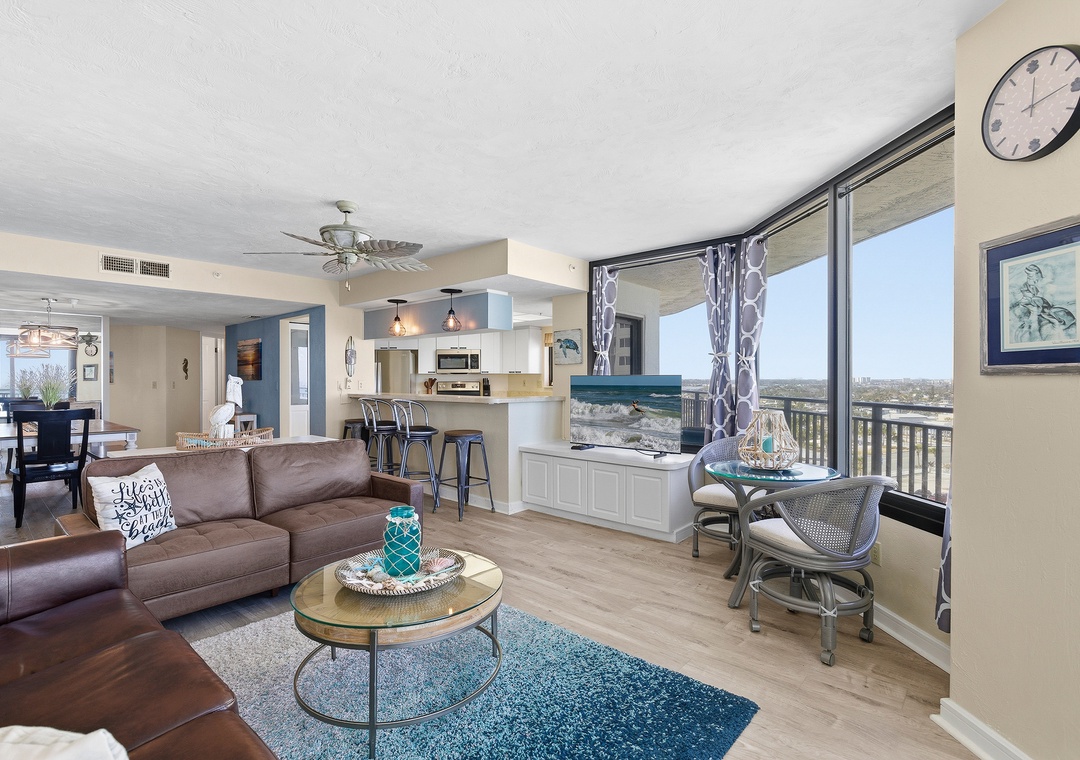 Welcome to Sherwin Condominium 901, an adorable, beachy 2-bedroom, 2-bath condo in beautiful Daytona Beach Shores. Perched on the 9th floor, this bright and airy unit offers breathtaking sunrises over the ocean and stunning sunsets over the Intracoastal, and every room has a view. The living room features two comfortable sofas, including a sleeper sofa, and opens to a large shared balcony with panoramic ocean and Intracoastal views. The dining table seats six with additional bar seating for four, and the kitchen is equipped with stainless steel appliances, a pantry, and direct balcony access for seamless indoor-outdoor living.
