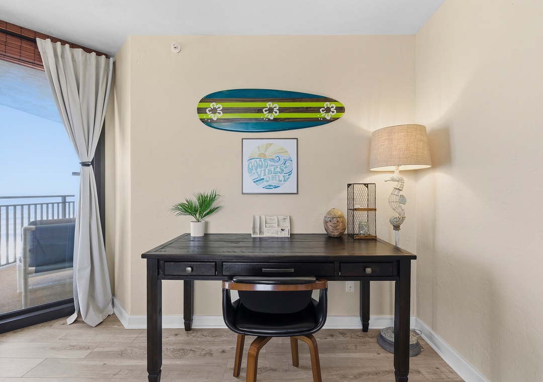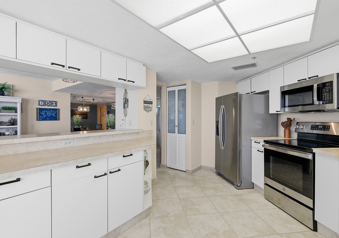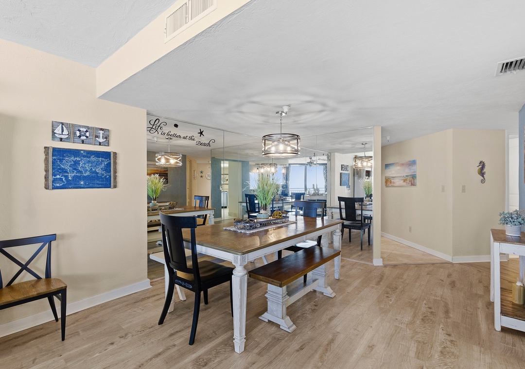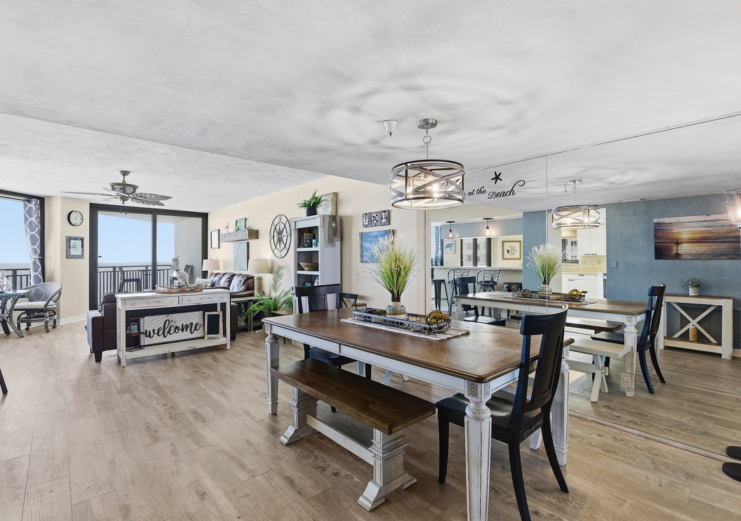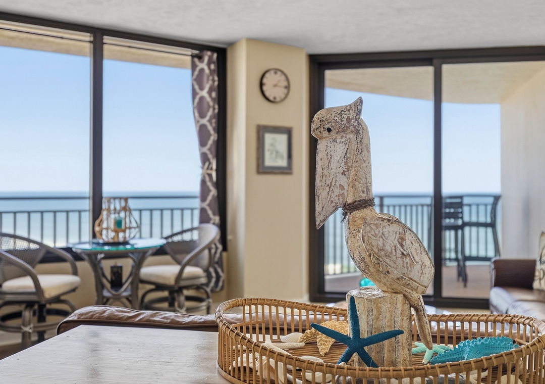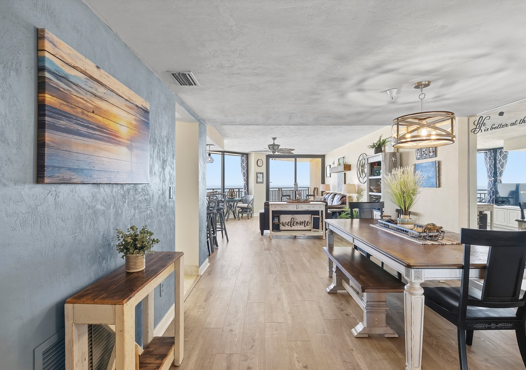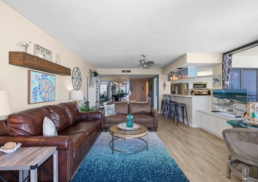 Welcome to Sherwin Condominium 901, an adorable, beachy 2-bedroom, 2-bath condo in beautiful Daytona Beach Shores. Perched on the 9th floor, this bright and airy unit offers breathtaking sunrises over the ocean and stunning sunsets over the Intracoastal, and every room has a view. The living room features two comfortable sofas, including a sleeper sofa, and opens to a large shared balcony with panoramic ocean and Intracoastal views. The dining table seats six with additional bar seating for four, and the kitchen is equipped with stainless steel appliances, a pantry, and direct balcony access for seamless indoor-outdoor living.
