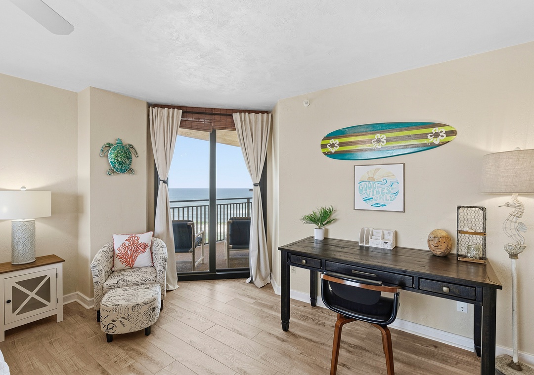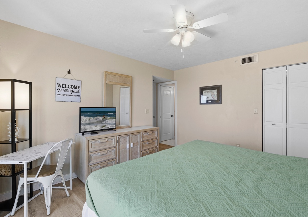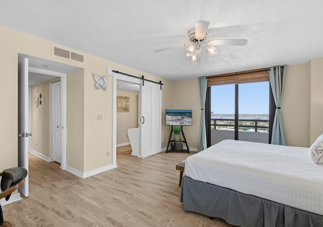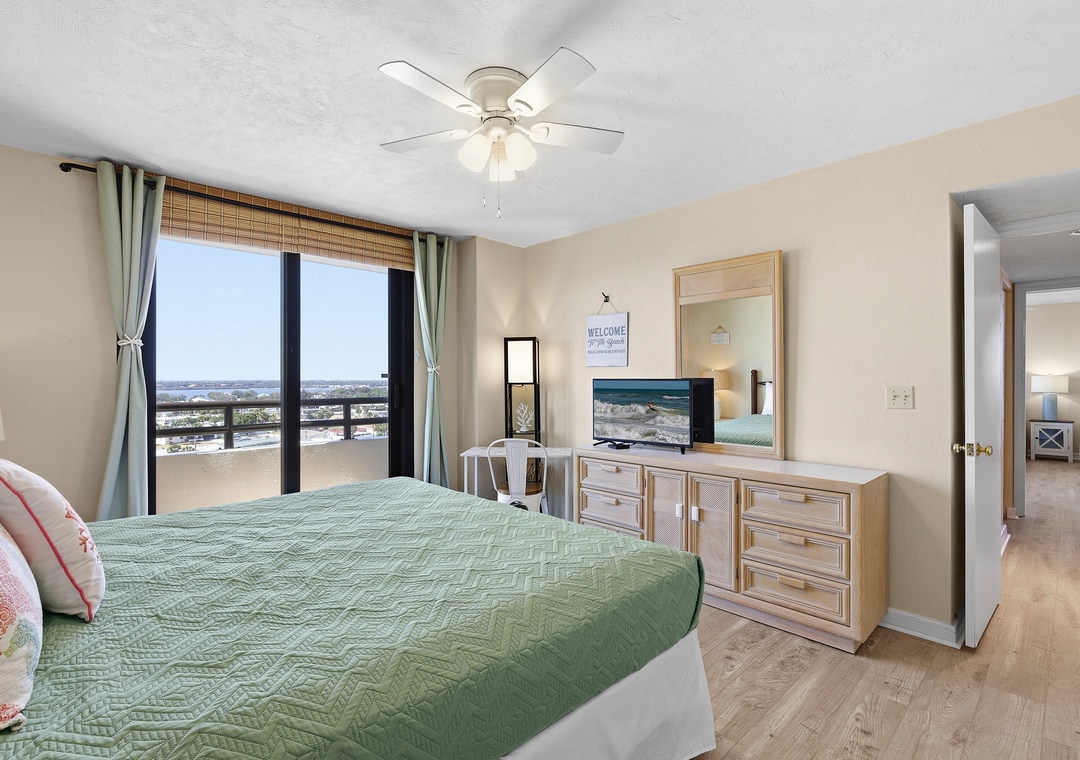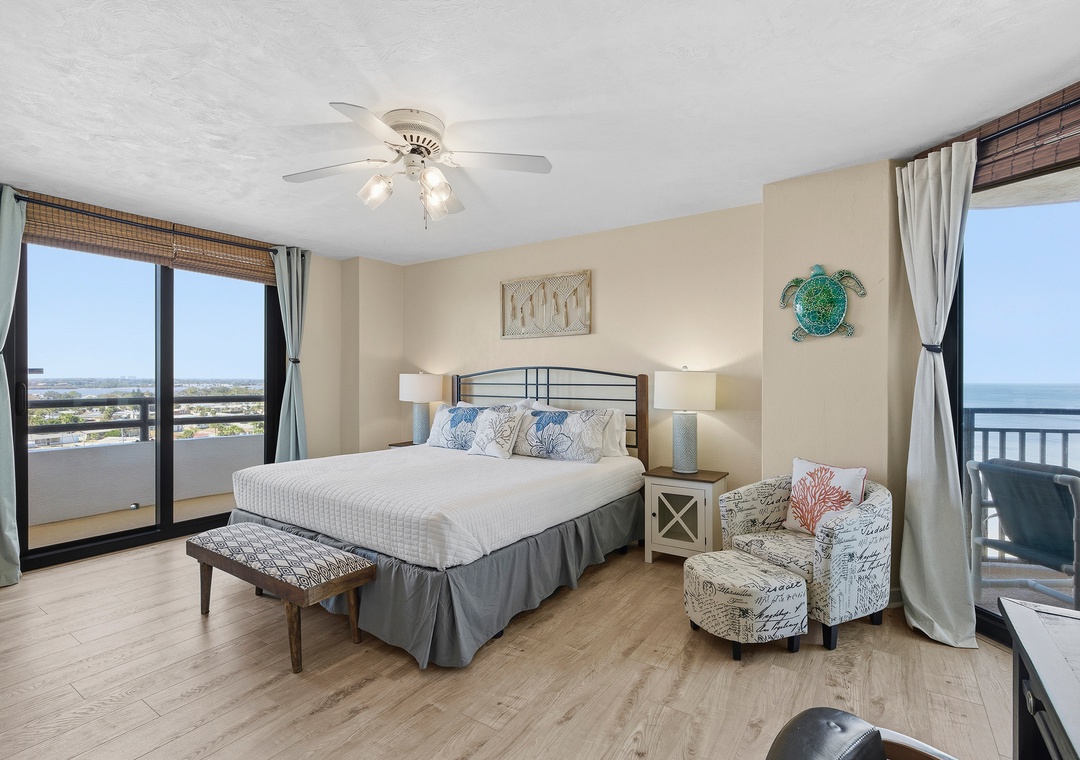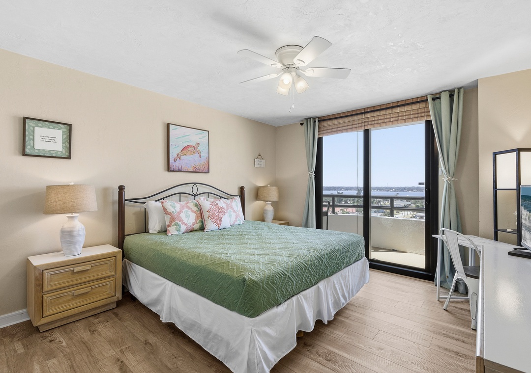 The spacious primary king suite includes balcony access with sweeping views, a second private balcony overlooking the Intracoastal, a desk, a walk-in closet, a dressing area, and an ensuite bath with dual vanities and a tub/shower combination. The guest bedroom also features a king bed, a private Intracoastal-view balcony, a walk-in closet, and a nearby full bath with a shower. With underground garage parking, a full laundry room, beach gear, and multiple balcony spaces, this condo is the perfect coastal escape — ideally located to enjoy Valentine’s Day, Daytona 500 Week, Bike Week, and the Daytona 200 festivities.