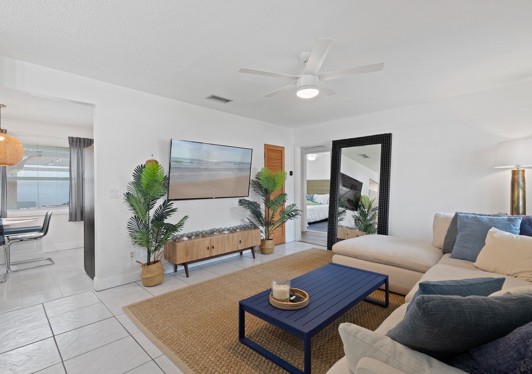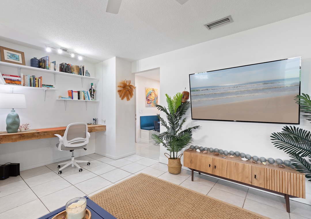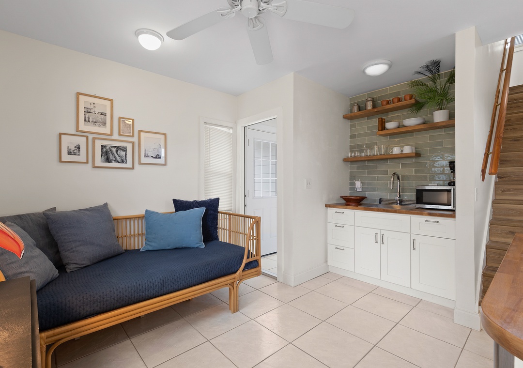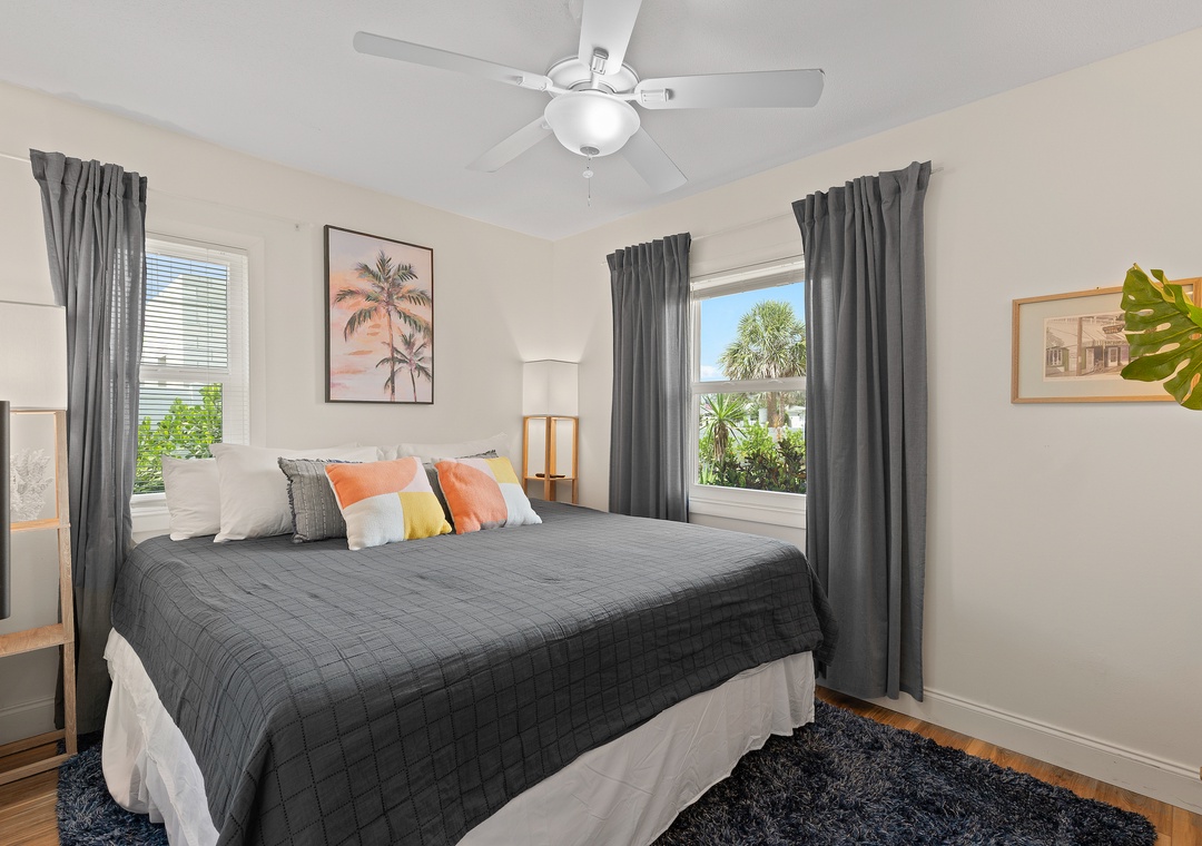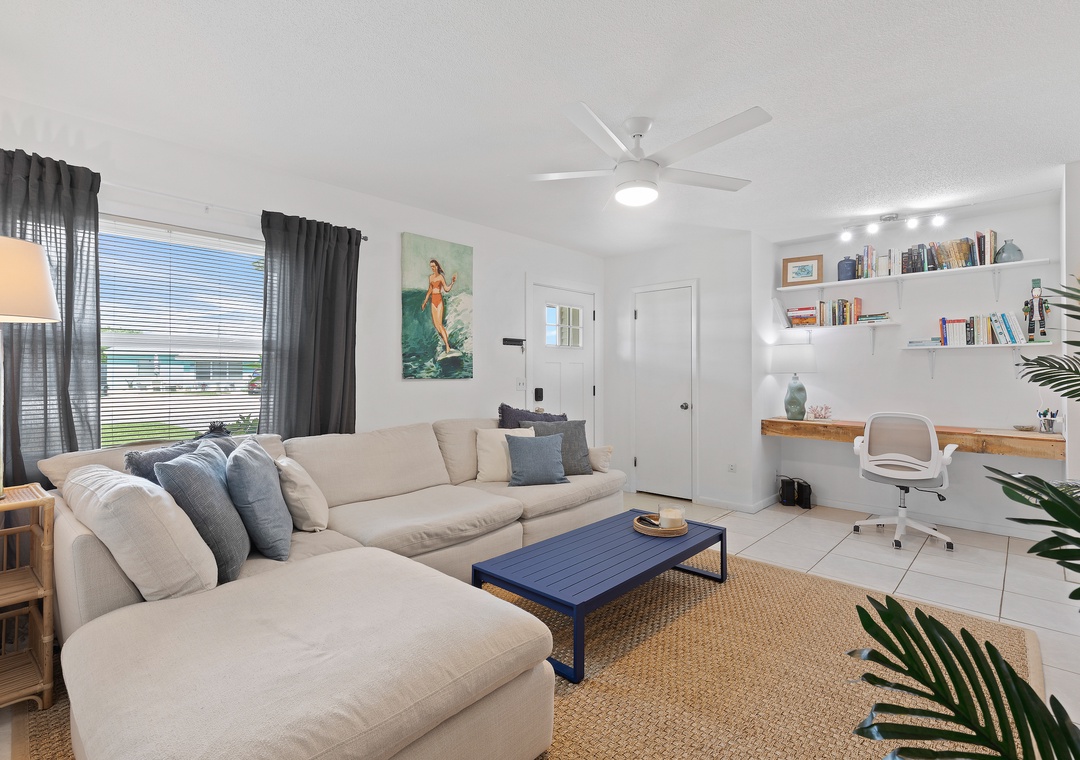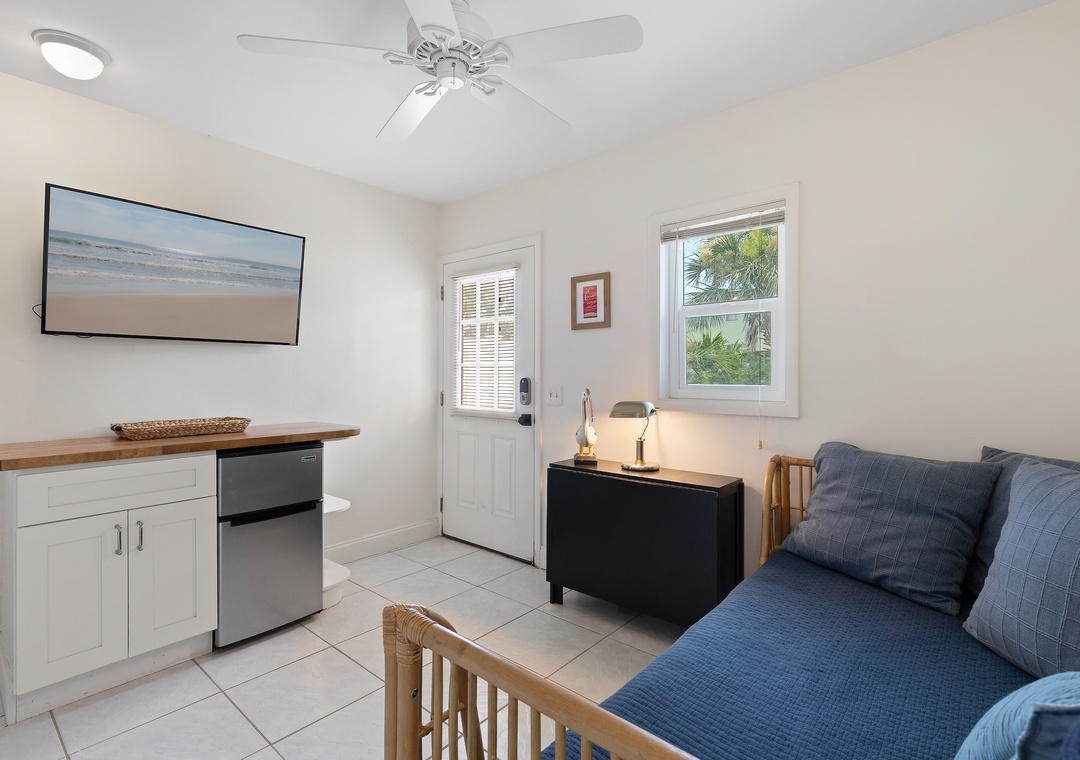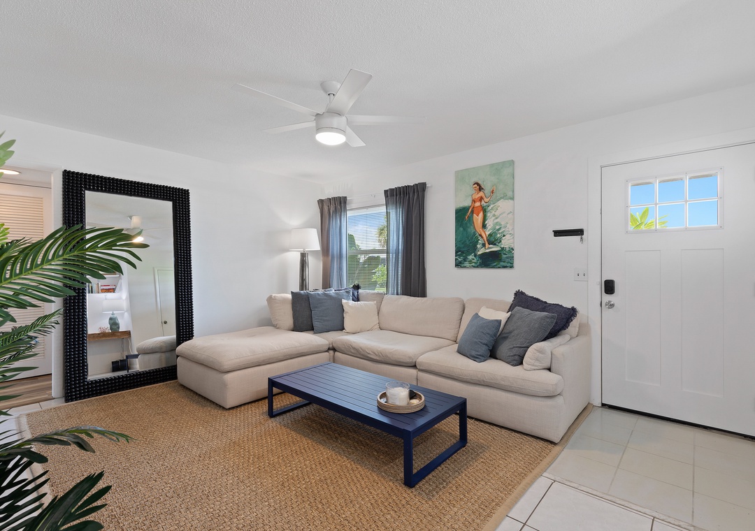 The minute you drive up and park and step out of your car and see the lush grass and step inside the home where everything has a place and is thoughtfully laid out with intention you will instantly relax and settle in. On your right you have the primary king bedroom and queen guest bedroom and shared bathroom. In the family room you have a comfy sectional sofa, huge tv, and built in desk- step through to the eat in kitchen where you have seating for four, -an access hallway leads to the following: garage, (golf cart is parked in garage and is not available for cars) laundry room, outdoor area with pergola, seating for six, hammock, grill, fire pit, large yard, and a door to the separate secondary primary bedroom studio ensuite.