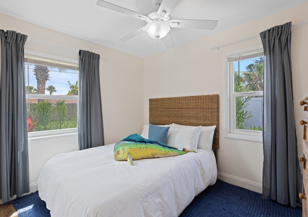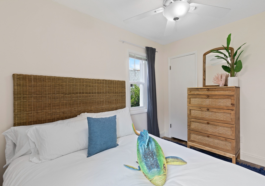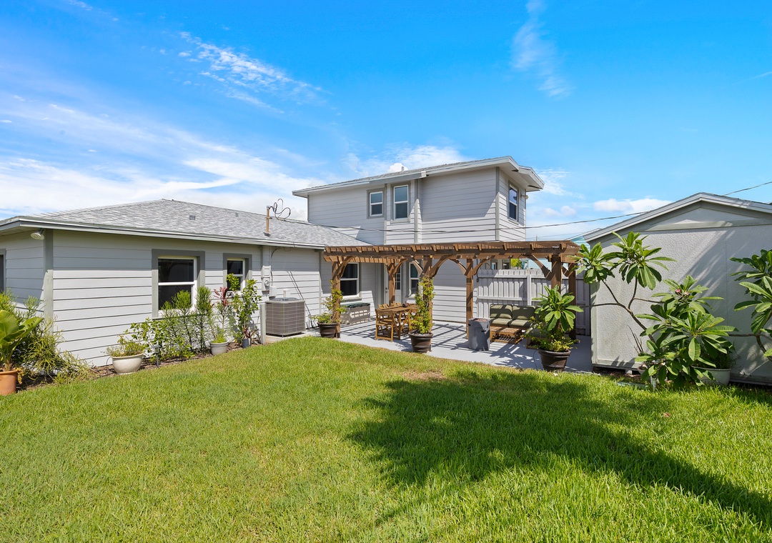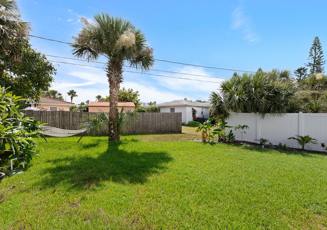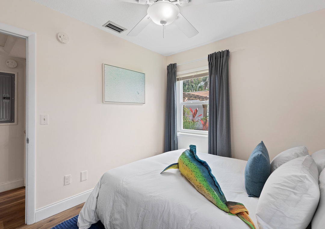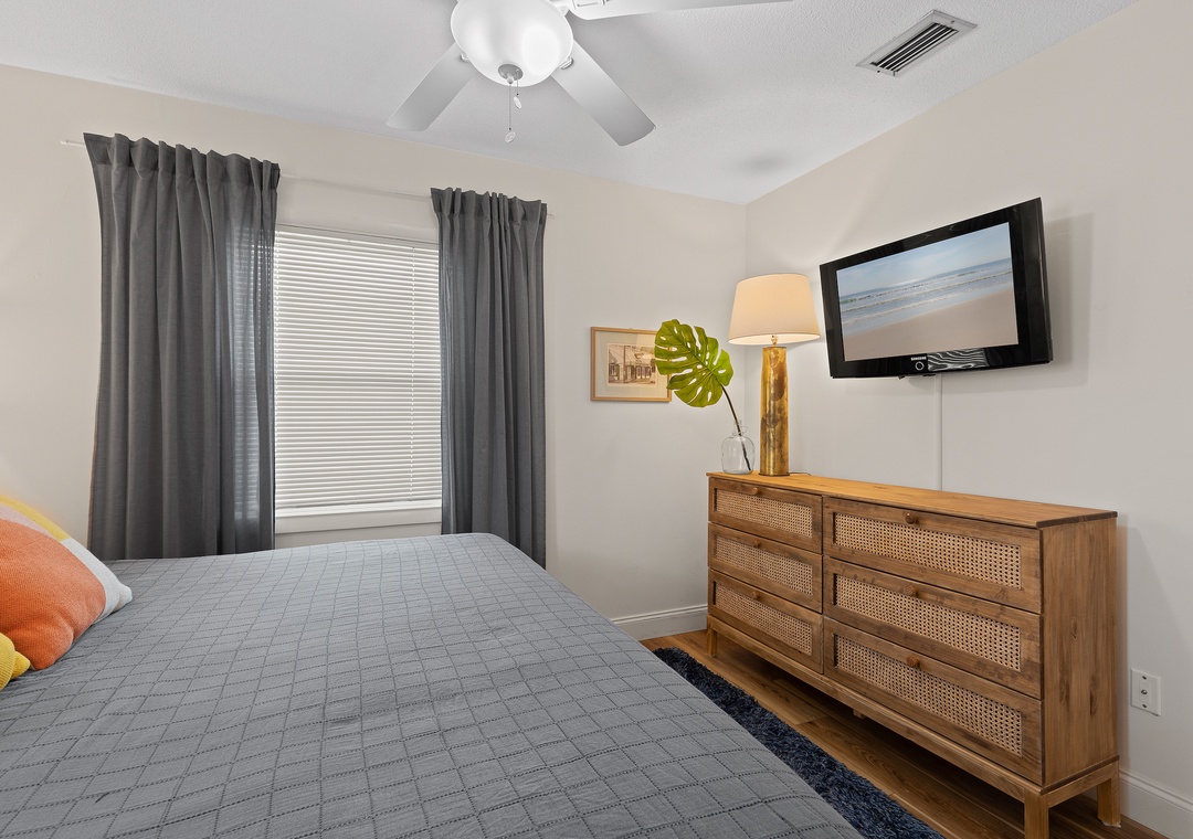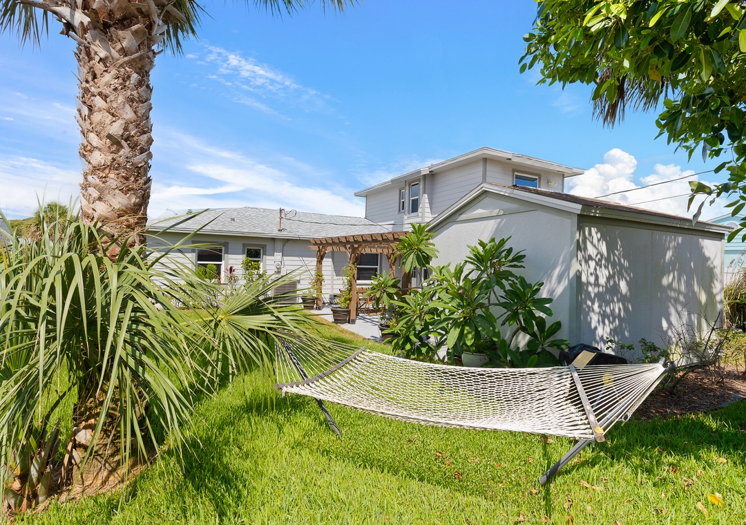 The minute you drive up and park and step out of your car and see the lush grass and step inside the home where everything has a place and is thoughtfully laid out with intention you will instantly relax and settle in. On your right you have the primary king bedroom and queen guest bedroom and shared bathroom. In the family room you have a comfy sectional sofa, huge tv, and built in desk- step through to the eat in kitchen where you have seating for four, -an access hallway leads to the following: garage, (golf cart is parked in garage and is not available for cars) laundry room, outdoor area with pergola, seating for six, hammock, grill, fire pit, large yard, and a door to the separate secondary primary bedroom studio ensuite.
