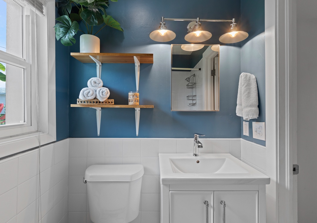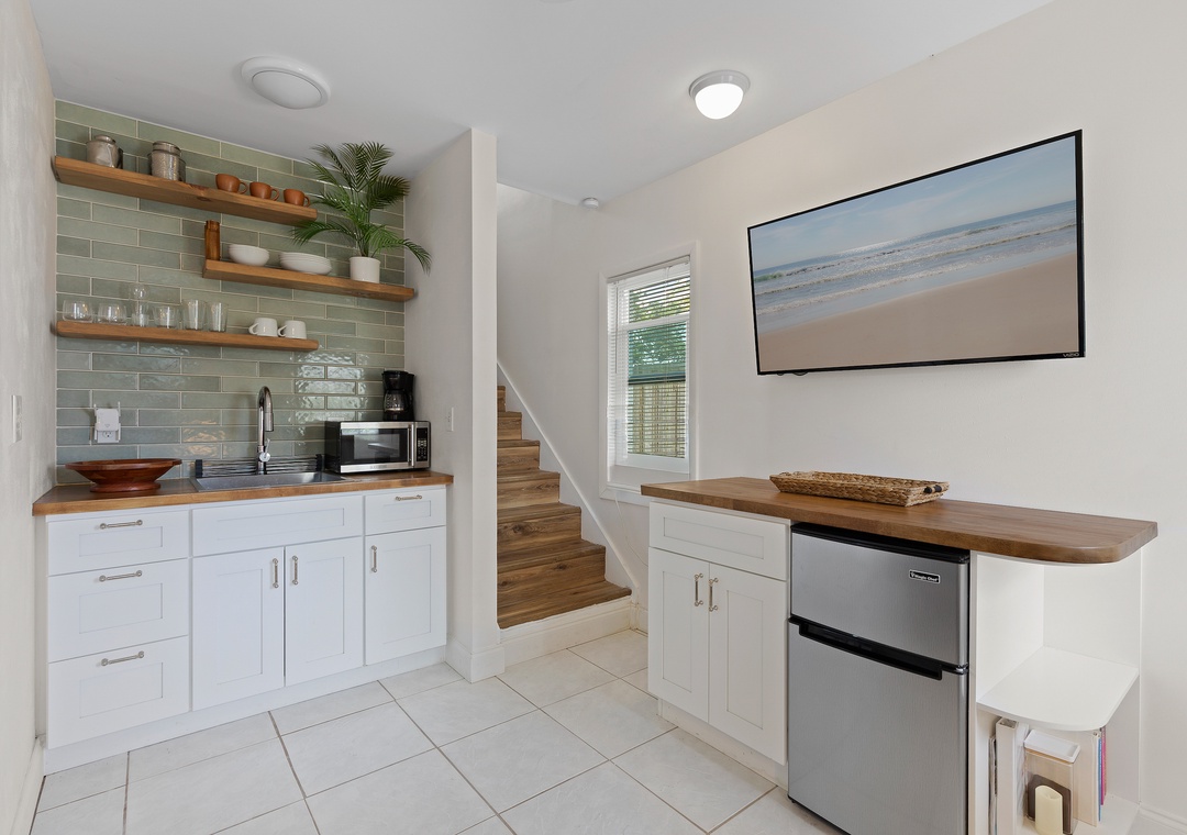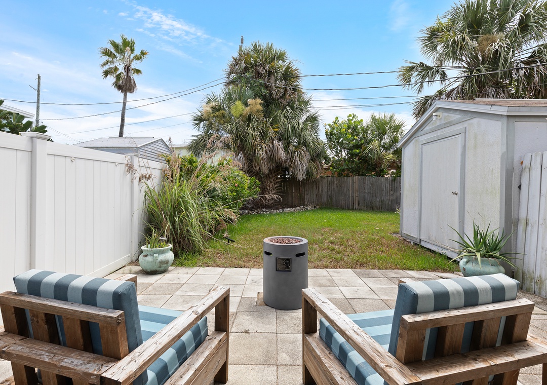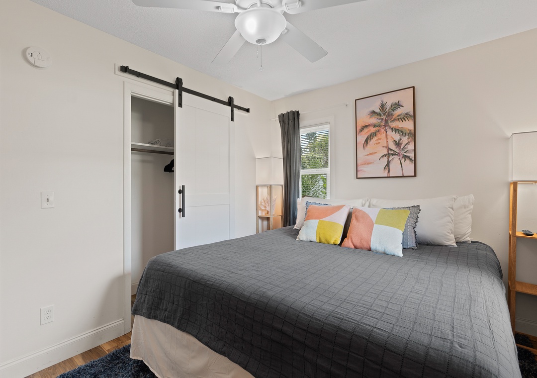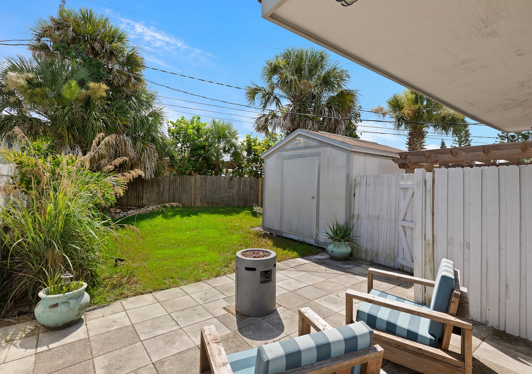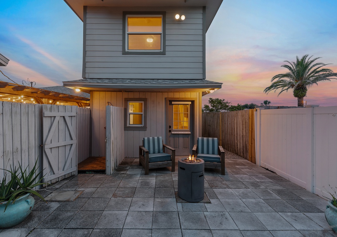 The Separate Secondary Primary Bedroom Ensuite may be accessed through the hallway from the main level of the house and there is also a second private entrance located in the backyard with lighted paved pathway. There is a daybed, mini fridge/freezer, microwave, TV downstairs and King bed, walk in closet, and bathroom upstairs. Private firepit, outdoor seating, patio, shed, and outdoor shower directly outside this back entrance. This space is heated and cooled by two window units total: one on each level.
