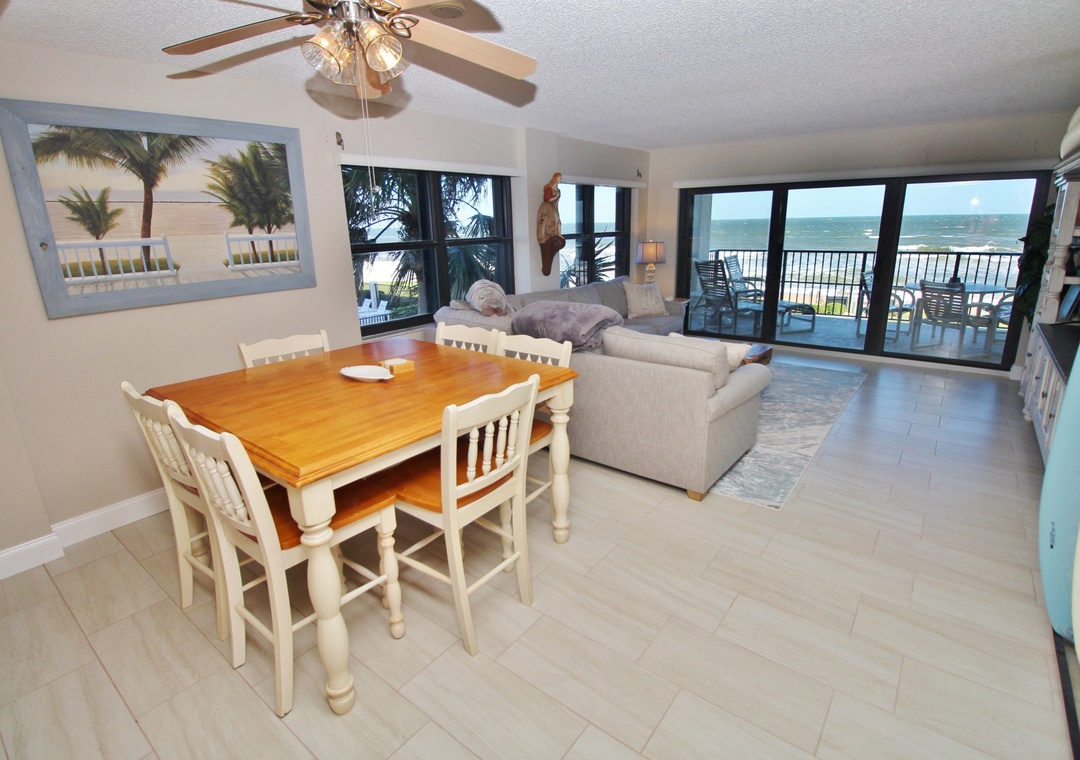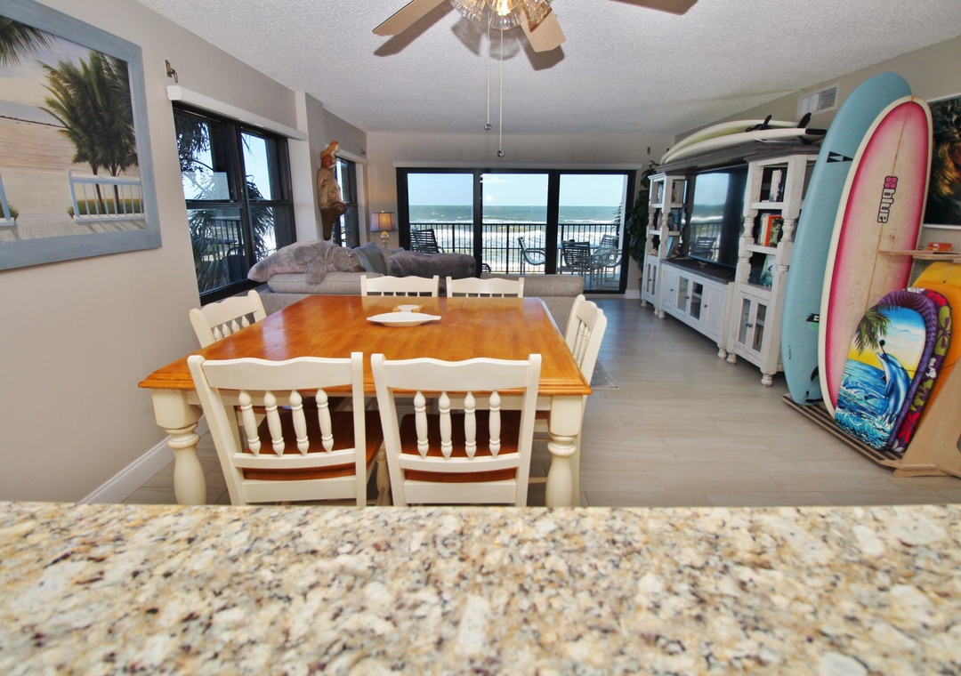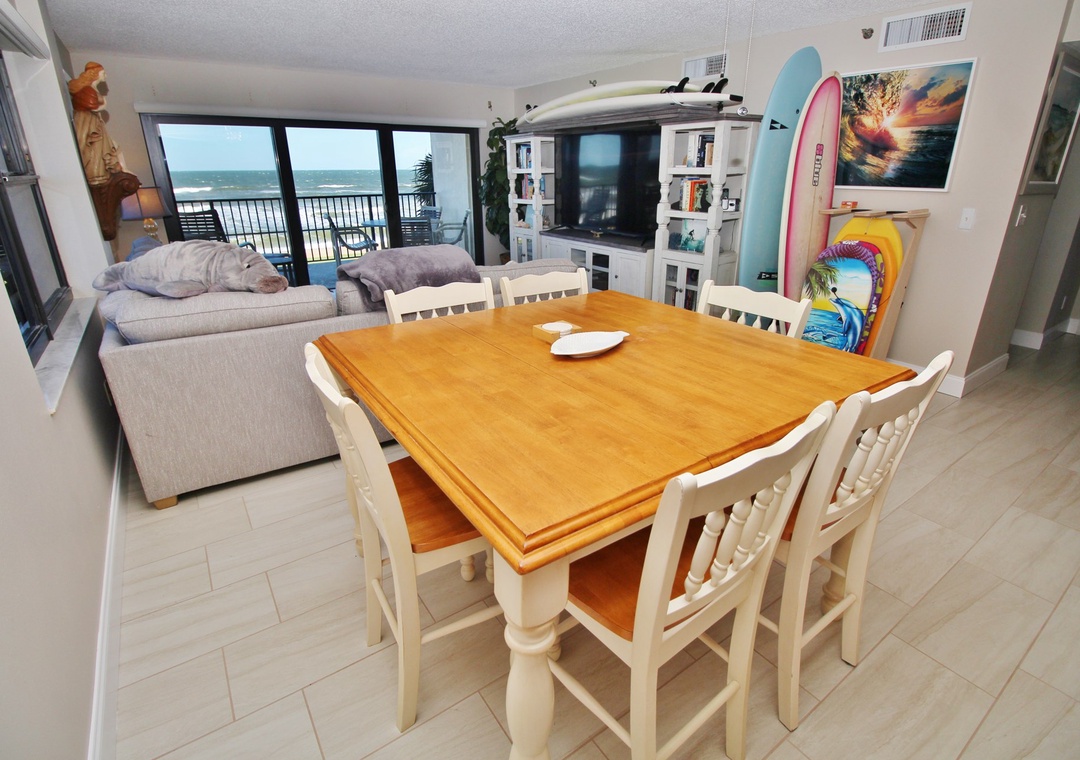 Fuel up for a day of fun with a meal around the dining room table. The table seats six and resides by the breakfast bar lined with four chairs. You won't find dining anywhere else in NSB that has a better view of the crashing waves!