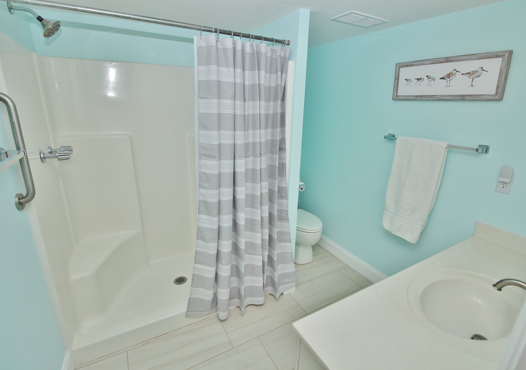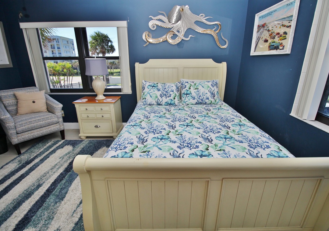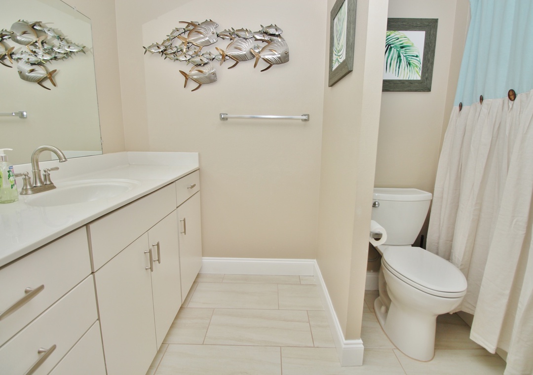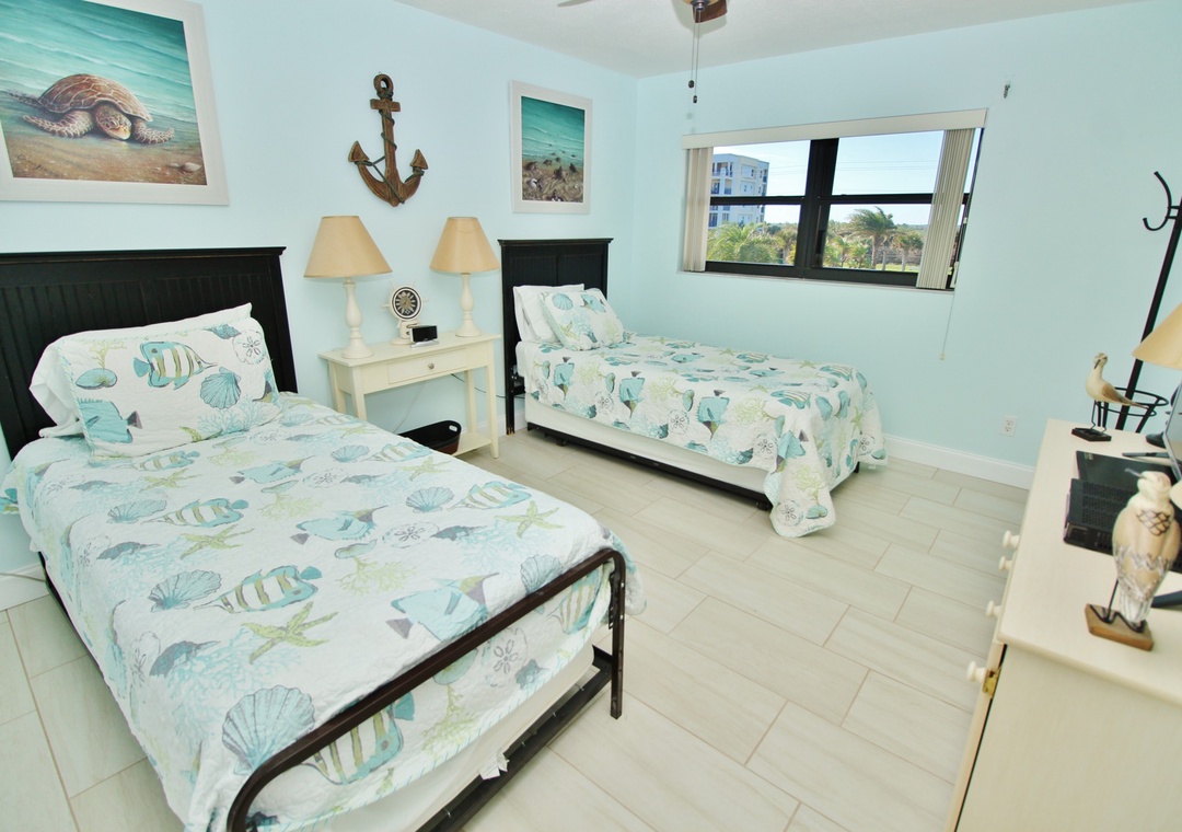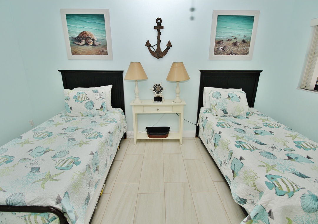 Those staying in the second bedroom will find their stay equally as luxurious. From a coastal, sea theme to a soft king bed to an ocean view window, this bedroom is perfect for up to two guests. The youngest in your group will claim the third bedroom as their own as it holds two twin trundle beds and a Smart TV with a Blu-Ray/DVD player. Nearby are the two guest bathrooms, one with a shower and the other with a standard bathtub.